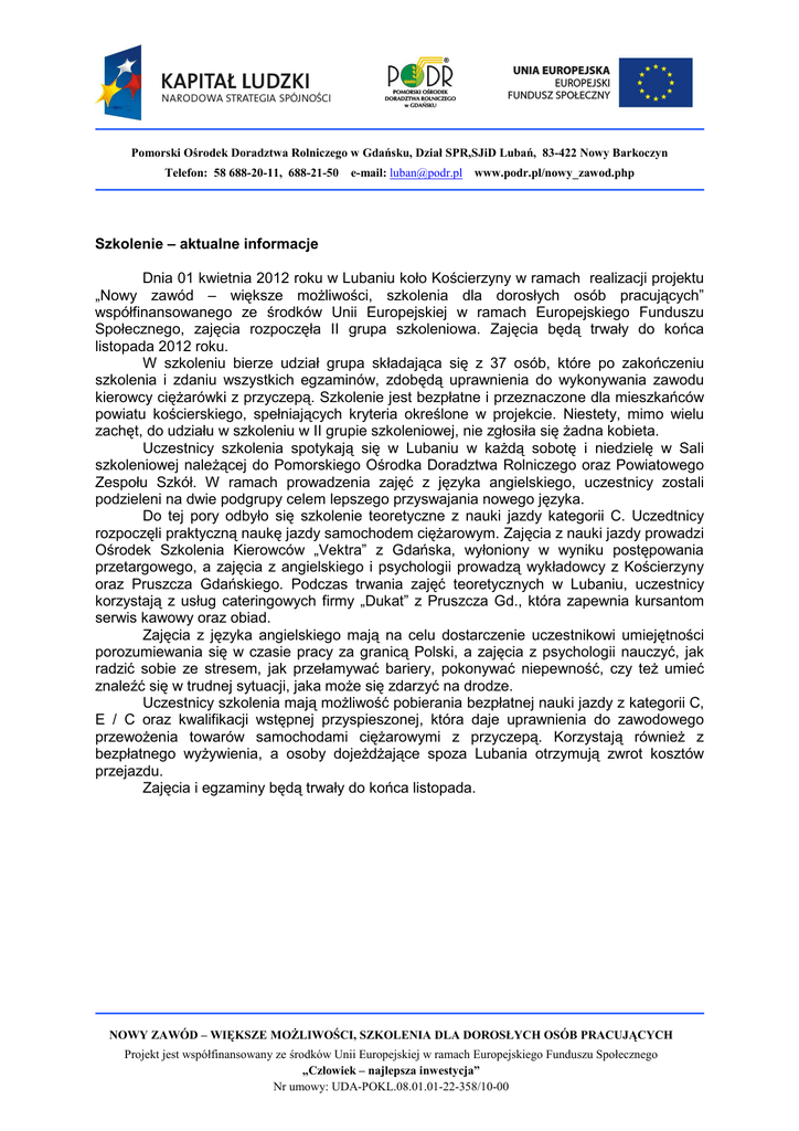 Pomorski Ośrodek Doradztwa Rolniczego w Gdańsku, Dział SPR,SJiD Lubań, 83-422 Nowy Barkoczyn Telefon: 58 688-20-11, 688-21-50 e-mail: [email protected] www.podr.pl/nowy_zawod.php Szkolenie – aktualne informacje Dnia 01 kwietnia 2012 roku w Lubaniu koło Kościerzyny w ramach realizacji projektu „Nowy zawód – większe możliwości, szkolenia dla dorosłych osób pracujących” współfinansowanego ze środków Unii Europejskiej w ramach Europejskiego Funduszu Społecznego, zajęcia rozpoczęła II grupa szkoleniowa. Zajęcia będą trwały do końca listopada 2012 roku. W szkoleniu bierze udział grupa składająca się z 37 osób, które po zakończeniu szkolenia i zdaniu wszystkich egzaminów, zdobędą uprawnienia do wykonywania zawodu kierowcy ciężarówki z przyczepą. Szkolenie jest bezpłatne i przeznaczone dla mieszkańców powiatu kościerskiego, spełniających kryteria określone w projekcie. Niestety, mimo wielu zachęt, do udziału w szkoleniu w II grupie szkoleniowej, nie zgłosiła się żadna kobieta. Uczestnicy szkolenia spotykają się w Lubaniu w każdą sobotę i niedzielę w Sali szkoleniowej należącej do Pomorskiego Ośrodka Doradztwa Rolniczego oraz Powiatowego Zespołu Szkół. W ramach prowadzenia zajęć z języka angielskiego, uczestnicy zostali podzieleni na dwie podgrupy celem lepszego przyswajania nowego języka. Do tej pory odbyło się szkolenie teoretyczne z nauki jazdy kategorii C. Uczedtnicy rozpoczęli praktyczną naukę jazdy samochodem ciężarowym. Zajęcia z nauki jazdy prowadzi Ośrodek Szkolenia Kierowców „Vektra” z Gdańska, wyłoniony w wyniku postępowania przetargowego, a zajęcia z angielskiego i psychologii prowadzą wykładowcy z Kościerzyny oraz Pruszcza Gdańskiego. Podczas trwania zajęć teoretycznych w Lubaniu, uczestnicy korzystają z usług cateringowych firmy „Dukat” z Pruszcza Gd., która zapewnia kursantom serwis kawowy oraz obiad. Zajęcia z języka angielskiego mają na celu dostarczenie uczestnikowi umiejętności porozumiewania się w czasie pracy za granicą Polski, a zajęcia z psychologii nauczyć, jak radzić sobie ze stresem, jak przełamywać bariery, pokonywać niepewność, czy też umieć znaleźć się w trudnej sytuacji, jaka może się zdarzyć na drodze. Uczestnicy szkolenia mają możliwość pobierania bezpłatnej nauki jazdy z kategorii C, E / C oraz kwalifikacji wstępnej przyspieszonej, która daje uprawnienia do zawodowego przewożenia towarów samochodami ciężarowymi z przyczepą. Korzystają również z bezpłatnego wyżywienia, a osoby dojeżdżające spoza Lubania otrzymują zwrot kosztów przejazdu. Zajęcia i egzaminy będą trwały do końca listopada. NOWY ZAWÓD – WIĘKSZE MOŻLIWOŚCI, SZKOLENIA DLA DOROSŁYCH OSÓB PRACUJĄCYCH Projekt jest współfinansowany ze środków Unii Europejskiej w ramach Europejskiego Funduszu Społecznego „Człowiek – najlepsza inwestycja” Nr umowy: UDA-POKL.08.01.01-22-358/10-00