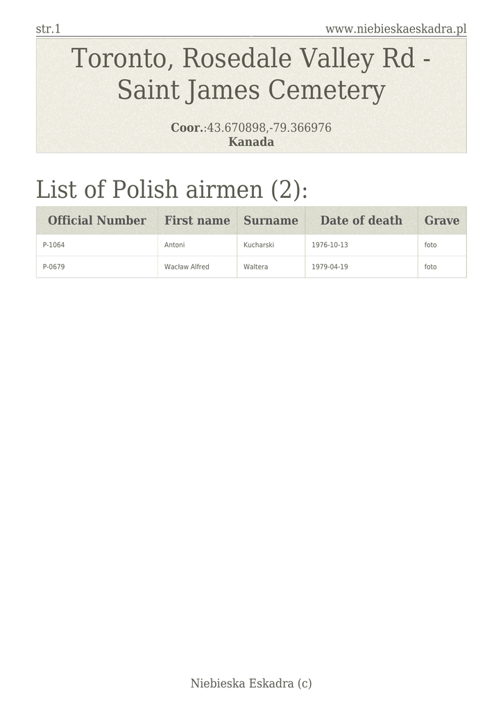 str.1 www.niebieskaeskadra.pl Toronto, Rosedale Valley Rd Saint James Cemetery Coor.:43.670898,-79.366976 Kanada List of Polish airmen (2): Official Number First name Surname Date of death P-1064 Antoni Kucharski 1976-10-13 foto P-0679 Wacław Alfred Waltera 1979-04-19 foto Niebieska Eskadra (c) Grave