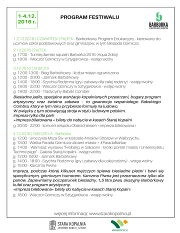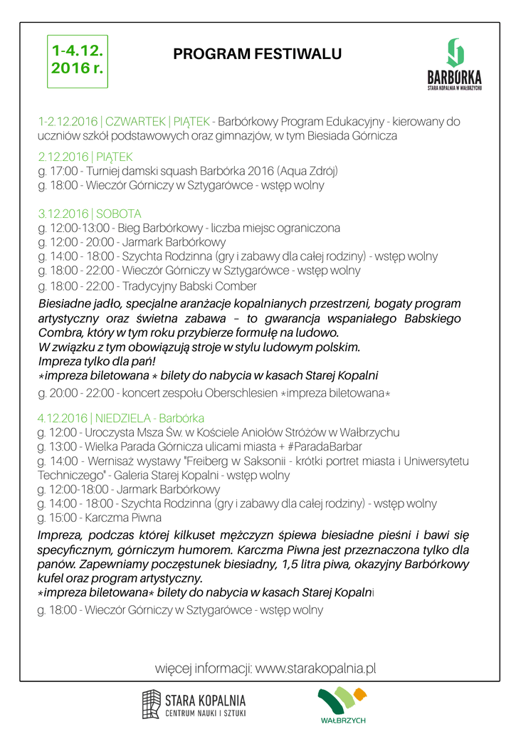 1-4.12. 2016 r. PROGRAM FESTIWALU 1-2.12.2016 | CZWARTEK | PIĄTEK - Barbórkowy Program Edukacyjny - kierowany do uczniów szkół podstawowych oraz gimnazjów, w tym Biesiada Górnicza 2.12.2016 | PIĄTEK g. 17:00 - Turniej damski squash Barbórka 2016 (Aqua Zdrój) g. 18:00 - Wieczór Górniczy w Sztygarówce - wstęp wolny 3.12.2016 | SOBOTA g. 12:00-13:00 - Bieg Barbórkowy - liczba miejsc ograniczona g. 12:00 - 20:00 - Jarmark Barbórkowy g. 14:00 - 18:00 - Szychta Rodzinna (gry i zabawy dla całej rodziny) - wstęp wolny g. 18:00 - 22:00 - Wieczór Górniczy w Sztygarówce - wstęp wolny g. 18:00 - 22:00 - Tradycyjny Babski Comber Biesiadne jadło, specjalne aranżacje kopalnianych przestrzeni, bogaty program artystyczny oraz świetna zabawa – to gwarancja wspaniałego Babskiego Combra, który w tym roku przybierze formułę na ludowo. W związku z tym obowiązują stroje w stylu ludowym polskim. Impreza tylko dla pań! *impreza biletowana * bilety do nabycia w kasach Starej Kopalni g. 20:00 - 22:00 - koncert zespołu Oberschlesien *impreza biletowana* 4.12.2016 | NIEDZIELA - Barbórka g. 12:00 - Uroczysta Msza Św. w Kościele Aniołów Stróżów w Wałbrzychu g. 13:00 - Wielka Parada Górnicza ulicami miasta + #ParadaBarbar g. 14:00 - Wernisaż wystawy "Freiberg w Saksonii - krótki portret miasta i Uniwersytetu Techniczego" - Galeria Starej Kopalni - wstęp wolny g. 12:00-18:00 - Jarmark Barbórkowy g. 14:00 - 18:00 - Szychta Rodzinna (gry i zabawy dla całej rodziny) - wstęp wolny g. 15:00 - Karczma Piwna Impreza, podczas której kilkuset mężczyzn śpiewa biesiadne pieśni i bawi się specyficznym, górniczym humorem. Karczma Piwna jest przeznaczona tylko dla panów. Zapewniamy poczęstunek biesiadny, 1,5 litra piwa, okazyjny Barbórkowy kufel oraz program artystyczny. *impreza biletowana* bilety do nabycia w kasach Starej Kopalni g. 18:00 - Wieczór Górniczy w Sztygarówce - wstęp wolny więcej informacji: www.starakopalnia.pl