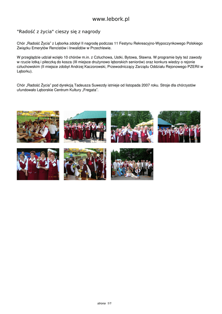 www.lebork.pl "Radość z życia" cieszy się z nagrody Chór „Radość Życia” z Lęborka zdobył II nagrodę podczas 11 Festynu Rekreacyjno-Wypoczynkowego Polskiego Związku Emerytów Rencistów i Inwalidów w Przechlewie. W przeglądzie udział wzięło 10 chórów m.in. z Człuchowa, Ustki, Bytowa, Sławna. W programie były też zawody w rzucie lotką i piłeczką do kosza (III miejsce drużynowo lęborskich seniorów) oraz konkurs wiedzy o rejonie człuchowskim (II miejsce zdobył Andrzej Kaczorowski, Przewodniczący Zarządu Oddziału Rejonowego PZERiI w Lęborku). Chór „Radość Życia” pod dyrekcją Tadeusza Suwezdy istnieje od listopada 2007 roku. Stroje dla chórzystów ufundowało Lęborskie Centrum Kultury „Fregata”. strona 1/1 Powered by TCPDF (www.tcpdf.org)