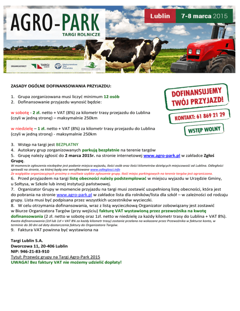 ZASADY OGÓLNE DOFINANSOWANIA PRZYJAZDU: 1. Grupa zorganizowana musi liczyć minimum 12 osób 2. Dofinansowanie przyjazdu wynosić będzie: w sobotę - 2 zł. netto + VAT (8%) za kilometr trasy przejazdu do Lublina (czyli w jedną stronę) – maksymalnie 250km w niedzielę – 1 zł. netto + VAT (8%) za kilometr trasy przejazdu do Lublina (czyli w jedną stronę) - maksymalnie 250km 3. Wstęp na targi jest BEZPŁATNY 4. Autokary grup zorganizowanych parkują bezpłatnie na terenie targów 5. Grupę należy zgłosić do 2 marca 2015r. na stronie internetowej www.agro-park.pl w zakładce Zgłoś Grupę. W momencie zgłoszenia niezbędne jest podanie miejsca wyjazdu, ilości osób oraz ilości kilometrów dzielących miejscowość od Lublina. Odległości sprawdź na stronie, na której będą one weryfikowane www.odleglosci.info Ze względów organizacyjnych prosimy o możliwie szybkie zgłoszenie grupy. Ilość miejsc parkingowych na terenie targów jest ograniczona. 6. Przed przyjazdem na targi listę obecności należy podstemplować w miejscu wyjazdu w Urzędzie Gminy, u Sołtysa, w Szkole lub innej instytucji państwowej. 7. Organizator Grupy w momencie przyjazdu na targi musi zostawić uzupełnioną listę obecności, która jest do pobrania na stronie www.agro-park.pl w zakładce lista dla rolników/lista dla szkół – w zależności od rodzaju grupy. Lista musi być podpisana przez wszystkich uczestników wycieczki. 8. W celu otrzymania dofinansowania, wraz z listą wycieczkową Organizator zobowiązany jest zostawić w Biurze Organizatora Targów (przy wejściu) fakturę VAT wystawioną przez przewoźnika na kwotę dofinansowania (2 zł. netto w sobotę oraz 1zł. netto w niedzielę za każdy kilometr trasy do Lublina + VAT 8%). Kwota dofinansowania (2zł lub 1zł + VAT 8% za każdy kilometr trasy) zostanie przelana na wskazane przez Przewoźnika w fakturze konto, w terminie do 30 dni od daty dostarczenia faktury do Organizatora Targów. 9. Faktura VAT powinna być wystawiona na Targi Lublin S.A. Dworcowa 11, 20-406 Lublin NIP: 946-21-83-910 Tytuł: Przewóz grupy na Targi Agro-Park 2015 UWAGA! Bez faktury VAT nie możemy udzielić dopłaty!