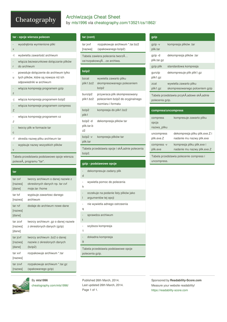 Archiwizacja Cheat Sheet by mts1996 via cheatography.com/13521/cs/1862/ tar - opcje wiersza polecen tar (cont) - tar jxvf rozpakowuje archiwum *.tar.bz2 gzip -v [nazwa] (spakowanego bzip2) plik.tar wyodrębnia wymienione pliki x -t wyświetla zawartość archiwum - włącza bezwarunkowe dołączanie plików r do archiwum gzip Tabela zawiera polecenia tworzÄ… ce/rozpakowujÄ…ce archiwa. gzip -d kompresja plików .tar dekompresja plików .tar plik.tar.gz gzip plik standardowa kompresja gunzip dekompresuje plik plik1.gz - powoduje dołączenie do archiwum tylko bzip2 u tych plików, które są nowsze niż ich bzcat wywietla zawarto pliku plik1.gz plik1.bz2 skompresowanego poleceniem zcat wywietla zawarto pliku bzip2 plik1.gz skompresowanego polceniem gzip bunzip2 przywraca plik skompresowany plik1.bz2 poleceniem bzip2 do oryginalnego Tabela przedstawia przykÅ‚adowe skÅ‚adnie odpowiedniki w archiwum - włącza kompresję programem gzip z -j włącza kompresję programem bzip2 - włącza kompresje programem compress bzip2 Z - włącza kompresję programem xz tworzy plik w formacie tar c -f określa nazwę pliku archiwum tar - wypisuje nazwy wszystkich plików v Tabela przedstawia podstawowe opcje wiersza poleceÅ„ programu "tar". tar cvf tworzy archiwum o danej nazwie z [nazwa] okreslonych danych np. tar cvf [dane] moje.tar /home tar tvf wypisuje zawartosc danego [nazwa] archiwum tar rvf dodaje do archiwum nowe dane [nazwa] bzip2 -v tar zcvf tworzy archiwum .gz o danej nazwie [nazwa] z okreslonych danych (gzip) compress/uncompress compress kompresuje zawarto pliku opcja kompresja plików tar plik.tar Tabela przedstawia opcje i skÅ‚adnie polecenia bzip2. gzip - podstawowe opcje uncompress dekompresja pliku plik.exe.Z i plik.exe.Z nadanie mu nazwy plik.exe compress -v kompresja pliku plik.exe i plik.exe nadanie mu nazwy plik.exe.Z Tabela przedstawia polecenie compress i uncompress. dekompresuje zadany plik d - wywietla pomoc do polecenia h - oczekuje na podanie listy plików jako l argumentów tej opcji - nie wywietla adnego ostrzeenia q sprawdza archiwum t - szybsza kompresja 1 [dane] tworzy archiwum .bz2 o danej - [nazwa] nazwie z okreslonych danych 9 [dane] (bzip2) tar xvf rozpakowuje archiwum *.tar tar jcvf polecenia gzip. nazwa_pliku z2 - [dane] dekompresja plików tar plik.tar.b - tar kompresja do plik1.bz2 plik1 bzip2 -d J - rozmiaru i formatu dokadna kompresja Tabela przedstawia podstawowe opcje polecenia gzip. [nazwa] tar zxvf rozpakowuje archiwum *.tar.gz [nazwa] (spakowanego gzip) By mts1996 Published 26th March, 2014. Sponsored by Readability-Score.com cheatography.com/mts1996/ Last updated 26th March, 2014. Measure your website readability! Page 1 of 1. https://readability-score.com