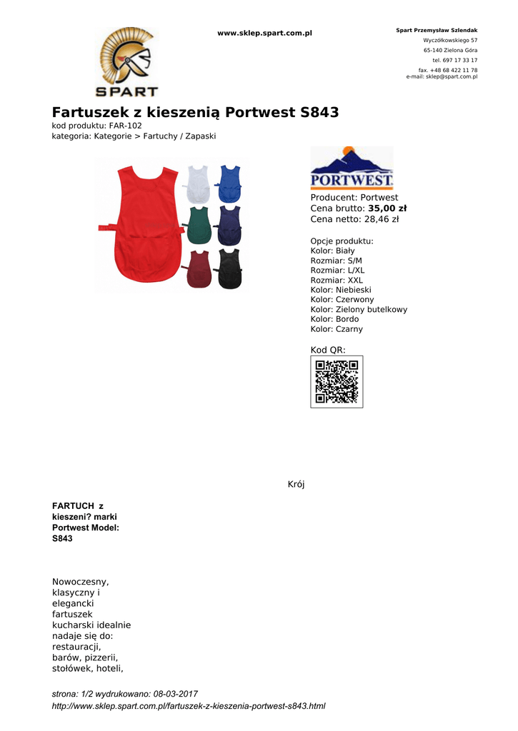 www.sklep.spart.com.pl Spart Przemysław Szlendak Wyczółkowskiego 57 65-140 Zielona Góra tel. 697 17 33 17 fax. +48 68 422 11 78 e-mail: [email protected] Fartuszek z kieszenią Portwest S843 kod produktu: FAR-102 kategoria: Kategorie > Fartuchy / Zapaski Producent: Portwest Cena brutto: 35,00 zł Cena netto: 28,46 zł Opcje produktu: Kolor: Biały Rozmiar: S/M Rozmiar: L/XL Rozmiar: XXL Kolor: Niebieski Kolor: Czerwony Kolor: Zielony butelkowy Kolor: Bordo Kolor: Czarny Kod QR: Krój FARTUCH z kieszeni? marki Portwest Model: S843 Nowoczesny, klasyczny i elegancki fartuszek kucharski idealnie nadaje się do: restauracji, barów, pizzerii, stołówek, hoteli, strona: 1/2 wydrukowano: 08-03-2017 http://www.sklep.spart.com.pl/fartuszek-z-kieszenia-portwest-s843.html itp. Skład materiału: 35% Baw 65% Poli Właściwości materiału: Fartuch posiada: wymiary: S/M zapięcia z boku na regulowane paski - 4 napy dla wygody praktyczną kieszeń z przodu L / XL skutecznie chroni odzież przed zabrudzeniem XXL Produkowane kolory : biały, zielony butelkowy, niebieski, czerwony, czarny, bordowy Brak koloru bordo w rozmiarach S/M oraz L/XL wycofany przez producenta Materiał: strona: 2/2 wydrukowano: 08-03-2017 http://www.sklep.spart.com.pl/fartuszek-z-kieszenia-portwest-s843.html 1 2 3 4 1 2 3 4