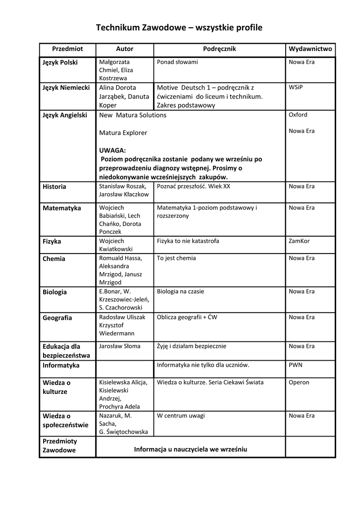 Technikum Zawodowe – wszystkie profile Przedmiot Autor Podręcznik Język Polski Małgorzata Chmiel, Eliza Kostrzewa Język Niemiecki Alina Dorota Motive Deutsch 1 – podręcznik z Jarząbek, Danuta dwiczeniami do liceum i technikum. Koper Zakres podstawowy New Matura Solutions WSiP Matura Explorer Nowa Era Język Angielski Ponad słowami Wydawnictwo Nowa Era Oxford UWAGA: Poziom podręcznika zostanie podany we wrześniu po przeprowadzeniu diagnozy wstępnej. Prosimy o niedokonywanie wcześniejszych zakupów. Historia Stanisław Roszak, Jarosław Kłaczkow Poznad przeszłośd. Wiek XX Nowa Era Matematyka Wojciech Babiaoski, Lech Chaoko, Dorota Ponczek Wojciech Kwiatkowski Romuald Hassa, Aleksandra Mrzigod, Janusz Mrzigod E.Bonar, W. Krzeszowiec-Jeleo, S. Czachorowski Radosław Uliszak Krzysztof Wiedermann Matematyka 1-poziom podstawowy i rozszerzony Nowa Era Fizyka to nie katastrofa ZamKor To jest chemia Nowa Era Biologia na czasie Nowa Era Oblicza geografii + DW Nowa Era Edukacja dla bezpieczeostwa Informatyka Jarosław Słoma Żyję i działam bezpiecznie Nowa Era Informatyka nie tylko dla uczniów. PWN Wiedza o kulturze Kisielewska Alicja, Kisielewski Andrzej, Prochyra Adela Nazaruk, M. Sacha, G. Świętochowska Wiedza o kulturze. Seria Ciekawi Świata Operon W centrum uwagi Nowa Era Fizyka Chemia Biologia Geografia Wiedza o społeczeostwie Przedmioty Zawodowe Informacja u nauczyciela we wrześniu Technikum Zawodowe – wszystkie profile