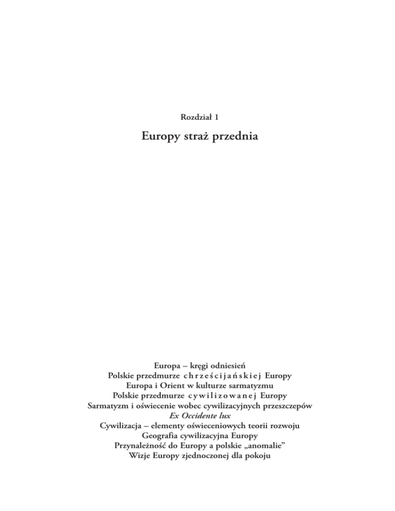 Rozdział 1 Europy straż przednia Europa – kręgi odniesień Polskie przedmurze c h r z e ś c i j a ń s k i e j Europy Europa i Orient w kulturze sarmatyzmu Polskie przedmurze c y w i l i z o w a n e j Europy Sarmatyzm i oświecenie wobec cywilizacyjnych przeszczepów Ex Occidente lux Cywilizacja – elementy oświeceniowych teorii rozwoju Geografia cywilizacyjna Europy Przynależność do Europy a polskie „anomalie” Wizje Europy zjednoczonej dla pokoju Europa – kręgi odniesień W procesach kształtowania się i samoidentyfikacji różnego rodzaju grup społecznych w świadomości ich członków występują dwojakiego rodzaju układy odniesień. Pierwsze z nich to układy, z którymi grupa się utożsamia. Ich wyznacznikami mogą być związki rodzinne, wspólnota języka, obyczaju, religii, losów historycznych, organizacji politycznych, takich jak państwo itp. Natomiast drugi rodzaj odniesień to układy, z którymi członkowie określonej grupy nie chcą czy też nie potrafią się identyfikować. Inny język, inny obyczaj, inne wierzenia, inne pochodzenie etniczne to elementy, które najczęściej współtworzą klasyczne przeciwstawienia „my i oni”, „swoi i obcy”. Zbiorowe układy samoidentyfikacji mogą występować na różnych poziomach, takich jak rodzina, grupa etniczna, grupa polityczna, grupa zawodowa, naród, kultura, cywilizacja, czy też w ramach typów wyróżnionych za pomocą terminologii zaczerpniętej z geografii. Zatrzymajmy się przy tych ostatnich. Takie terminy, jak Północ, Południe, Wschód i Zachód odnoszą się do stron świata, z których, mówiąc potocznie, jedna jest „na górze”, druga „na dole”, trzecia z prawej, a czwarta z lewej strony mapy. Ale czy rzeczywiście, kiedy mówimy Wschód i Zachód, chodzi nam jedynie o mapę lub kierunki wskazywane przez busolę? Nie ulega wątpliwości, że często mamy na myśli zupełnie coś innego, a mianowicie określone kręgi historyczno-kulturowe (niektórzy powiedzą „cywilizacyjne”), a wówczas to, czy leżą one po lewej, czy prawej stronie mapy, staje się nieistotne. Podobnie bywa z innymi nazwami o geograficznej proweniencji. Sensu, jaki nadajemy pojęciom Europy czy Azji, nie da się sprowadzić jedynie do współrzędnych geograficznych, do wielkości terytorium, rodzaju klimatu, charakteru fauny i flory oraz ukształtowania terenu. Pojęcia te nierzadko wypełniamy całkiem innymi treściami, odnosząc je do odmiennych obyczajów, religii, systemów politycznych, porządków wartości, a także do różnych kierunków biegu dziejów. Co więcej, zdarzało się (i zdarza), że pojmowano je jako pojęcia przeciwstawne1. Już w twórczości Ksenofonta (ok. 432–353 p.n.e.) wystąpiła opozycja azjatyckiego despotyzmu i europejskiej wolności2, 1 Na bogactwo i zróżnicowanie treści konstytuujących przeciwstawienia Wschodu i Zachodu oraz Europy i Azji wskazuje m.in.: E. Kuźma, Mit Orientu i kultury Zachodu w literaturze XIX i XX wieku, Szczecin 1980, s. 23. 2 B. Geremek, Więź i poczucie wspólnoty w średniowiecznej Europie, [w:] Dziesięć wieków Europy. Studia z dziejów kontynentu, red. t. J. Żarnowski, Warszawa 1983, s. 20 i n. 14 EUROPY STRAŻ PRZEDNIA stanowiąca jak gdyby praformę (matrycę) ukształtowanej w późniejszych czasach opozycji azjatyckiego (wschodniego) barbarzyństwa i europejskiej (zachodniej) cywilizacji. Według jednych, miał to być wynik odmiennych cech genetycznych (rasowych) ludów Azji i Europy, zdaniem innych, efekt odmiennych na obu kontynentach środowisk naturalnych i kulturowych, a jeszcze inni widzieli w tym wolę Bożą lub wyrok Opatrzności3. Byli oczywiście i tacy, którzy różnorako usiłowali łączyć wymienione stanowiska. Poczucie europejskości stanowiło jeden z najsilniejszych elementów konstytuujących polską świadomość narodową w jej historycznym dopełnianiu się i przekształcaniu w czasach nowożytnych i najnowszych. Czy jednak inne narody Europy akceptowały nas całkowicie jako „swoich”? Fakt, że członkowie grupy mniejszej (np. plemienia lub narodu) mają zarazem poczucie przynależności do jakieś większej, powiedzmy, nadrzędnej wspólnoty (np. chrześcijańskiej czy europejskiej), nie zawsze pozostaje w zgodzie z przekonaniami innych grup wchodzących w skład owej makrowspólnoty. Co więcej, mimo początkowego mniej lub bardziej sformalizowanego uczestnictwa w takiej wspólnocie, można po pewnym czasie zostać z niej wyłączonym. Zdarzało się, i to bardzo często, że prawosławni traktowali katolików jako odstępców od chrześcijaństwa, ci ostatni zaś robili w istocie to samo w stosunku do prawosławnych, opatrując ich mianem „schizmatyckich pogan”. Podobne ekskluzje ze wspólnoty chrześcijańskiej spotykały „heretyków” spod znaku reformacji. Zjawisko to odnosi się nie tylko do wspólnot religijnych, ale i historyczno-kulturowych, takich jak wspólnota europejska4. Mogą rodzić się wówczas różnego rodzaju kompleksy. Bo co z tego, że my sami mieliśmy się za Europejczyków, kiedy inni do nich zaliczani bywali odmiennego zdania. Stanisław Kot zwrócił swego czasu uwagę, że w XV wieku polskie normy prawne (wyznaczające np. w niektórych wypadkach karę grzywny za zabójstwo, a karę śmierci za kradzież), podrzędne traktowanie miast przez polską szlachtę, zamiłowanie do zbytku czy w końcu sposób ubierania się mężczyzn w długie, „kobiece” szaty sprawiały, że przybywający z Zachodu cudzoziemcy dostrzegali w Polakach więcej cech wschodnich niż zachodnich. Zresztą sam Jan Długosz, malując w roku 1466 obraz zepsucia polskich obyczajów, miał potwierdzać wtargnięcie do Polski mody wschodniej5. Od końca wieku XV wpływom orientalnym zaczął przeciwdziałać prąd renesansowy, którego jednym z przejawów stało się wyraźne otwarcie na Europę 3 Pomijam wyjaśnienia prowidencjalne, odwołujące się bezpośrednio do woli Opatrzności. K