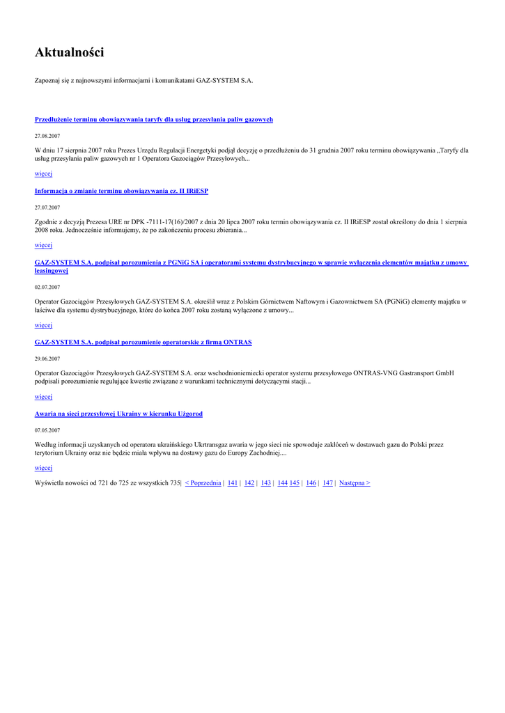 Aktualności Zapoznaj się z najnowszymi informacjami i komunikatami GAZ-SYSTEM S.A. Przedłużenie terminu obowiązywania taryfy dla usług przesyłania paliw gazowych 27.08.2007 W dniu 17 sierpnia 2007 roku Prezes Urzędu Regulacji Energetyki podjął decyzję o przedłużeniu do 31 grudnia 2007 roku terminu obowiązywania „Taryfy dla usług przesyłania paliw gazowych nr 1 Operatora Gazociągów Przesyłowych... więcej Informacja o zmianie terminu obowiązywania cz. II IRiESP 27.07.2007 Zgodnie z decyzją Prezesa URE nr DPK -7111-17(16)/2007 z dnia 20 lipca 2007 roku termin obowiązywania cz. II IRiESP został określony do dnia 1 sierpnia 2008 roku. Jednocześnie informujemy, że po zakończeniu procesu zbierania... więcej GAZ-SYSTEM S.A. podpisał porozumienia z PGNiG SA i operatorami systemu dystrybucyjnego w sprawie wyłączenia elementów majątku z umowy leasingowej 02.07.2007 Operator Gazociągów Przesyłowych GAZ-SYSTEM S.A. określił wraz z Polskim Górnictwem Naftowym i Gazownictwem SA (PGNiG) elementy majątku w łaściwe dla systemu dystrybucyjnego, które do końca 2007 roku zostaną wyłączone z umowy... więcej GAZ-SYSTEM S.A. podpisał porozumienie operatorskie z firmą ONTRAS 29.06.2007 Operator Gazociągów Przesyłowych GAZ-SYSTEM S.A. oraz wschodnioniemiecki operator systemu przesyłowego ONTRAS-VNG Gastransport GmbH podpisali porozumienie regulujące kwestie związane z warunkami technicznymi dotyczącymi stacji... więcej Awaria na sieci przesyłowej Ukrainy w kierunku Użgorod 07.05.2007 Według informacji uzyskanych od operatora ukraińskiego Ukrtransgaz awaria w jego sieci nie spowoduje zakłóceń w dostawach gazu do Polski przez terytorium Ukrainy oraz nie będzie miała wpływu na dostawy gazu do Europy Zachodniej.... więcej Wyświetla nowości od 721 do 725 ze wszystkich 735| < Poprzednia | 141 | 142 | 143 | 144 145 | 146 | 147 | Następna >
