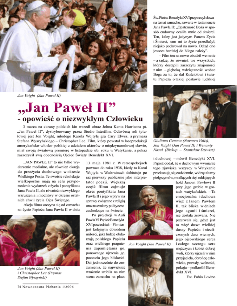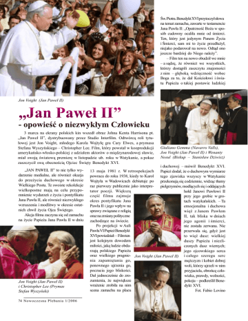 Św. Piotra. Benedykt XVI przytoczył słowa na temat zamachu, zawarte w testamencie Jana Pawła II: „Opatrzność Boża w sposób cudowny ocaliła mnie od śmierci. Ten, który jest jedynym Panem Życia i Śmierci, sam mi to życie przedłużył, niejako podarował na nowo. Odtąd ono jeszcze bardziej do Niego należy”. – Film ten na nowo obudził we mnie – a sądzę, że również we wszystkich, którzy dostąpili zaszczytu znajomości z nim – głęboką wdzięczność wobec Boga za to, że dał Kościołowi i światu Papieża o takiej postawie ludzkiej Jon Voight (Jan Paweł II) „Jan Paweł II” - opowieść o niezwykłym Człowieku 3 marca na ekrany polskich kin wszedł obraz Johna Kenta Harrisona pt. „Jan Paweł II”, dystrybuowany przez Studio Interfilm. Odtwórcą roli tytułowej jest Jon Voight, młodego Karola Wojtyłę gra Cary Elwes, a prymasa Stefana Wyszyńskiego – Christopher Lee. Film, który powstał w kooprodukcji amerykańsko-włosko-polskiej z udziałem aktorów o międzynarodowej sławie, miał swoją światową premierę w listopadzie ub. roku w Watykanie, a pokaz zaszczycił swą obecnością Ojciec Święty Benedykt XVI. „JAN PAWEŁ II” to nie tylko wydarzenie medialne, ale również okazja do przeżycia duchowego w okresie Wielkiego Postu. Te swoiste rekolekcje wielkopostne mają na celu przypomnienie wydarzeń z życia i pontyfikatu Jana Pawła II, ale również niezwykłego wzruszenia i modlitwy w okresie ostatnich chwil życia Ojca Świętego. Akcja filmu zaczyna się od zamachu na życie Papieża Jana Pawła II w dniu Jon Voight (Jan Paweł II) i Christopher Lee (Prymas Stefan Wyszyński) 74 N o w o c z e s n a P l e b a n i a 1/ 2006 Giuliano Gemma (Navarro Valls), Jon Voight (Jan Paweł II) i Wenanty Nosul (Biskup – Stanisław Dziwisz) i duchowej – mówił Benedykt XVI. 13 maja 1981 r. W retrospekcjach Papież dodał, że o duchowym wymiarze powraca do roku 1938, kiedy to Karol tego zjawiska wszyscy w Watykanie Wojtyła w Wadowicach debiutuje po przekonują się codziennie, widząc tłumy raz pierwszy publicznie jako interprepielgrzymów, modlących się i oddających tator poezji. Większą hołd Janowi Pawłowi II część filmu zajmuje przy jego grobie w grookres pontyfikatu Jana tach watykańskich. – Ta Pawła II i jego wpływ na emocjonalna i duchowa sprawy związane z religią więź z Janem Pawłem oraz na zmiany polityczne II, tak bliska w dniach zachodzące na świecie. jego agonii i śmierci, Po projekcji w Auli nie została zerwana. Nie Pawła VI Papież Benedykt przerwała się, gdyż jest XVI powiedział: – Film ten to więź dusz: wielkiej jest kolejnym dowodem duszy Papieża i niezlimiłości, jaką ludzie obdaczonych dusz wiernych; rzają polskiego Papieża jego ojcowskiego serca oraz wielkiego pragnie- Jon Voight (Jan Paweł II) i całego szeregu serc nia zapamiętania go, mężczyzn i kobiet dobrej ponownego ujrzenia go, woli, którzy ujrzeli w nim poczucia jego bliskości. przyjaciela, obrońcę człoDał jednocześnie do zrowieka, prawdy, wolności, zumienia, że największe pokoju – podkreślił Benewrażenie zrobiła na nim dykt XVI. scena zamachu na placu Fot. Fabio Lovino