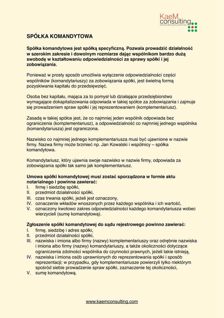 SPÓŁKA KOMANDYTOWA Spółka komandytowa jest spółką specyficzną. Pozwala prowadzić działalność w szerokim zakresie i dowolnym rozmiarze dając wspólnikom bardzo dużą swobodę w kształtowaniu odpowiedzialności za sprawy spółki i jej zobowiązania. Ponieważ w prosty sposób umożliwia wyłączenie odpowiedzialności części wspólników (komandytariuszy) za zobowiązania spółki, jest świetną formą pozyskiwania kapitału do przedsięwzięć. Osoba bez kapitału, mająca za to pomysł lub działające przedsiębiorstwo wymagające dokapitalizowania odpowiada w takiej spółce za zobowiązania i zajmuje się prowadzeniem spraw spółki i jej reprezentowaniem (komplementariusz). Zasadą w takiej spółce jest, że co najmniej jeden wspólnik odpowiada bez ograniczenia (komplementariusz), a odpowiedzialność co najmniej jednego wspólnika (komandytariusza) jest ograniczona. Nazwisko co najmniej jednego komplementariusza musi być ujawnione w nazwie firmy. Nazwa firmy może brzmieć np. Jan Kowalski i wspólnicy – spółka komandytowa. Komandytariusz, który ujawnia swoje nazwisko w nazwie firmy, odpowiada za zobowiązania spółki tak samo jak komplementariusz. Umowa spółki komandytowej musi zostać sporządzona w formie aktu notarialnego i powinna zawierać: I. firmę i siedzibę spółki, II. przedmiot działalności spółki, III. czas trwania spółki, jeżeli jest oznaczony, IV. oznaczenie wkładów wnoszonych przez każdego wspólnika i ich wartość, V. oznaczony kwotowo zakres odpowiedzialności każdego komandytariusza wobec wierzycieli (sumę komandytową). Zgłoszenie spółki komandytowej do sądu rejestrowego powinno zawierać: I. firmę, siedzibę i adres spółki, II. przedmiot działalności spółki, III. nazwiska i imiona albo firmy (nazwy) komplementariuszy oraz odrębnie nazwiska i imiona albo firmy (nazwy) komandytariuszy, a także okoliczności dotyczące ograniczenia zdolności wspólnika do czynności prawnych, jeżeli takie istnieją, IV. nazwiska i imiona osób uprawnionych do reprezentowania spółki i sposób reprezentacji; w przypadku, gdy komplementariusze powierzyli tylko niektórym spośród siebie prowadzenie spraw spółki, zaznaczenie tej okoliczności, V. sumę komandytową. www.kaemconsulting.com Zalety Ograniczenie odpowiedzialności komandytariusza za zobowiązania do wysokości sumy komandytowej Komandytariusze mogą działać w imieniu spółki wyłącznie jako pełnomocnicy Brak określonych wymagań odnośnie sumy komandytowej. Wady Konieczność sporządzenia umowy w postaci aktu notarialnego Rachunkowość może być prowadzona wyłącznie na zasadach ustawy o rachunkowości (księgowość pełna) co jest szczególnie uciążliwe przy małym rozmiarze działalności. Odpowiedzialność za zobowiązania Komandytariusz odpowiada za zobowiązania spółki wobec jej wierzycieli tylko do wysokości sumy komandytowej, komplementariusz całym swoim majątkiem. Komandytariusz odpowiada jednak całym swoim majątkiem, jeśli jego nazwisko lub firma zostanie ujawnione w firmie (nazwie) spółki komandytowej. Komandytariusz odpowiada również za zobowiązania spółki powstałe w wyniku wykonania czynności za spółkę, do których komandytariusz nie był uprawniony (działał bez pełnomocnictwa lub przekroczył jego zakres). Komandytariusz jest wolny od odpowiedzialności w granicach wartości wkładu, wniesionego do spółki, ale w przypadku zwrotu wkładu w całości albo w części odpowiedzialność zostaje przywrócona w wysokości równej wartości dokonanego zwrotu. Możliwe formy opodatkowania Zasady ogólne - księgowość pełna Podstawa prawna: Ustawa z dnia 15 września 2000 r. Kodeks spółek handlowych Tytuł II Dział III zajmuje się uregulowaniami dotyczącymi spółki komandytowej Ustawa z dnia 20 sierpnia 1997 r. o Krajowym Rejestrze Sądowym. www.kaemconsulting.com