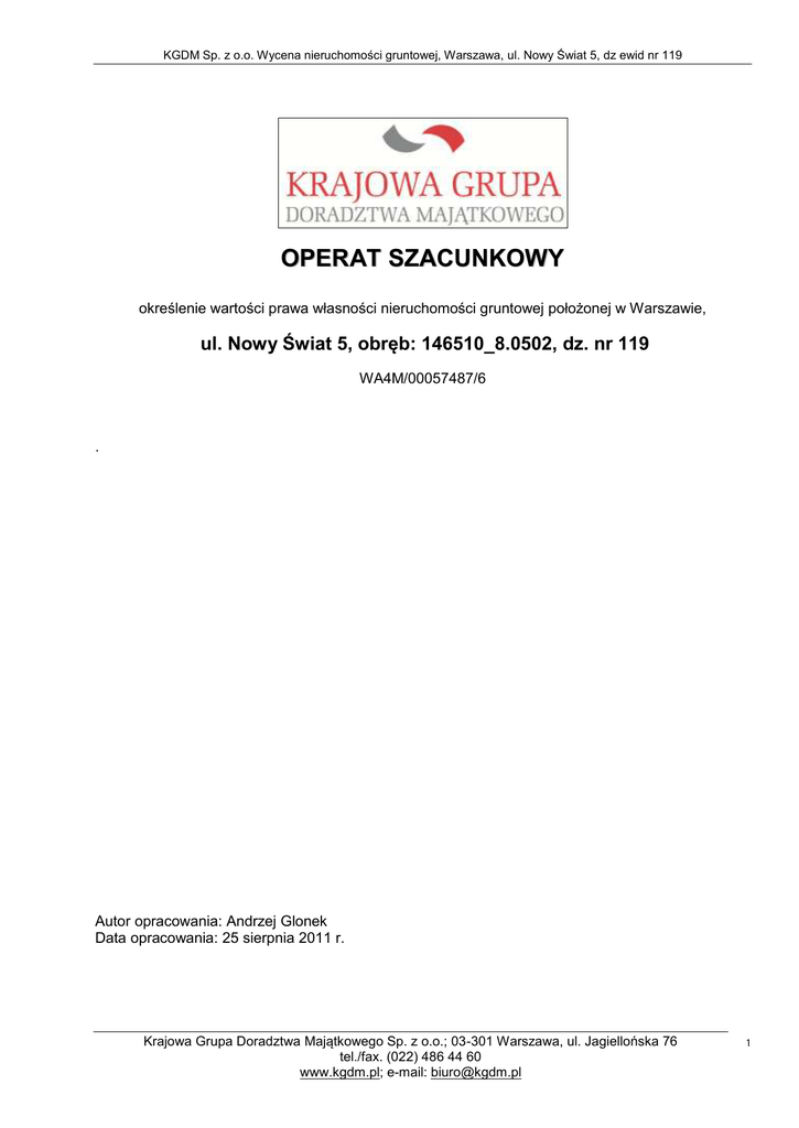 KGDM Sp. z o.o. Wycena nieruchomości gruntowej, Warszawa, ul. Nowy Świat 5, dz ewid nr 119 OPERAT SZACUNKOWY określenie wartości prawa własności nieruchomości gruntowej położonej w Warszawie, ul. Nowy Świat 5, obręb: 146510_8.0502, dz. nr 119 WA4M/00057487/6 . Autor opracowania: Andrzej Glonek Data opracowania: 25 sierpnia 2011 r. Krajowa Grupa Doradztwa Majątkowego Sp. z o.o.; 03-301 Warszawa, ul. Jagiellońska 76 tel./fax. (022) 486 44 60 www.kgdm.pl; e-mail: [email protected] 1 KGDM Sp. z o.o. Wycena nieruchomości gruntowej, Warszawa, ul. Nowy Świat 5, dz ewid nr 119 WYCIĄG Z OPERATU SZACUNKOWEGO Opis nieruchomości Cel wyceny Metoda wyceny Właściciel praw do nieruchomości Wartość rynkowa prawa własności nieruchomości gruntowej Adres: ul. Nowy Świat 5 Dzielnica: Śródmieście Działka: nr 119 Obręb: 146510_8.0502 2 Powierzchnia działki: 386 m Kw: WA4M/00057487/6 Określenie wartości prawa własności w celu ustalenia i naliczenia opłaty rocznej z tytułu użytkowania wieczystego gruntu oraz dla potrzeb aktualizacji opłat z tytułu użytkowania wieczystego. Grunt zabudowany budynkiem, w którym nie będzie prowadzona sprzedaż lokali. Podejście porównawcze, metoda korygowania ceny średniej Właściciel: GMINA DZIELNICA WARSZAWA - ŚRÓDMIEŚCIE ( NASTĘPCA PRAWNY M.ST. WARSZAWA) 2 345 788,00 zł 2 Wartość rynkowa 1 m prawa własności Daty istotne dla operatu Autor operatu szacunkowego 6 077,17 zł Data sporządzenia wyceny: 25 sierpnia 2011 r. Data, na którą określono wartość przedmiotu wyceny: 23 sierpnia 2011 r. Data, na którą określono i uwzględniono w wycenie stan przedmiotu wyceny: 23 sierpnia 2011 r. Data oględzin: 23 sierpnia 2011 r. Andrzej Glonek Uprawnienia nr 5005 Pieczęć i podpis rzeczoznawcy majątkowego Krajowa Grupa Doradztwa Majątkowego Sp. z o.o.; 03-301 Warszawa, ul. Jagiellońska 76 tel./fax. (022) 486 44 60 www.kgdm.pl; e-mail: [email protected] 2 KGDM Sp. z o.o. Wycena nieruchomości gruntowej, Warszawa, ul. Nowy Świat 5, dz ewid nr 119 Spis Treści 1. PRZEDMIOT I ZAKRES WYCENY ................................................................................................................. 4 1.1. 1.2. PRZEDMIOT I ZAKRES WYCENY ............................................................................................................... 4 ZAKRES WYCENY ................................................................................................................................... 4 2. CEL WYCENY ................................................................................................................................................. 4 3. PODSTAWY OPRACOWANIA OPERATU SZACUNKOWEGO .................................................................... 4 3.1. 3.2. 3.3. 3.4. PODSTAWA FORMALNA WYCENY ............................................................................................................. 4 PODSTAWY PRAWNE WYCENY ................................................................................................................ 4 PODSTAWY METODOLOGICZNE ............................................................................................................... 5 ŹRÓDŁA DANYCH MERYTORYCZNYCH ...................................................................................................... 5 4. DATY ISTOTNE DLA OPERATU SZACUNKOWEGO ................................................................................... 6 5. OPIS I OKREŚLENIE STANU NIERUCHOMOŚCI ........................................................................................ 6 5.1. 5.2. 5.3. STAN PRAWNY ....................................................................................................................................... 6 STAN TECHNICZNO-UŻYTKOWY ............................................................................................................... 6 STAN OTOCZENIA................................................................................................................................... 8 6. PRZEZNACZENIE NIERUCHOMOŚCI W PLANIE MIEJSCOWYM ............................................................ 10 7. OKREŚLENIE SPOSOBU WYCENY............................................................................................................ 11 7.1. 7.2. W SKAZANIE RODZAJU OKREŚLANEJ WARTOŚCI ...................................................................................... 11 W YBÓR PODEJŚCIA, METODY I TECHNIKI WYCENY .................................................................................. 11 8. ANALIZA I CHARAKTERYSTYKA RYNKU NIERUCHOMOŚCI .................................................................. 13 8.1. 8.2. SPECYFIKACJA BADANEGO RYNKU LOKALNEGO ..................................................................................... 13 ANALIZA, CHARAKTERYSTYKA I UWARUNKOWANIA BADANEGO RYNKU ..................................................... 13 9. OKREŚLENIE CECH RYNKOWYCH DLA WYCENIANEJ NIERUCHOMOŚCI .......................................... 15 10. WYZNACZENIE WAG POSZCZEGÓLNYCH CECH I OKREŚLENIE CECH DLA NIERUCHOMOŚCI BĘDĄCEJ PRZEDMIOTEM WYCENY .............................................................................................................. 16 11. OKREŚLENIE WARTOŚCI RYNKOWEJ PRZEDMIOTU WYCENY............................................................ 17 11.1. OKREŚLENIE BAZY NIERUCHOMOŚCI PODOBNYCH PRZYJĘTYCH DO PORÓWNAŃ....................................... 17 11.2. OKREŚLENIE WARTOŚCI RYNKOWEJ WYCENIANEJ NIERUCHOMOŚCI ........................................................ 17 11.2.1. Określenie zakresu współczynników korygujących .................................................................. 17 11.2.2. Charakterystyka nieruchomości wycenianej i nieruchomości o cenach minimalnej i maksymalnej w aspekcie cech rynkowych ................................................................................................ 18