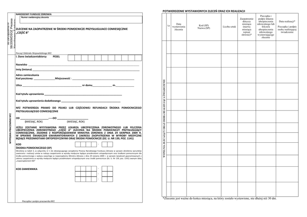 POTWIERDZENIE WYSTAWIONYCH ZLECEŃ ORAZ ICH REALIZACJI NARODOWY FUNDUSZ ZDROWIA do zarządzenia nr 58/2009/DSOZ Prezesa Narodowego Funduszu Numer ewidencyjny zlecenia Lp . ZLECENIE NA ZAOPATRZENIE W ŚRODKI POMOCNICZE PRZYSŁUGUJACE COMIESIĘCZNIE „CZĘŚĆ B” Data wystawienia zlecenia Kod (SP) Nazwa (SP) Liczba sztuk Zaopatrzenie dotyczy miesiąca (nazwę miesiąca wpisać słownie)* Pieczątka i podpis lekarza ubezpieczenia zdrowotnego lub felczera ubezpieczenia zdrowotnego wystawiającego zlecenie Pieczęć Oddziału Wojewódzkiego NFZ I. Dane świadczeniobiorcy PESEL Nazwisko ________________________________________________________________________________________________ Adres zamieszkania Kod pocztowy: _______________Miejscowość : ____________________________________________ Ulica __________________________________________ nr domu______________ m._____________ Kod tytułu uprawnienia _______________________________________________________ Kod tytułu uprawnienia dodatkowego __________________________________________ WYPEŁNIA PRACOWNIK NFZ NFZ POTWIERDZA PRAWO DO PEŁNEJ LUB CZĘŚCIOWEJ REFUNDACJI ŚRODKA POMOCNICZEGO PRZYSŁUGUJĄCEGO COMIESIĘCZNIE OD ____________________-----DO ______________________ (MIESIĄC, ROK) (MIESIĄC, ROK) JEŻELI ZOSTANIE WYSTAWIONA PRZEZ LEKARZA UBEZPIECZENIA ZDROWOTNEGO LUB FELCZERA UBEZPIECZENIA ZDROWOTNEGO „CZĘŚĆ A” ZLECENIA NA ŚRODEK POMOCNICZY PRZYSŁUGUJĄCY COMIESIĘCZNIE, ZGODNIE Z ROZPORZĄDZENIEM MINISTRA ZDROWIA Z DNIA 29 SIERPNIA 2009 R. W SPRAWIE ŚWIADCZEŃ GWARANTOWANYCH Z ZAKRESU ZAOPATRZENIA W WYROBY MEDYCZNE BĘDĄCE PRZEDMIOTAMI ORTOPEDYCZNYMI ORAZ ŚRODKI POMOCNICZE (DZ. U. NR 139, POZ. 1141) KOD ŚRODKA POMOCNICZEGO (SP) . Określony w tabeli 3, w załączniku nr 1 do obowiązującego zarządzenia Prezesa Narodowego Funduszu Zdrowia w sprawie określenia warunków zawierania i realizacji umów w rodzaju zaopatrzenie w wyroby medyczne będące przedmiotami ortopedycznymi oraz środkami pomocniczymi dla środka pomocniczego z wykazu zawartego w rozporządzeniu Ministra Zdrowia z dnia 29 sierpnia 2009 r. w sprawie świadczeń gwarantowanych z zakresu zaopatrzenia w wyroby medyczne będące przedmiotami ortopedycznymi oraz środki pomocnicze (Dz. U. Nr 139, poz. 1141) zwanym dalej „rozporządzeniem MZ” KOD ZAMIENNIKA WYPEŁNIA ZLECAJĄCY ORAZ OSOBA REALIZUJĄCA ŚWIADCZENIE Imię (Imiona) ____________________________________________________________________________ . . . *Zlecenie jest ważne do końca miesiąca, na który zostało wystawione, nie dłużej niż 30 dni. Pieczątka i podpis pracownika NFZ Data realizacji* Pieczątka i podpis osoby realizującej świadczenie