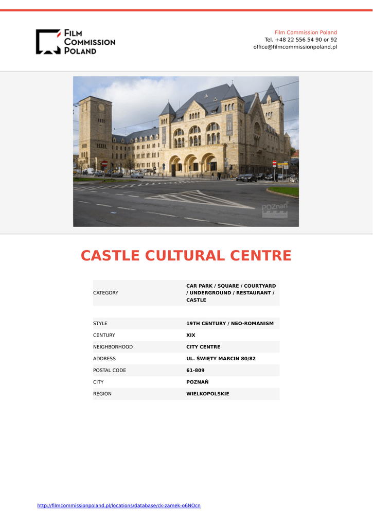 Film Commission Poland Tel. +48 22 556 54 90 or 92 office@filmcommissionpoland.pl CASTLE CULTURAL CENTRE CATEGORY CAR PARK / SQUARE / COURTYARD / UNDERGROUND / RESTAURANT / CASTLE STYLE 19TH CENTURY / NEO-ROMANISM CENTURY XIX NEIGHBORHOOD CITY CENTRE ADDRESS UL. ŚWIĘTY MARCIN 80/82 POSTAL CODE 61-809 CITY POZNAŃ REGION WIELKOPOLSKIE http://filmcommissionpoland.pl/locations/database/ck-zamek-o6NOcn Film Commission Poland Tel. +48 22 556 54 90 or 92 office@filmcommissionpoland.pl ABOUT LOCATION Emperors’ Castle built in the period 1905-1910 on the plan of irregular polygon in a neo-roman style. Constituted a part of the German city development plan of the period 1903-1910 of the so called Emperor’s District. Outer elevations are mostly kept in their original design – in the first years of XXI century renovated by removing external layers of patina. Interiors rebuilt during World War II in a style of the totalitarian architecture of the 3rd Reich. Under courtyard from the Święty Marcin street the antiaircraft shelter is located. Since the World War II the interiors have mostly remained unchanged – among others Hitler’s cabinet designed in accordance with the design of the Chancellery of the 3rd Reich in Berlin. In 2010 the Great Chamber was rebuilt and gained more modern character. source: Film Commission Poznan http://filmcommissionpoland.pl/locations/database/ck-zamek-o6NOcn