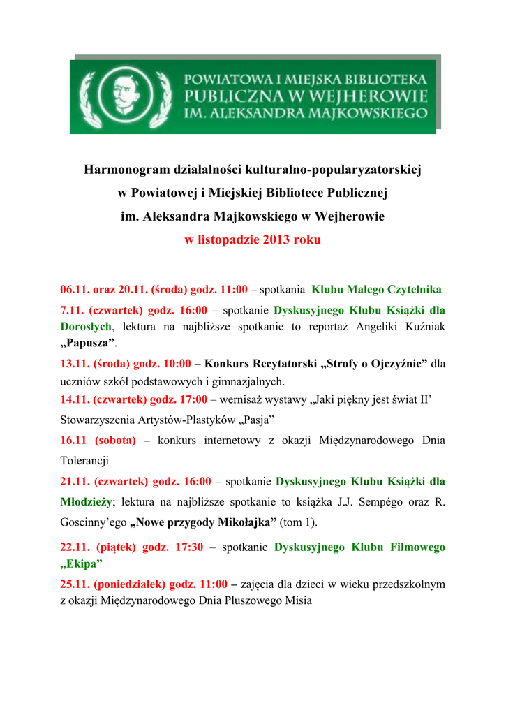 Harmonogram działalności kulturalno-popularyzatorskiej w Powiatowej i Miejskiej Bibliotece Publicznej im. Aleksandra Majkowskiego w Wejherowie w listopadzie 2013 roku 06.11. oraz 20.11. (środa) godz. 11:00 – spotkania Klubu Małego Czytelnika 7.11. (czwartek) godz. 16:00 – spotkanie Dyskusyjnego Klubu Książki dla Dorosłych, lektura na najbliższe spotkanie to reportaż Angeliki Kuźniak „Papusza”. 13.11. (środa) godz. 10:00 – Konkurs Recytatorski „Strofy o Ojczyźnie” dla uczniów szkół podstawowych i gimnazjalnych. 14.11. (czwartek) godz. 17:00 – wernisaż wystawy „Jaki piękny jest świat II’ Stowarzyszenia Artystów-Plastyków „Pasja” 16.11 (sobota) – konkurs internetowy z okazji Międzynarodowego Dnia Tolerancji 21.11. (czwartek) godz. 16:00 – spotkanie Dyskusyjnego Klubu Książki dla Młodzieży; lektura na najbliższe spotkanie to książka J.J. Sempégo oraz R. Goscinny’ego „Nowe przygody Mikołajka” (tom 1). 22.11. (piątek) godz. 17:30 – spotkanie Dyskusyjnego Klubu Filmowego „Ekipa” 25.11. (poniedziałek) godz. 11:00 – zajęcia dla dzieci w wieku przedszkolnym z okazji Międzynarodowego Dnia Pluszowego Misia Listopad – Uroczyste zakończenie VIII edycji Konkursu Literackiego „Powiew Weny” Wystawki związane z rocznicami: 100. ROCZNICA URODZIN ALBERTA CAMUS (7.11.) – francuskiego pisarza, dramaturga, eseisty, reżysera teatralnego, czołowego reprezentanta egzystencjalizmu w literaturze, laureata Nagrody Nobla w 1957 r. – Wypożyczalnia dla Dorosłych 95. ROCZNICA ODZYSKANIA PRZEZ POLSKĘ NIEPODLEGŁOŚCI (11.11.) – święto narodowe upamiętniające „rocznicę odzyskania przez Naród Polski niepodległego bytu państwowego” w 1918 roku po 123 latach od czasu rozbiorów, dokonanych przez Rosję, Prusy i Austrię. – Czytelnia Naukowa 50. ROCZNICA ŚMIERCI ALDOUSA HUXLEYA (22.11.) – angielskiego powieściopisarza, nowelisty, eseisty, poety, autora antyutopii pt. „Nowy wspaniały świat”. – Filia nr 2 50. ROCZNICA ŚMIERCI CLIVE’A STAPLESA LEWISA (22.11.) – brytyjskiego pisarza, historyka, filozofa i teologa, autora cyklu fantasy pt. Opowieści z Narnii. – Wypożyczalnia dla Dzieci i Młodzieży Biblioteka zastrzega sobie prawo do zmian w harmonogramie. Szczegółowe i aktualne informacje na stronie www.biblioteka.wejherowo.pl oraz www.facebook.com/BibliotekaWejherowo