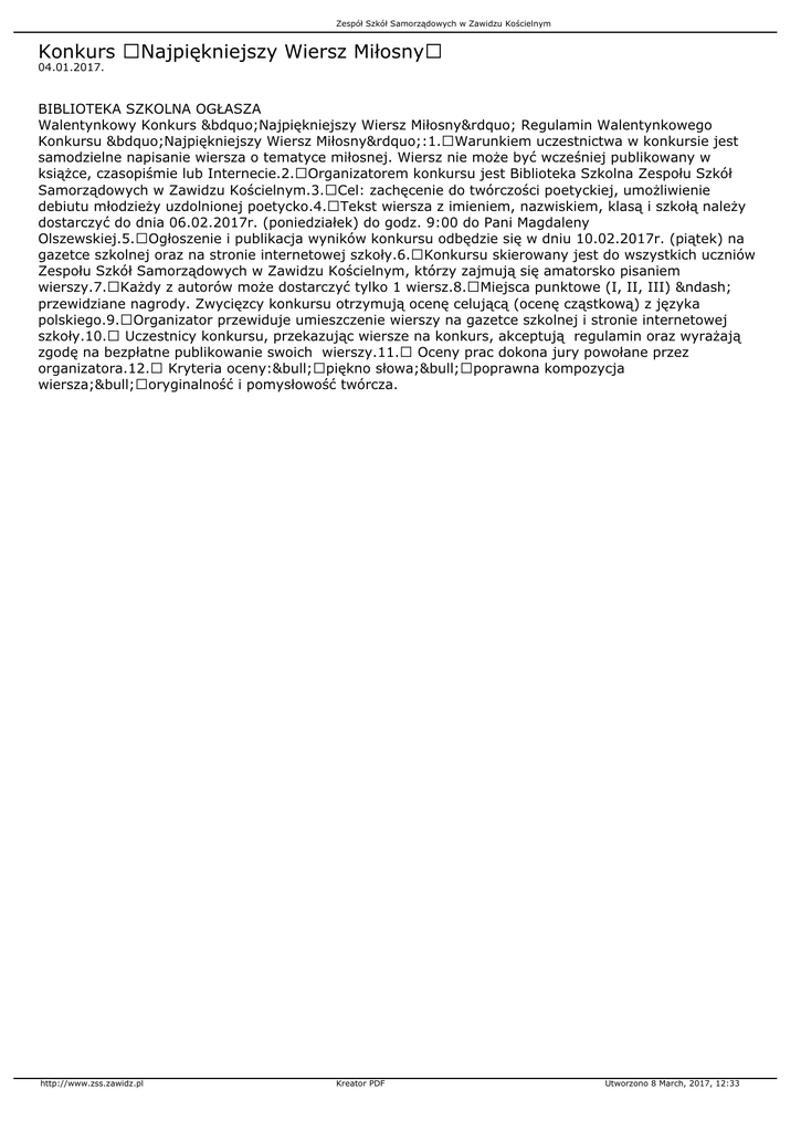 Zespół Szkół Samorządowych w Zawidzu Kościelnym Konkurs Najpiękniejszy Wiersz Miłosny 04.01.2017. BIBLIOTEKA SZKOLNA OGŁASZA Walentynkowy Konkurs „Najpiękniejszy Wiersz Miłosny” Regulamin Walentynkowego Konkursu „Najpiękniejszy Wiersz Miłosny”:1.Warunkiem uczestnictwa w konkursie jest samodzielne napisanie wiersza o tematyce miłosnej. Wiersz nie może być wcześniej publikowany w książce, czasopiśmie lub Internecie.2.Organizatorem konkursu jest Biblioteka Szkolna Zespołu Szkół Samorządowych w Zawidzu Kościelnym.3.Cel: zachęcenie do twórczości poetyckiej, umożliwienie debiutu młodzieży uzdolnionej poetycko.4.Tekst wiersza z imieniem, nazwiskiem, klasą i szkołą należy dostarczyć do dnia 06.02.2017r. (poniedziałek) do godz. 9:00 do Pani Magdaleny Olszewskiej.5.Ogłoszenie i publikacja wyników konkursu odbędzie się w dniu 10.02.2017r. (piątek) na gazetce szkolnej oraz na stronie internetowej szkoły.6.Konkursu skierowany jest do wszystkich uczniów Zespołu Szkół Samorządowych w Zawidzu Kościelnym, którzy zajmują się amatorsko pisaniem wierszy.7.Każdy z autorów może dostarczyć tylko 1 wiersz.8.Miejsca punktowe (I, II, III) – przewidziane nagrody. Zwycięzcy konkursu otrzymują ocenę celującą (ocenę cząstkową) z języka polskiego.9.Organizator przewiduje umieszczenie wierszy na gazetce szkolnej i stronie internetowej szkoły.10. Uczestnicy konkursu, przekazując wiersze na konkurs, akceptują regulamin oraz wyrażają zgodę na bezpłatne publikowanie swoich wierszy.11. Oceny prac dokona jury powołane przez organizatora.12. Kryteria oceny:•piękno słowa;•poprawna kompozycja wiersza;•oryginalność i pomysłowość twórcza. http://www.zss.zawidz.pl Kreator PDF Utworzono 8 March, 2017, 12:33