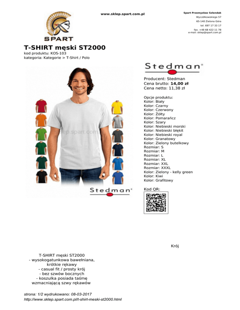 Spart Przemysław Szlendak www.sklep.spart.com.pl Wyczółkowskiego 57 65-140 Zielona Góra tel. 697 17 33 17 fax. +48 68 422 11 78 e-mail: [email protected] T-SHIRT męski ST2000 kod produktu: KOS-103 kategoria: Kategorie > T-Shirt / Polo Producent: Stedman Cena brutto: 14,00 zł Cena netto: 11,38 zł Opcje produktu: Kolor: Biały Kolor: Czarny Kolor: Czerwony Kolor: Żółty Kolor: Pomarańcz Kolor: Szary Kolor: Niebieski morski Kolor: Niebieski błękit Kolor: Niebieski royal Kolor: Granatowy Kolor: Zielony butelkowy Rozmiar: S Rozmiar: M Rozmiar: L Rozmiar: XL Rozmiar: XXL Rozmiar: XXXL Kolor: Zielony - kelly green Kolor: Kiwi Kolor: Grafitowy Kod QR: Krój T-SHIRT męski ST2000 - wysokogatunkowa bawełniana, krótkie rękawy - casual fit / prosty krój - bez szwów bocznych - koszulka posiada taśmę wzmacniającą szwy rękawów strona: 1/2 wydrukowano: 08-03-2017 http://www.sklep.spart.com.pl/t-shirt-meski-st2000.html Skład materiału: dostępne kolory: biały, czarny, zielony, kiwi, zielona butelka, czerwony, pomarańczowy, żółty, szary, grafitowy, niebieski, morski, royal, granatowy Właściwości materiału: Dobierz szybko swój rozmiar: Ile cm masz w klatce piersiowej ? obwód w klatce: S 86-93 M 94-101 L 102-109 XL 110-117 strona: 2/2 wydrukowano: 08-03-2017 http://www.sklep.spart.com.pl/t-shirt-meski-st2000.html XXL 118-125 XXXL 126-133