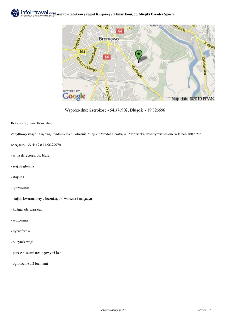 Braniewo - zabytkowy zespół Krajowej Stadniny Koni, ob. Miejski Ośrodek Sportu Współrzędne: Szerokość - 54.376902, Długość - 19.826696 Braniewo (niem. Braunsberg) Zabytkowy zespół Krajowej Stadniny Koni, obecnie Miejski Osrodek Sportu, ul. Moniuszki, obiekty wzniesione w latach 1889-91r, nr rejestru.: A-4467 z 14.06.2007r: - willa dyrektora, ob. biura - stajnia główna - stajnia II - ujeżdżalnia - stajnia kwarantanny z lecznica, ob. warsztat i magazyn - kuźnia, ob. warsztat - wozownia, - hydrofornia - budynek wagi - park z placami treningowymi koni - ogrodzenie z 2 bramami CiekaweMazury.pl 2010 Strona 1/1