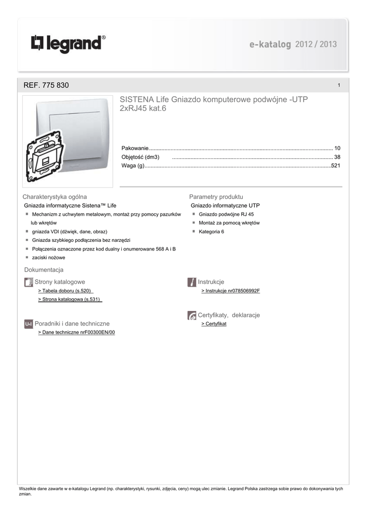 REF. 775 830 1 SISTENA Life Gniazdo komputerowe podwójne -UTP 2xRJ45 kat.6 Pakowanie .......................................................................................................................................... 10 Objętość (dm3) .......................................................................................................................................... 38 Waga (g) .......................................................................................................................................... 521 Charakterystyka ogólna Parametry produktu Gniazda informatyczne Sistena™ Life Gniazdo informatyczne UTP Mechanizm z uchwytem metalowym, montaż przy pomocy pazurków Gniazdo podwójne RJ 45 lub wkrętów Montaż za pomocą wkrętów gniazda VDI (dźwięk, dane, obraz) Kategoria 6 Gniazda szybkiego podłączenia bez narzędzi Połączenia oznaczone przez kod dualny i onumerowane 568 A i B zaciski nożowe Dokumentacja Strony katalogowe > Tabela doboru (s.520) Instrukcje > Instrukcje nr078506992F > Strona katalogowa (s.531) Certyfikaty, deklaracje Poradniki i dane techniczne > Certyfikat > Dane techniczne nrF00300EN/00 Wszelkie dane zawarte w e-katalogu Legrand (np. charakterystyki, rysunki, zdjęcia, ceny) mogą ulec zmianie. Legrand Polska zastrzega sobie prawo do dokonywania tych zmian.