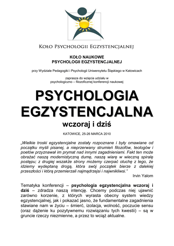 KOŁO NAUKOWE PSYCHOLOGII EGZYSTENCJALNEJ przy Wydziale Pedagogiki i Psychologii Uniwersytetu Śląskiego w Katowicach zaprasza do wzięcia udziału w psychologiczno – filozoficznej konferencji naukowej PSYCHOLOGIA EGZYSTENCJALNA wczoraj i dziś KATOWICE, 25-26 MARCA 2010 „Wielkie troski egzystencjalne zostały rozpoznane i były omawiane od początku myśli pisanej, a nieprzerwany strumień filozofów, teologów i poetów przyznawał im prymat nad innymi zagadnieniami. Fakt ten może obrażać naszą modernistyczną dumę, naszą wiarę w wieczną spiralę postępu; z drugiej wszakże strony możemy czerpać otuchę z tego, że idziemy wydeptaną drogą, która swój początek bierze z dalekiej przeszłości i którą przemierzali najmądrzejsi i najwnikliwsi.” Irvin Yalom Tematyka konferencji – psychologia egzystencjalna wczoraj i dziś – zdradza naszą intencję. Chcemy podczas niej ujawnić zarówno korzenie, z których wyrasta obecny system wiedzy egzystencjalnej, jak i pokazać jasno, że fundamentalne zagadnienia stawiane nam w życiu – śmierć, izolacja, wolność, poczucie sensu (oraz dążenie ku pozytywnemu rozwiązaniu tych kwestii) – są w gruncie rzeczy niezmienne, a przez to wciąż aktualne. Forma uczestnictwa. Zapraszamy do uczestnictwa w formie czynnej i biernej. Zarówno bierni jak i czynni uczestnicy dostaną certyfikat zaświadczający o udziale w konferencji. Obie formy uczestnictwa wymagają uprzedniej rejestracji. Można także przybyć bez rejestracji, nie otrzymując jednocześnie zaświadczenia o udziale. Forma czynna polega na wygłoszeniu 20 minutowego wystąpienia i/lub poprowadzenia zajęć warsztatowych. Udział w konferencji jest bezpłatny. Warunkiem uczestnictwa jest przesłanie wypełnionego formularza zgłoszeń oraz abstraktu lub planu warsztatu (w przypadku uczestników czynnych) do 30 grudnia 2009 na adres: [email protected] Formularz zgłoszeń jest możliwy do pobrania ze strony Koła. O wyborze zgłoszeń kandydaci zostaną poinformowani do 10 stycznia 2009. Informacje o konferencji aktualizowane będą KN Psychologii Egzystencjalnej: www.knpe.dbv.pl na stronie Abstrakt. 1 str. A4 tekstu czcionką Times New Roman 12, interlinia 1, 5 + bibliografia. Publikacja. Konferencji towarzyszyć będzie wydanie publikacji. Prawo do publikacji zyskują osoby, które uczestniczą w formie aktywnej w konferencji. Koszt uczestnictwa w niej to 100 zł, które zostanie wydane na opłacenie recenzenta oraz opracowanie i wydanie materiału. Z wyrazami szacunku, Organizatorzy