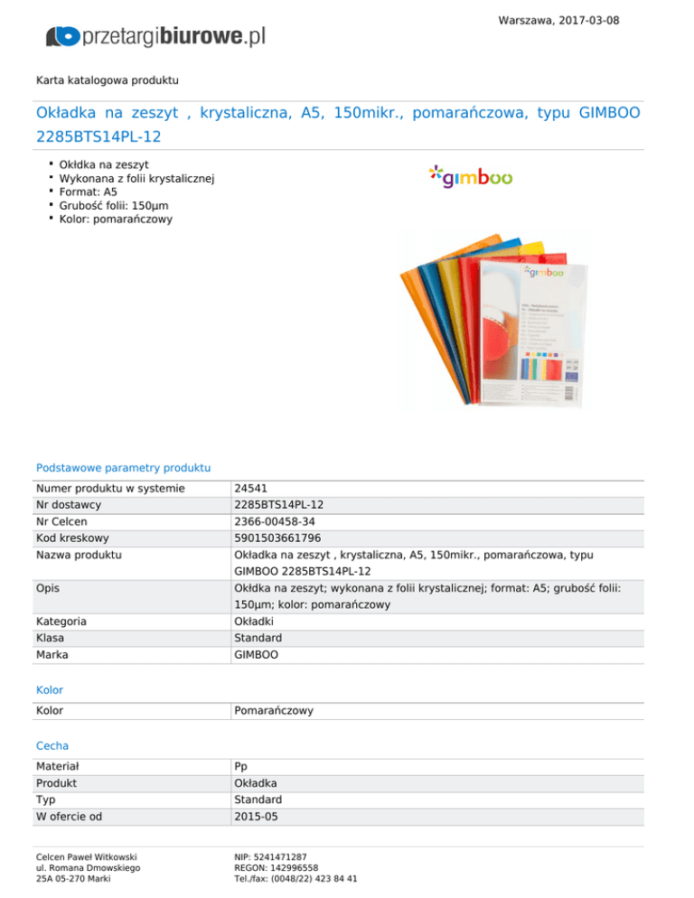 Warszawa, 2017-03-08 Karta katalogowa produktu Okładka na zeszyt , krystaliczna, A5, 150mikr., pomarańczowa, typu GIMBOO 2285BTS14PL-12 Okłdka na zeszyt Wykonana z folii krystalicznej Format: A5 Grubość folii: 150μm Kolor: pomarańczowy Podstawowe parametry produktu Numer produktu w systemie 24541 Nr dostawcy 2285BTS14PL-12 Nr Celcen 2366-00458-34 Kod kreskowy 5901503661796 Nazwa produktu Okładka na zeszyt , krystaliczna, A5, 150mikr., pomarańczowa, typu GIMBOO 2285BTS14PL-12 Opis Okłdka na zeszyt; wykonana z folii krystalicznej; format: A5; grubość folii: 150μm; kolor: pomarańczowy Kategoria Okładki Klasa Standard Marka GIMBOO Kolor Kolor Pomarańczowy Cecha Materiał Pp Produkt Okładka Typ Standard W ofercie od 2015-05 Celcen Paweł Witkowski ul. Romana Dmowskiego 25A 05-270 Marki NIP: 5241471287 REGON: 142996558 Tel./fax: (0048/22) 423 84 41 Warszawa, 2017-03-08 Wymiary Grubość (mm) 150μm Format A5 Certyfikaty Hit Standard Nowy produkt w ofercie Standard Wspólny słownik zamówień CPV 30192000-1 Wyroby biurowe Jesteśmy przekonani, że z pomocą przetargibiurowe.pl usprawnicie Państwo własne procesy biznesowe związane ze żmudnym poszukiwaniem odpowiadających Państwu produktów oraz opracowaniem specyfikacjii zapytań ofertowych. Serdecznie zapraszamy do wspópracy Zespół, PrzetargiBiurowe.pl Celcen Paweł Witkowski ul. Romana Dmowskiego 25A 05-270 Marki NIP: 5241471287 REGON: 142996558 Tel./fax: (0048/22) 423 84 41