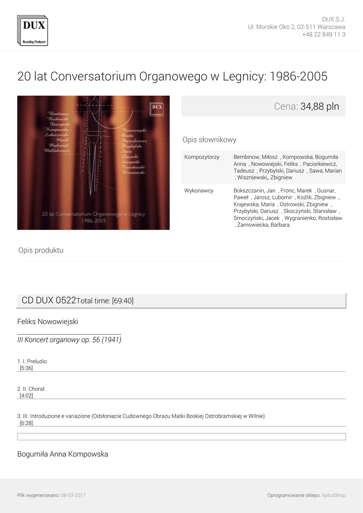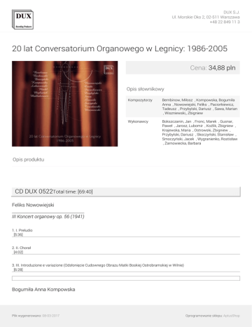 DUX S.J. Ul. Morskie Oko 2, 02-511 Warszawa +48 22 849 11 3 20 lat Conversatorium Organowego w Legnicy: 1986-2005 Cena: 34,88 pln Opis słownikowy Kompozytorzy Bembinow, Miłosz ∎, Kompowska, Bogumiła Anna ∎, Nowowiejski, Feliks ∎, Paciorkiewicz, Tadeusz ∎, Przybylski, Dariusz ∎, Sawa, Marian ∎, Wiszniewski,, Zbigniew ∎ Wykonawcy Bokszczanin, Jan ∎, Fronc, Marek ∎, Gusnar, Paweł ∎, Jarosz, Lubomir ∎, Koźlik, Zbigniew ∎, Krajewska, Maria ∎, Ostrowski, Zbigniew ∎, Przybylski, Dariusz ∎, Skoczyński, Stanisław ∎, Smoczyński, Jacek ∎, Wygranienko, Rostisław ∎, Żarnowiecka, Barbara ∎ Opis produktu CD DUX 0522Total time: [69:40] Feliks Nowowiejski III Koncert organowy op. 56 (1941) 1. I. Preludio [5:36] 2. II. Chorał [4:02] 3. III. Introduzione e variazione (Odsłonięcie Cudownego Obrazu Matki Boskiej Ostrobramskiej w Wilnie) [6:28] Bogumiła Anna Kompowska Plik wygenerowano: 08-03-2017 Oprogramowanie sklepu: AptusShop DUX S.J. Ul. Morskie Oko 2, 02-511 Warszawa +48 22 849 11 3 Tantra na ksylofon i organy (2003) 4. Tantra na ksylofon i organy (2003) [8:05] Zbigniew Wiszniewski, Trigonos na dwa akordeony i organy (1987) 5. Trigonos na dwa akordeony i organy (1987), wyd. Polski Instytut Muzyczny i RSW „Pomorze” [7:55] Tadeusz Paciorkiewicz 2 pieśni łacińskie na sopran i organy (1986) 6. I. Adoro te devote [3:02] 7. II. Jesu dulcis memoria [4:33] Miłosz Bembinow Mały Szkic na saksofon i organy (2005) 8. Mały Szkic na saksofon i organy (2005) [8:45] Dariusz Przybylski Partita „Hejnał wszyscy zaśpiewajmy” na trąbkę i organy (2003) 9. I. Maestoso [1:42] 10. II. Moderato Plik wygenerowano: 08-03-2017 Oprogramowanie sklepu: AptusShop DUX S.J. Ul. Morskie Oko 2, 02-511 Warszawa +48 22 849 11 3 [0:46] 11. III. Gigue. Allegretto [1:37] 12. IV. Adagio [2:23] 13. V. Allegro con fuoco [0:58] 14. VI. Vivo [1:48] Marian Sawa Msza do św. Huberta na róg myśliwski i organy (2004) 15. I. Introit [1:55] 16. II. Kyrie [1:12] 17. III. Gloria [2:01] 18. IV. Sanctus [1:21] 19. V. Benedictus [1:09] 20. VI. Agnus Dei [1:35] 21. VII. Postludium [1:56] CD DUX 0523Total time: [72:00] Plik wygenerowano: 08-03-2017 Oprogramowanie sklepu: AptusShop DUX S.J. Ul. Morskie Oko 2, 02-511 Warszawa +48 22 849 11 3 Mieczysław Surzyński Toccata d-moll op. 36 (1903) 1. Toccata d-moll op. 36 (1903), wyd. PWM, Kraków [8:08] Jan Adam Maklakiewicz Preludium na organy op. 17 (1927) 2. Preludium na organy op. 17 (1927), wyd. AMFC, Warszawa [5:04] Tadeusz Paciorkiewicz Chorał na organy Przez Twoje Święte Zmartwychpowstanie (1985) 3. I. Przez Twoje święte zmartwychpowstanie [6:04] Tadeusz Machl Pięć etiud wirtuozowskich na organy (1950) 4. I Etiuda organowa [2:15] 5. V etiuda organowa [2:12] Romuald Twardowski Romanza na organy (1982) 6. Romanza na organy (1982), wyd. Agencja Autorska, Warszawa 1982 [4:01] Plik wygenerowano: 08-03-2017 Oprogramowanie sklepu: AptusShop DUX S.J. Ul. Morskie Oko 2, 02-511 Warszawa +48 22 849 11 3 Marian Borkowski Psalmus per organo (1975) 7. Psalmus per organo (1975), wyd. PWM, Kraków 1980 [8:22] Marian Sawa Hymnus in honorem Sancti Petri et Pauli per organo (1994) 8. Hymnus in honorem Sancti Petri et Pauli per organo (1994), wyd. Polski Instytut Muzyczny, Łódź [6:56] Paweł Łukaszewski Souvenir I na organy 9. Souvenir I na organy (1999) [4:14] Ryszard Osada Preludium na organy (1972) 10. Preludium na organy (2002) [6:17] Jan Duszyński Kontrasty na organy 11. Kontrasty na organy (2002) [8:43] Plik wygenerowano: 08-03-2017 Oprogramowanie sklepu: AptusShop DUX S.J. Ul. Morskie Oko 2, 02-511 Warszawa +48 22 849 11 3 Michał Sławecki Apokryf na organy (2001) 12. Apokryf na organy (2001) [4:58] Mikołaj Majkusiak Toccata na organy (2001) 13. Toccata na organy (2001) [4:16] Wykonawcy: Barbara Żarnowiecka /sopran/ Dariusz Przybylski /organy/ Jacek Smoczyński /róg myśliwski/ Jan Bokszczanin /organy/ Lubomir Jarosz /trąbka/ Marek Fronc /organy/ Maria Krajewska /organy/ Paweł Gusnar /saksofon/ Rostisław Wygranienko /organy/ Stanisław Skoczyński /ksylofon/ Zbigniew Koźlik /akordeon/ Zbigniew Ostrowski /akordeon/ Plik wygenerowano: 08-03-2017 Powered by TCPDF (www.tcpdf.org) Oprogramowanie sklepu: AptusShop