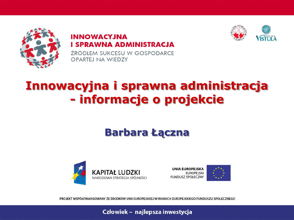 Innowacyjna i sprawna administracja - informacje o projekcie Barbara Łączna Podstawowe informacje o projekcie Okres realizacji: 1 lipca 2012 – 30 czerwca 2015 Lider: Związek Powiatów Polskich Partner: Uczelnia Vistula Finansowanie: Projekt jest współfinansowany przez Unię Europejską z Europejskiego Funduszu Społecznego, w ramach Priorytetu V. Dobre rządzenie Działania 5.2. Wzmocnienie potencjału administracji samorządowej Poddziałania 5.2.1 Modernizacja zarządzania w administracji samorządowej Programu Operacyjnego Kapitał Ludzki. Cel główny Poprawa jakości usług świadczonych przez 12 JST, poprzez modernizację procesów zarządzania, wdrożenie metody PRI oraz podniesienie kwalifikacji pracowników JST, którzy nie korzystają z wsparcia oferowanego w ramach 5.2.1. w okresie od 1 lipca 2012 roku do 30 czerwca 2015 roku. Cele szczegółowe C1. Poprawa funkcjonowania 12 JST poprzez wdrożenie metody PRI. C2. Usprawnienie systemów zarządzania w 12 JST w zdiagnozowanych obszarach: bezpieczeństwo publiczne, infrastruktura drogowa, ochrona zdrowia, ochrona środowiska i rolnictwo, kontrola zarządcza. C3. Wdrożenie systemu rozwoju kompetencji kadr w 12 JST. C4. Podniesienie kompetencji pracowników samorządowych w zakresie umiejętności miękkich. C5. Podniesienie kwalifikacji kompetencji pracowników samorządowych w zakresie umiejętności twardych. C6. Wzmocnienie postaw etycznych pracowników i zwiększenie przejrzystości funkcjonowania urzędów samorządowych. C7. Upowszechnianie dobrych praktyk i innowacyjnych rozwiązań. C8. Zmniejszanie nierówności płci i zapobieganie dyskryminacji. C9. Podniesienie satysfakcji klientów z jakości świadczonych usług oraz wdrożenie systemu monitorowania poziomu satysfakcji klientów. Nabór III kwartał br. 45 JST wyraziło wstępne zainteresowanie udziałem w projekcie. 30 JST przesłało formularze zgłoszeniowe. Weryfikacja MAiC pod kątem udziału w projektach finansowanych z PO KL 5.2.1. Analiza uczestnictwa pod względem wzajemnej lokalizacji jednostek. 12 JST zlokalizowanych w południowo-zachodniej Polsce 12 JST z południowej - zachodniej Polski Działania Audyt instytucjonalny w oparciu o metodę PRI. Audyt kompetencji i potrzeb szkoleniowych. Badania satysfakcji mieszkańców i pracowników JST. Wdrożenie usprawnień zarządczych w zdiagnozowanych obszarach: zdrowie, ochrona środowiska, zarządzania infrastrukturą drogową, zarządzenia kryzysem, wynikające z indywidualnych potrzeb każdej JST (indywidualne doradztwo). Działania Usprawnienie zarządzania urzędem: kontrola zarządcza, zarządzanie projektami, wdrożeniu systemu samooceny PRI. Poprawa umiejętności miękkich pracowników JST w zakresie: etyka, komunikacja społeczna, polityka równych szans kobiet i mężczyzn. Narzędzia usprawniające zarządzanie Narzędzia usprawniające zarzadzanie: profile kompetencyjne; mapy bezpieczeństwa; instrumenty nadzoru nad jednostkami świadczącymi usługi medyczne; system monitoringu kontroli zarządczej; program do samodzielnego badania satysfakcji mieszkańców i pracowników JST. Upowszechnianie i wymiana dobrych praktyk Samorządowe Forum Wymiany Dobrych Praktyk E-administracja Narzędzia elektroniczne, jako forma dodatkowego poszerzenia wiedzy i kompetencji osób uczestniczących w projekcie branżowe moduły szkoleniowe na platformach e-learningowych, gry symulacyjne, elektroniczne narzędzia zarządcze. Zbudowanie nowoczesne, samorządowej platformy e-learningowej z otwartym dostępem dla wszystkich JST. Projekt w liczbach 12 JST 500 osób 313 godzin szkoleń dla każdej JST 248 godzin indywidualnego doradztwa 800 ekranów w ramach e-learningu Ponad 370 tyś. zł realna wartość świadczonych usług jakie otrzymuje jeden urząd www.innowacyjna.zpp.pl Dziękuję za uwagę Barbara Łączna [email protected]