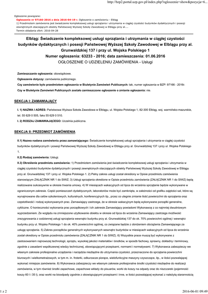 1z2 http://bzp2.portal.uzp.gov.pl/index.php?ogloszenie=show&pozycja=6... Ogłoszenie powiązane: Ogłoszenie nr 97166-2016 z dnia 2016-04-19 r. Ogłoszenie o zamówieniu - Elbląg 1) Przedmiotem zamówienia jest świadczenie kompleksowej usługi sprzątania i utrzymania w ciągłej czystości budynków dydaktycznych i posesji zewnętrznych otaczających obiekty Państwowej Wyższej Szkoły Zawodowej w Elblągu przy al.... Termin składania ofert: 2016-04-28 Elbląg: Świadczenie kompleksowej usługi sprzątania i utrzymania w ciągłej czystości budynków dydaktycznych i posesji Państwowej Wyższej Szkoły Zawodowej w Elblągu przy al. Grunwaldzkiej 137 i przy ul. Wojska Polskiego 1 Numer ogłoszenia: 63233 - 2016; data zamieszczenia: 01.06.2016 OGŁOSZENIE O UDZIELENIU ZAMÓWIENIA - Usługi Zamieszczanie ogłoszenia: obowiązkowe. Ogłoszenie dotyczy: zamówienia publicznego. Czy zamówienie było przedmiotem ogłoszenia w Biuletynie Zamówień Publicznych: tak, numer ogłoszenia w BZP: 97166 - 2016r. Czy w Biuletynie Zamówień Publicznych zostało zamieszczone ogłoszenie o zmianie ogłoszenia: nie. SEKCJA I: ZAMAWIAJĄCY I. 1) NAZWA I ADRES: Państwowa Wyższa Szkoła Zawodowa w Elblągu, ul. Wojska Polskiego 1, 82-300 Elbląg, woj. warmińsko-mazurskie, tel. 55 629 0 505, faks 55 629 0 510. I. 2) RODZAJ ZAMAWIAJĄCEGO: Uczelnia publiczna. SEKCJA II: PRZEDMIOT ZAMÓWIENIA II.1) Nazwa nadana zamówieniu przez zamawiającego: Świadczenie kompleksowej usługi sprzątania i utrzymania w ciągłej czystości budynków dydaktycznych i posesji Państwowej Wyższej Szkoły Zawodowej w Elblągu przy al. Grunwaldzkiej 137 i przy ul. Wojska Polskiego 1. II.2) Rodzaj zamówienia: Usługi. II.3) Określenie przedmiotu zamówienia: 1) Przedmiotem zamówienia jest świadczenie kompleksowej usługi sprzątania i utrzymania w ciągłej czystości budynków dydaktycznych i posesji zewnętrznych otaczających obiekty Państwowej Wyższej Szkoły Zawodowej w Elblągu przy al. Grunwaldzkiej 137 i przy ul. Wojska Polskiego 1. 2) Pełny zakres usługi został określony w Opisie przedmiotu zamówienia stanowiącym ZAŁĄCZNIK NR 1 do SIWZ; 3) Usługi sprzątania określone w Opisie przedmiotu zamówienia (ZAŁĄCZNIK NR 1 do SIWZ) będą realizowane sukcesywnie w okresie trwania umowy. 4) W miesiącach wakacyjnych od lipca do września sprzątanie będzie wykonywane w ograniczonym zakresie. Część pomieszczeń dydaktycznych, laboratoriów może być zamknięta, w zależności od grafiku zajętości sal, które są wynajmowane dla celów szkoleniowych, kulturalnych, konferencyjnych itp., przez co ulegnie zmianie ilość powierzchni do sprzątania oraz częstotliwość i rodzaj wykonywanych prac. Zamawiający zastrzega, że w okresie wakacyjnym będą wykonywane porządki generalne, cykliczne. O konieczności wykonania prac porządkowych i ich zakresie Zamawiający powiadomi Wykonawcę z co najmniej dwudniowym wyprzedzeniem. Ze względu na zmniejszone użytkowanie obiektu w okresie od lipca do września Zamawiający zastrzega możliwość zrezygnowania z codziennej usługi sprzątania wewnątrz budynku przy al. Grunwaldzkiej 137 do ok. 70% powierzchni ogólnej i wewnątrz budynku przy ul. Wojska Polskiego 1 do ok. 40% powierzchni ogólnej, co związane będzie z obniżeniem obciążenia Zamawiającego za usługę sprzątania. 5) Zakres porządków generalnych wykonywanych wewnątrz budynków w miesiącach wakacyjnych od lipca do września został określony w Opisie przedmiotu zamówienia (ZAŁĄCZNIK NR 1 do SIWZ). 6) Wszystkie prace muszą być wykonywane z zastosowaniem najnowszej technologii, sprzętu, wysokiej jakości materiałów i środków, w sposób fachowy, sprawny, dokładny i terminowy, zgodnie z zasadami współczesnej wiedzy technicznej, obowiązującymi przepisami, normami i normatywami. 7) Wykonawca zabezpieczy we własnym zakresie profesjonalne urządzenia i narzędzia niezbędne do utrzymania czystości, przeznaczone do sprzątania powierzchni biurowych i wielkometrażowych, w tym m. in. froterki, odkurzacze piorące, wielofunkcyjne maszyny czyszczące, itp., w ilości pozwalającej wykonać niniejsze zamówienie. 8) Wykonawca zabezpieczy we własnym zakresie profesjonalne środki czystości niezbędne do realizacji zamówienia, w tym również środki zapachowe, zapachowe wkłady do pisuarów, worki do koszy na odpady oraz do niszczarek (pojemność koszy 60 l i 35 l), oraz worki na bioodpady zgodnie z obowiązującymi przepisami i inne, w ilości pozwalającej wykonać z należytą starannością 2016-06-01 09:49 http://bzp2.portal.uzp.gov.pl/index.php?ogloszenie=show&pozycja=6... niniejsze zamówienie. Przez pojęcie środki czystości Zamawiający rozumie preparaty służące utrzymaniu czystości tj. detergenty, np. środki do czyszczenia urządzeń sanitarnych, środki do czyszczenia okien, uniwersalne środki czyszczące, środki do nabłyszczania podłóg i inne. Ponadto Zamawiający wymaga zabezpieczenia środków zapachowych, zapachowych wkładów do pisuarów, worków na odpady (zgodnie z zapisami Opisu przedmiotu zamówienia). Zamawiający nie wymaga od Wykonawcy zabezpieczenia środków higienicznych w postaci papieru toaletowego, mydła i ręczników papierowych. 9) Wykonawca stosować będzie środki czystości o bezspornie dobrej jakości, odpowiednie dla poszczególnych powierzchni, gwarantujące bezpieczeństwo (antypoślizgowe), o jakości zapewniającej wymagany poziom sprzątanych obiektów oraz nieniszczące swoim działaniem czyszczonych powierzchni. Środki chemiczne przeznaczone do profesjonalnego utrzymania czystości winny spełniać wymogi Polskich Norm oraz Unii Europejskiej i dopuszczone być do stosowania w Polsce w budynkach użyteczności publicznej. 10) Usługa sprzątania będzie wykonywana przy udziale personelu będącego w dyspozycji Wykonawcy, pod jego własnym nadzorem. 11) Wykonawca zapewni właściwą obsadę pracowników na wszystkich zmianac