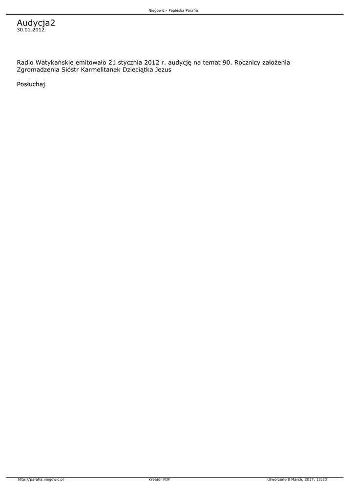 Niegowić - Papieska Parafia Audycja2 30.01.2012. Radio Watykańskie emitowało 21 stycznia 2012 r. audycję na temat 90. Rocznicy założenia Zgromadzenia Sióstr Karmelitanek Dzieciątka Jezus Posłuchaj http://parafia.niegowic.pl Kreator PDF Utworzono 8 March, 2017, 13:33