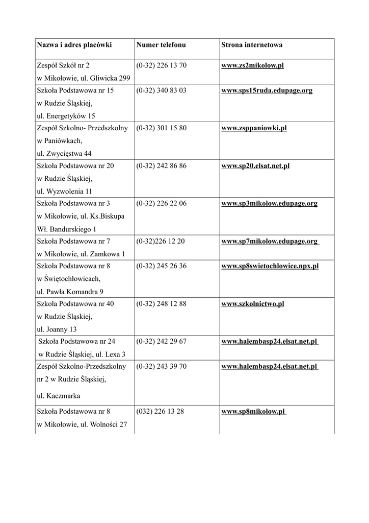 Nazwa i adres placówki Numer telefonu Strona internetowa Zespół Szkół nr 2 (0-32) 226 13 70 www.zs2mikolow.pl (0-32) 340 83 03 www.sps15ruda.edupage.org (0-32) 301 15 80 www.zsppaniowki.pl (0-32) 242 86 86 www.sp20.elsat.net.pl (0-32) 226 22 06 www.sp3mikolow.edupage.org (0-32)226 12 20 www.sp7mikolow.edupage.org (0-32) 245 26 36 www.sp8swietochlowice.npx.pl (0-32) 248 12 88 www.szkolnictwo.pl (0-32) 242 29 67 www.halembasp24.elsat.net.pl (0-32) 243 39 70 www.halembasp24.elsat.net.pl (032) 226 13 28 www.sp8mikolow.pl w Mikołowie, ul. Gliwicka 299 Szkoła Podstawowa nr 15 w Rudzie Śląskiej, ul. Energetyków 15 Zespół Szkolno- Przedszkolny w Paniówkach, ul. Zwycięstwa 44 Szkoła Podstawowa nr 20 w Rudzie Śląskiej, ul. Wyzwolenia 11 Szkoła Podstawowa nr 3 w Mikołowie, ul. Ks.Biskupa Wł. Bandurskiego 1 Szkoła Podstawowa nr 7 w Mikołowie, ul. Zamkowa 1 Szkoła Podstawowa nr 8 w Świętochłowicach, ul. Pawła Komandra 9 Szkoła Podstawowa nr 40 w Rudzie Śląskiej, ul. Joanny 13 Szkoła Podstawowa nr 24 w Rudzie Śląskiej, ul. Lexa 3 Zespół Szkolno-Przedszkolny nr 2 w Rudzie Śląskiej, ul. Kaczmarka Szkoła Podstawowa nr 8 w Mikołowie, ul. Wolności 27
