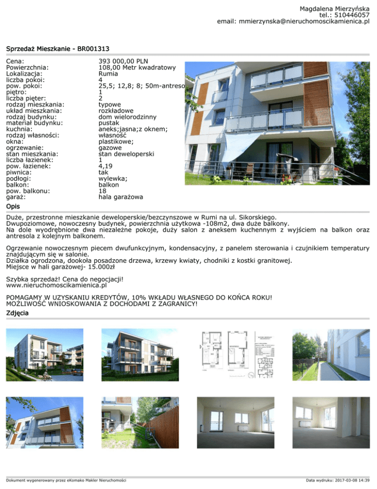 Magdalena Mierzyńska tel.: 510446057 email: [email protected] Sprzedaż Mieszkanie - BR001313 Cena: Powierzchnia: Lokalizacja: liczba pokoi: pow. pokoi: piętro: liczba pięter: rodzaj mieszkania: układ mieszkania: rodzaj budynku: materiał budynku: kuchnia: rodzaj własności: okna: ogrzewanie: stan mieszkania: liczba łazienek: pow. łazienek: piwnica: podłogi: balkon: pow. balkonu: garaż: Opis 393 000,00 PLN 108,00 Metr kwadratowy Rumia 4 25,5; 12,8; 8; 50m-antresola 1 2 typowe rozkładowe dom wielorodzinny pustak aneks;jasna;z oknem; własność plastikowe; gazowe stan deweloperski 1 4,19 tak wylewka; balkon 18 hala garażowa Duże, przestronne mieszkanie deweloperskie/bezczynszowe w Rumi na ul. Sikorskiego. Dwupoziomowe, nowoczesny budynek, powierzchnia użytkowa -108m2, dwa duże balkony. Na dole wyodrębnione dwa niezależne pokoje, duży salon z aneksem kuchennym z wyjściem na balkon oraz antresola z kolejnym balkonem. Ogrzewanie nowoczesnym piecem dwufunkcyjnym, kondensacyjny, z panelem sterowania i czujnikiem temperatury znajdującym się w salonie. Działka ogrodzona, dookoła posadzone drzewa, krzewy kwiaty, chodniki z kostki granitowej. Miejsce w hali garażowej- 15.000zł Szybka sprzedaż! Cena do negocjacji! www.nieruchomoscikamienica.pl POMAGAMY W UZYSKANIU KREDYTÓW, 10% WKŁADU WŁASNEGO DO KOŃCA ROKU! MOŻLIWOŚĆ WNIOSKOWANIA Z DOCHODAMI Z ZAGRANICY! Zdjęcia Dokument wygenerowany przez eKomako Makler Nieruchomości Data wydruku: 2017-03-08 14:39