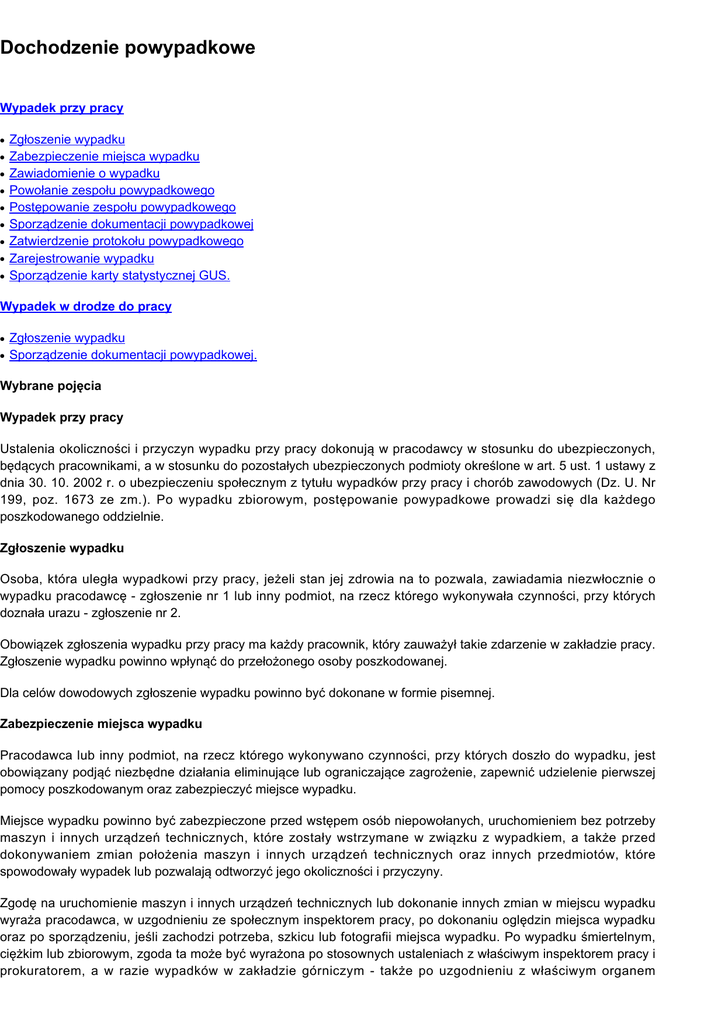 Dochodzenie powypadkowe Wypadek przy pracy ● ● ● ● ● ● ● ● ● Zgłoszenie wypadku Zabezpieczenie miejsca wypadku Zawiadomienie o wypadku Powołanie zespołu powypadkowego Postępowanie zespołu powypadkowego Sporządzenie dokumentacji powypadkowej Zatwierdzenie protokołu powypadkowego Zarejestrowanie wypadku Sporządzenie karty statystycznej GUS. Wypadek w drodze do pracy ● ● Zgłoszenie wypadku Sporządzenie dokumentacji powypadkowej. Wybrane pojęcia Wypadek przy pracy Ustalenia okoliczności i przyczyn wypadku przy pracy dokonują w pracodawcy w stosunku do ubezpieczonych, będących pracownikami, a w stosunku do pozostałych ubezpieczonych podmioty określone w art. 5 ust. 1 ustawy z dnia 30. 10. 2002 r. o ubezpieczeniu społecznym z tytułu wypadków przy pracy i chorób zawodowych (Dz. U. Nr 199, poz. 1673 ze zm.). Po wypadku zbiorowym, postępowanie powypadkowe prowadzi się dla każdego poszkodowanego oddzielnie. Zgłoszenie wypadku Osoba, która uległa wypadkowi przy pracy, jeżeli stan jej zdrowia na to pozwala, zawiadamia niezwłocznie o wypadku pracodawcę - zgłoszenie nr 1 lub inny podmiot, na rzecz którego wykonywała czynności, przy których doznała urazu - zgłoszenie nr 2. Obowiązek zgłoszenia wypadku przy pracy ma każdy pracownik, który zauważył takie zdarzenie w zakładzie pracy. Zgłoszenie wypadku powinno wpłynąć do przełożonego osoby poszkodowanej. Dla celów dowodowych zgłoszenie wypadku powinno być dokonane w formie pisemnej. Zabezpieczenie miejsca wypadku Pracodawca lub inny podmiot, na rzecz którego wykonywano czynności, przy których doszło do wypadku, jest obowiązany podjąć niezbędne działania eliminujące lub ograniczające zagrożenie, zapewnić udzielenie pierwszej pomocy poszkodowanym oraz zabezpieczyć miejsce wypadku. Miejsce wypadku powinno być zabezpieczone przed wstępem osób niepowołanych, uruchomieniem bez potrzeby maszyn i innych urządzeń technicznych, które zostały wstrzymane w związku z wypadkiem, a także przed dokonywaniem zmian położenia maszyn i innych urządzeń technicznych oraz innych przedmiotów, które spowodowały wypadek lub pozwalają odtworzyć jego okoliczności i przyczyny. Zgodę na uruchomienie maszyn i innych urządzeń technicznych lub dokonanie innych zmian w miejscu wypadku wyraża pracodawca, w uzgodnieniu ze społecznym inspektorem pracy, po dokonaniu oględzin miejsca wypadku oraz po sporządzeniu, jeśli zachodzi potrzeba, szkicu lub fotografii miejsca wypadku. Po wypadku śmiertelnym, ciężkim lub zbiorowym, zgoda ta może być wyrażona po stosownych ustaleniach z właściwym inspektorem pracy i prokuratorem, a w razie wypadków w zakładzie górniczym - także po uzgodnieniu z właściwym organem państwowego nadzoru górniczego. Dokonywanie zmian w miejscu wypadku bez zgody pracodawcy jest dopuszczalne, jeżeli zachodzi konieczność ratowania osób lub mienia albo zapobieżenia grożącemu niebezpieczeństwu. Zawiadomienie o wypadku Pracodawca jest obowiązany niezwłocznie zawiadomić właściwego inspektora pracy i prokuratora o śmiertelnym, ciężkim lub zbiorowym wypadku przy pracy oraz o każdym innym wypadku, który wywołał wymienione skutki, mającym związek z pracą, jeżeli może być uznany za wypadek przy pracy. Powołanie zespołu powypadkowego Ustalenia okoliczności i przyczyn wypadku przy pracy (postępowanie powypadkowe) dokonuje zespół powypadkowy, którego skład jest uzależniony od rodzaju wypadku i przyjętego u danego pracodawcy systemu realizacji zadań w zakresie bhp, i tak: ● ● wypadki śmiertelne, ciężkie i zbiorowe – skład zespołu: pracownik kierujący komórką służby bhp oraz zakładowy społeczny inspektor pracy pozostałe wypadki – skład zespołu: pracownik służby bhp oraz oddziałowy (wydziałowy) społeczny inspektor pracy. U pracodawcy, który nie ma obowiązku tworzenia służby bhp, w skład zespołu powypadkowego wchodzi pracodawca lub pracownik zatrudniony przy innej pracy, któremu pracodawca powierzył wykonywanie zadań służby bhp albo specjalista spoza zakładu. W przypadku pracodawcy, u którego nie działa społeczna inspekcja pracy, w skład tego zespołu, zamiast społecznego inspektora pracy, wchodzi przedstawiciel pracowników posiadający aktualne zaświadczenie o ukończeniu szkolenia w zakresie bezpieczeństwa i higieny pracy. Jeżeli pracodawca nie może dopełnić obowiązku utworzenia zespołu powypadkowego w składzie dwuosobowym, ze względu na małą liczbę zatrudnionych pracowników, okoliczności i przyczyny wypadku ustala zespół, w którego skład wchodzi pracodawca oraz specjalista spoza zakładu pracy. Ustalenia okoliczności i przyczyn wypadku, który miał miejsce na terenie innego zakładu pracy, dokonuje zespół powypadkowy powołany przez pracodawcę poszkodowanego, w obecności przedstawiciela pracodawcy, na którego terenie miał miejsce wypadek. Pracodawca, na którego terenie miał miejsce wypadek, w którym została poszkodowana osoba nie będąca jego pracownikiem, jest obowiązany w szczególności: ● ● ● ● zapewnić udzielenie pomocy poszkodowanemu zabezpieczyć miejsce wypadku w sposób pozwalający na odtworzenie jego okoliczności i przyczyn zawiadomić niezwłocznie o wypadku pracodawcę poszkodowanego udostępnić miejsce wypadku i niezbędne materiały oraz udzielić informacji i wszechstronnej pomocy zespołowi powypadkowemu ustalającemu okoliczności i przyczyny wypadku. Na wniosek pracodawcy poszkodowanego pracownika pracodawca, na którego terenie miał miejsce wypadek, może ustalić okoliczności i przyczyny wypadku, a następnie dokumentację powypadkową przekazać pracodawcy poszkodowanego pracownika. Postępowanie zespołu powypadkowego Zespół powypadkowy ma obowiązek: ● dokonać oględzin miejsca wypadku, stanu technicznego maszyn i innych urządzeń technicznych, stanu urządzeń ochronnych oraz zbadać warunki wykonywania p