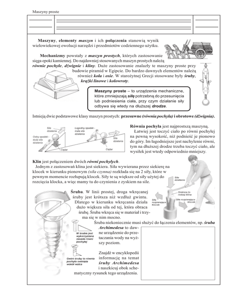 Maszyny proste Maszyny, elementy maszyn i ich po³¹czenia stanowi¹ wynik wielowiekowej ewolucji narzêdzi i przedmiotów codziennego u¿ytku. Mechanizmy powsta³y z maszyn prostych, których zastosowanie siêga epoki kamiennej. Do najdawniej stosowanych maszyn prostych nale¿¹ równie pochy³e, dwignie i kliny. Du¿e zastosowanie znalaz³y te maszyny proste przy budowie piramid w Egipcie. Do bardzo dawnych elementów nale¿¹ równie¿ ko³a i osie. W staro¿ytnej Grecji stosowane by³y ruby, kr¹¿ki linowe i ko³owroty. Maszyny proste to urz¹dzenia mechaniczne, które zmniejszaj¹ si³ê potrzebn¹ do przesuniêcia lub podniesienia cia³a, przy czym dzia³anie si³y odbywa siê wtedy na d³u¿szej drodze. Istniej¹ dwie podstawowe klasy maszyn prostych: przesuwne (równia pochy³a) i obrotowe (dwignia). Równia pochy³a jest najprostsz¹ maszyn¹. £atwiej jest toczyæ cia³o po równi pochy³ej na pewn¹ wysokoæ, ni¿ podnieæ je pionowo do góry. Im ³agodniejsze jest nachylenie równi, tym na d³u¿szej drodze trzeba toczyæ cia³o, ale wysi³ek jest wtedy odpowiednio mniejszy. Klin jest po³¹czeniem dwóch równi pochy³ych. Jednym z zastosowañ klina jest siekiera. Si³a wywierana przez siekierê na klocek w kierunku pionowym (si³a czynna) rozk³ada siê na 2 si³y, które w pewnym momencie roz³upuj¹ klocek. Si³y te s¹ wiêksze od si³y u¿ytej do rozciêcia klocka, a wiêc mamy tu do czynienia z zyskiem na sile. ruba. W linii prostej, droga wkrêcanej ruby jest krótsza ni¿ wzd³u¿ gwintu. Dlatego w kierunku wkrêcania dzia³a du¿o wiêksza si³a od tej, która obraca rubê. ruba wkrêca siê w materia³ i trzyma siê w nim mocno. ruba niekoniecznie musi s³u¿yæ do ³¹czenia elementów, np. ruba Archimedesa to dawne urz¹dzenie do przetaczania wody na wy¿szy poziom. Znajd w encyklopedii informacjê na temat ruby Archimedesa i naszkicuj obok schematyczny rysunek tego urz¹dzenia. Dwignia to maszyna prosta w kszta³cie prêta o sta³ej osi obrotu. Tak¹ maszyn¹ jest np. d³ugi kij, który oparty na kamieniu u³atwia nam zrównowa¿enie du¿ego ciê¿aru. Kiedy naciskamy koniec kija znajduj¹cy siê dalej od osi obrotu, na drugim koñcu uzyskujemy wiêksz¹ si³ê równowa¿¹c¹ ciê¿ar cia³a. Inne rodzaje dwigni pozwalaj¹ b¹d zyskiwaæ na sile, a traciæ na drodze, b¹d odwrotnie traciæ na sile, a zyskiwaæ na drodze. Istniej¹ dwa rodzaje dwigni. Dr¹g to dwignia dwustronna (dwuramienna). O znajduje siê miêdzy ciê¿arem i przy³o¿on¹ si³¹ dzia³ania. Taczka to dwignia jednostronna (jednoramienna). Punkt przy³o¿enia ciê¿aru znajduje siê miêdzy osi¹ i punktem przy³o¿enia si³y dzia³ania. Wêdka rybacka to tak¿e dwignia jednostronna (jednoramienna). Si³a dzia³ania jest przy³o¿ona po tej samej stronie osi obrotu co ciê¿ar. W tym przypadku si³a dzia³ania jest wiêksza od ciê¿aru. Wymieñ piêæ urz¹dzeñ lub narzêdzi, w których zastosowano dwigniê. Obok wpisz rodzaj u¿ytej dwigni, a tak¿e czy dziêki niej si³a dzia³ania zosta³a zwiêkszona (+) czy zmniejszona (-) w stosunku do ciê¿aru (si³y oporu). Nazwa urz¹dzenia lub narzêdzia Rodzaj dwigni +/- Ko³owrót. Wiele maszyn wykorzystuje zasadê dzia³ania ko³owrotu. Jedn¹ z nich jest wci¹garka, w której si³a przy³o¿ona do korby (ko³a) obraca wa³ i pokonuje wiêkszy ciê¿ar. Droga przebyta przez punkt przy³o¿enia tej si³y jest wiêksza od drogi przebytej przez ciê¿ar. Wielokr¹¿ek u³atwia podnoszenie du¿ych ³adunków. Ta maszyna prosta sk³ada siê z kilku kr¹¿ków, jarzma, do którego s¹ one przymocowane, oraz liny na³o¿onej na rowki w kr¹¿kach. Kiedy ci¹gniemy ³adunek, dolny kr¹¿ek do którego przyczepiony jest ³adunek podnosi siê. Zestaw kr¹¿ków linowych umo¿liwia podniesienie du¿ego ³adunku za pomoc¹ niewielkiej si³y. Pomyl! Do jakiej klasy maszyn prostych zaliczysz przek³adniê ³añcuchow¹ w swoim rowerze? Czy rzeczywicie mo¿na j¹ uznaæ za maszynê prost¹? A p³ug odwracaj¹cy skibê oranej ziemi? Czy te¿ nale¿y do maszyn prostych? Odpowiedzi uzasadnij: .......................................................................................................................... .................................................................................................................... .......................................................................................................................................................... .......................................................................................................................................................... ..........................................................................................................................................................
