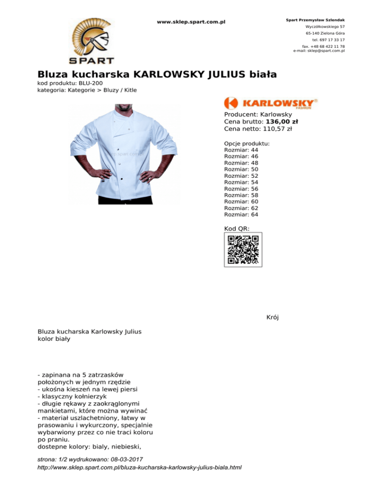Spart Przemysław Szlendak www.sklep.spart.com.pl Wyczółkowskiego 57 65-140 Zielona Góra tel. 697 17 33 17 fax. +48 68 422 11 78 e-mail: [email protected] Bluza kucharska KARLOWSKY JULIUS biała kod produktu: BLU-200 kategoria: Kategorie > Bluzy / Kitle Producent: Karlowsky Cena brutto: 136,00 zł Cena netto: 110,57 zł Opcje produktu: Rozmiar: 44 Rozmiar: 46 Rozmiar: 48 Rozmiar: 50 Rozmiar: 52 Rozmiar: 54 Rozmiar: 56 Rozmiar: 58 Rozmiar: 60 Rozmiar: 62 Rozmiar: 64 Kod QR: Krój Bluza kucharska Karlowsky Julius kolor biały - zapinana na 5 zatrzasków położonych w jednym rzędzie - ukośna kieszeń na lewej piersi - klasyczny kołnierzyk - długie rękawy z zaokrąglonymi mankietami, które można wywinać - materiał uszlachetniony, łatwy w prasowaniu i wykurczony, specjalnie wybarwiony przez co nie traci koloru po praniu. dostepne kolory: bialy, niebieski, strona: 1/2 wydrukowano: 08-03-2017 http://www.sklep.spart.com.pl/bluza-kucharska-karlowsky-julius-biala.html grafitowy, kremowy, brązowy, czerwony, zieony (oliwkowy) Skład materiału: Właściwości materiału: Użytkowanie: Rozmiar S EU Rozmiaró 44 46 wka "niemieck a" Obwód w 88 cm 92 cm klatce piersiowe j Jeśli chcesz Rzeczywiste dopasować wymiary bluzę do swojej bluzy dotychczasowej 44 odzieży 46 zmierz ją i 48 porównaj z 50 rzeczywistymi wymiarami w 52 tabeli po 54 prawej. 56 tolerancja = +/58 1cm 60 62 Dobierz szybko swój rozmiar: Ile cm masz w klatce piersiowe M L XL 48 50 52 54 56 58 96 cm 100 cm 104 cm 108 cm 112 cm 116 cm 49 51 53 55 58 60 63 65 67 68 50 50 50 51 51 51 52 52 52 52 strona: 2/2 wydrukowano: 08-03-2017 http://www.sklep.spart.com.pl/bluza-kucharska-karlowsky-julius-biala.html 85 85 86 86 86 86 87 87 87 87 83 83 83 84 84 85 85 85 85 85 12