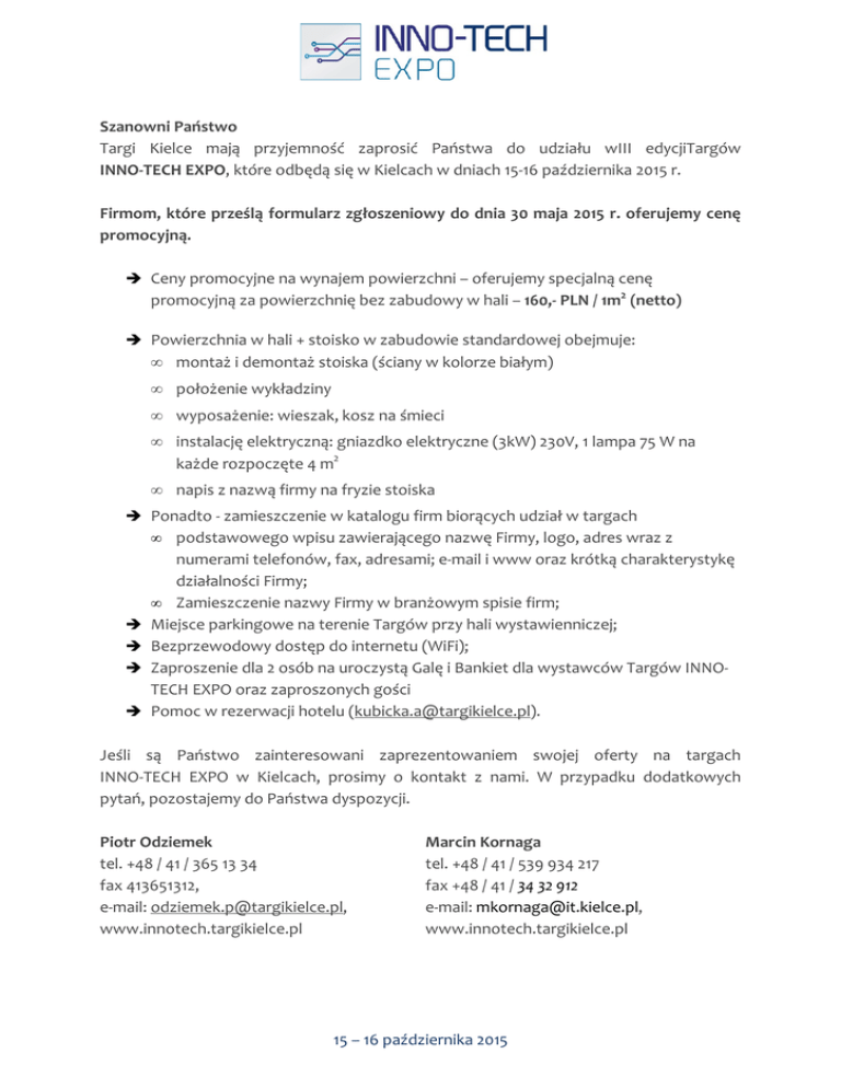 Szanowni Państwo Targi Kielce mają przyjemność zaprosić Państwa do udziału wIII edycjiTargów INNO-TECH EXPO, które odbędą się w Kielcach w dniach 15-16 października 2015 r. Firmom, które prześlą formularz zgłoszeniowy do dnia 30 maja 2015 r. oferujemy cenę promocyjną. Ceny promocyjne na wynajem powierzchni – oferujemy specjalną cenę promocyjną za powierzchnię bez zabudowy w hali – 160,- PLN / 1m2 (netto) Powierzchnia w hali + stoisko w zabudowie standardowej obejmuje: • montaż i demontaż stoiska (ściany w kolorze białym) • położenie wykładziny • wyposażenie: wieszak, kosz na śmieci • instalację elektryczną: gniazdko elektryczne (3kW) 230V, 1 lampa 75 W na każde rozpoczęte 4 m2 • napis z nazwą firmy na fryzie stoiska Ponadto - zamieszczenie w katalogu firm biorących udział w targach • podstawowego wpisu zawierającego nazwę Firmy, logo, adres wraz z numerami telefonów, fax, adresami; e-mail i www oraz krótką charakterystykę działalności Firmy; • Zamieszczenie nazwy Firmy w branżowym spisie firm; Miejsce parkingowe na terenie Targów przy hali wystawienniczej; Bezprzewodowy dostęp do internetu (WiFi); Zaproszenie dla 2 osób na uroczystą Galę i Bankiet dla wystawców Targów INNOTECH EXPO oraz zaproszonych gości Pomoc w rezerwacji hotelu ([email protected]). Jeśli są Państwo zainteresowani zaprezentowaniem swojej oferty na targach INNO-TECH EXPO w Kielcach, prosimy o kontakt z nami. W przypadku dodatkowych pytań, pozostajemy do Państwa dyspozycji. Piotr Odziemek tel. +48 / 41 / 365 13 34 fax 413651312, e-mail: [email protected], www.innotech.targikielce.pl Marcin Kornaga tel. +48 / 41 / 539 934 217 fax +48 / 41 / 34 32 912 e-mail: [email protected], www.innotech.targikielce.pl 15 – 16 października 2015 Przykład stoiska narożnego w zabudowie standardowej i wyposażeniem dodatkowym. m2 Rodzaj powierzchni Cena promocyjna netto Pakiet powierzchnia w pawilonie + stoisko w zabudowie standardowej wraz z wyposażeniem: 1 stół, 4 krzesła, + opłata rejestracyjna 9 2600,- PLN 12 3.290,- PLN 18 4.670,- PLN 20 5.130,- PLN 24 6.050- PLN Przykładowe stoisko: 12 m2 "powierzchnia + stoisko w zabudowie standardowej" na warunkach specjalnych Opłata rejestracyjna 300 zł Powierzchnia wystawiennicza 12 m2 * 160 zł = 1.920 zł Zabudowa standardowa 12 m2 * 70 zł = 840 zł Krzesła tapicerowane 4 * 40 zł = 160 zł Stół okrągły 70 zł Suma (ceny netto) 3.290zł 15 – 16 października 2015 15 – 16 października 2015