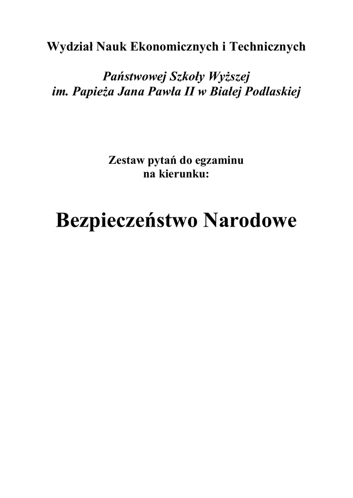 Wydział Nauk Ekonomicznych i Technicznych Państwowej Szkoły Wyższej im. Papieża Jana Pawła II w Białej Podlaskiej Zestaw pytań do egzaminu na kierunku: Bezpieczeństwo Narodowe Przedmioty ogólne i kierunkowe: 1. Definicja i główne zadania sił zbrojnych. 2. Funkcje i modele sił zbrojnych. 3. Typy, rodzaje i cele sojuszy wojskowych. 4. Definicja i przykład sojuszu wojskowego. 5. Strategia Bezpieczeństwa Narodowego Rzeczypospolitej Polskiej 2013. 6. Przyczyny konfliktów zbrojnych. 7. Wojna rosyjsko-Gruzińska 2008. 8. Rodzaje broni masowego rażenia. 9. „ Arabska Wiosna” i jej konsekwencje. 10. Przyczyny i skutki wojny w Korei 1950-1953. 11. „Zwykłe dane osobowe” w ochronie danych osobowych. 12. Rodzaje kontroli realizowanych przez Generalnego Inspektora Ochrony Danych Osobowych. 13. Akty prawne normujące ochronę danych osobowych i informacji niejawnych. 14. Instytucje powołane do prowadzenia nadzoru epidemiologicznego w Polsce. 15. Zadania i uprawnienia związane z kontrolą obiektu przez Państwowego Inspektora Sanitarnego. 16. Definicja, rodzaje i charakterystyka klęsk żywiołowych. 17. Procedury działań służb ratowniczych w wypadku masowym. 18. Definicja i rodzaje terroryzmu. 19. Definicje: bezpieczeństwo narodowe, system bezpieczeństwa narodowego, zarządzanie kryzysowe. 20. Czynniki kształtujące politykę bezpieczeństwa państwa. 21. Wpływ istnienia broni jądrowej na bezpieczeństwo międzynarodowe. 22. Relacje między polityką a strategią. 23. Trójpodział władzy Rzeczypospolitej Polskiej. 24. Kontrola a nadzór – podobieństwa i różnice. 25. Rodzaje i typy kontroli. 26. Postępowanie kontrolno-nadzorcze. 27. Zagrożenia wewnętrzne bezpieczeństwa publicznego Rzeczypospolitej Polskiej. 28. Strategia bezpieczeństwa wewnętrznego Unii Europejskiej. 29. Rodzaje i struktura organizacyjna Sił Zbrojnych Rzeczypospolitej Polskiej w 2014 roku. 30. Definicja, rodzaje i zadania operacji pokojowych. 31. Zagrożenia bezpieczeństwa Rzeczypospolitej Polskiej drugiej dekady XXI wieku. 32. Ochrona prawa autorskiego. 33. Stan wojenny, a stan wyjątkowy – podobieństwa i różnice. 34. Główne zadania i organizacja Sojuszu Północnoatlantyckiego. 35. Przedmiot badań w bezpieczeństwie narodowym. 36. Metody badań systemu bezpieczeństwa narodowego. 37. Akty prawne dotyczących bezpieczeństwa narodowego RP. 38. Rodzaje bezpieczeństwa. 39. Zagrożenia cywilizacyjne bezpieczeństwa narodowego RP. 40. Obszary działań Europol, Eurojust i Frontex’u. 41. Model systemu bezpieczeństwa narodowego. 42. Systemy wsparcia bezpieczeństwa państwa. 43. Definicja, i części składowe infrastruktury krytycznej. 44. Fazy reagowania kryzysowego. 45. Przyczyny upadku I Rzeczypospolitej i rozbiorów Polski. 46. Wpływ powstań zbrojnych z lat 1794-1863 na bezpieczeństwo narodowe Polaków. 47. Znaczenie Bitwy Warszawskiej 1920 r. dla bezpieczeństwa Polski i Europy. 48. Powstanie państwa w doktrynach prawa międzynarodowego. 49. Skład i adresaci normy prawnej. 50. Podstawa stosunków cywilnoprawnych. Przedmioty specjalnościowe: Zarządzanie Kryzysowe: 1. Rodzaje oraz formy ochrony osób i mienia. 2. Obowiązkowa ochrona obszarów, obiektów, urządzeń i transportu. 3. Akty prawne normujące opracowanie planu ochrony. 4. Struktura i zadania filozofii bezpieczeństwa. 5. Wpływ na zagrożenie bezpieczeństwa państwa zmian demograficznych w Polsce. 6. Czynniki mające wpływ na zagrożenia terroryzmem w Polsce. 7. Krajowy Plan Zarządzania Kryzysowego. 8. Zagrożenia bezpieczeństwa państwa wynikające z masowych migracji. 9. Specyfika i przykłady cyberterroryzmu. 10. Zadania zarządzania kryzysowego w Polsce. 11. Struktura systemu kierowania zarządzaniem kryzysowym w Polsce. 12. Organizacja zarządzania kryzysowego na szczeblu wojewódzkim. 13. Organizacja zarządzania kryzysowego na szczeblu powiatowym. 14. Siły Zbrojne RP w zarządzaniu kryzysowym. 15. Organizacja Systemu Ratowniczo-Gaśniczego. 16. Rola i zadania mediów w zarządzaniu kryzysowym. 17. Główne cele działań w przypadku prowadzenia operacji w sytuacji kryzysowej. 18. Zasady wprowadzania wyjątkowego. 19. Zasady powołania komisarza rządowego. 20. Użycie Sił Zbrojnych RP w stanie wyjątkowym. Bezpieczeństwo w środowisku wodnym: 1. Podstawowe akty prawne regulujące zasady wykorzystania i ochrony zasobów oraz akwenów wodnych w Polsce. 2. Kataster wodny. 3. Pozwolenia wodnoprawne. 4. Sygnały wzywania pomocy na wodach śródlądowych w nocy. 5. Znak kardynalny. 6. Obowiązki ratownika. 7. Oznaczenia ochronne na kąpieliskach. 8. Ratownictwo w kąpieliskach zlokalizowanych nad morzem. 9. Powiadamianie Morskiej Służby Poszukiwawczo Ratowniczej SAR. 10. Wychładzanie organizmu w wodzie. 11. Zastosowanie ciśnieniomierza (manometru) 12. Podstawy nurkowania. 13. Zasady wydostania się nurka z silnego prądu wodnego. 14. Znaki ostrzegawcze dla płetwonurków nurkujących rekreacyjnie. 15. Uraz ciśnieniowy płuc. 16. Postępowanie w przypadku wystąpienia objawów zatoru powietrznego. 17. Zachowania nurka w razie niebezpieczeństwa podczas wynurzania. 18. Postępowanie podczas narkozy azotowej. 19. Choroba dekompresyjna. 20. Prędkość wynurzania, przy korzystaniu z tabel nurkowych.