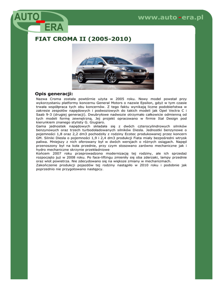 www.auto - era.pl FIAT CROMA II (2005-2010) Opis generacji: Nazwa Croma została powtórnie użyta w 2005 roku. Nowy model powstał przy wykorzystaniu platformy koncernu General Motors o nazwie Epsilon, gdyż w tym czasie trwała współpraca tych obu koncernów. Z tego faktu wynikają liczne podobieństwa w zakresie zespołów napędowych i podwoziowych do takich modeli jak Opel Vectra C i Saab 9-3 (drugiej generacji). Dwubryłowe nadwozie otrzymało całkowicie odmienną od tych modeli formę zewnętrzną. Jej projekt opracowano w firmie Ital Design pod kierunkiem znanego stylisty G. Giugiaro. Gama jednostek napędowych składała się z dwóch czterocylindrowych silników benzynowych oraz trzech turbodoładowanych silników Diesla. Jednostki benzynowe o pojemności 1,8 oraz 2,2 dm3 pochodziły z rodziny Ecotec produkowanej przez koncern GM. Silniki Diesla o pojemności 1,9 i 2,4 dm3 produkcji Fiata miały bezpośredni wtrysk paliwa. Mniejszy z nich oferowany był w dwóch wersjach o różnych osiągach. Napęd przenoszony był na koła przednie, przy czym stosowano zarówno mechaniczne jak i hydro mechaniczne skrzynie przekładniowe Końcem 2007 roku przeprowadzono modernizację tej rodziny, ale ich sprzedaż rozpoczęto już w 2008 roku. Po face-liftingu zmieniły się oba zderzaki, lampy przednie oraz wlot powietrza. Nie zdecydowano się na większe zmiany w mechanizmach. Zakończenie produkcji pojazdów tej rodziny nastąpiło w 2010 roku i podobnie jak poprzednio nie przygotowano następcy.