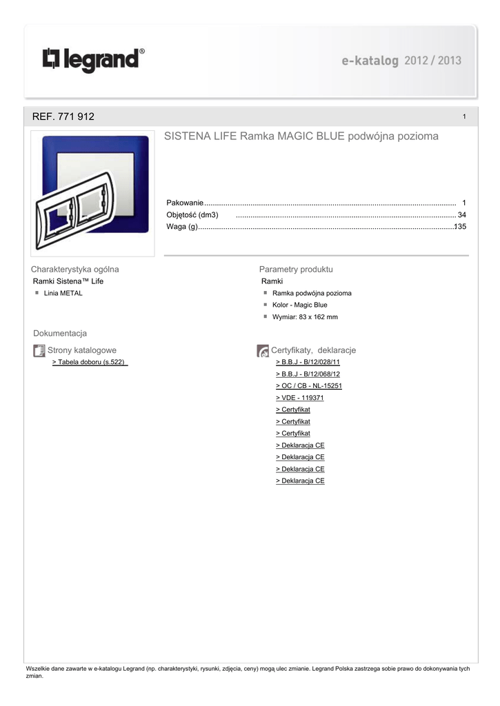 REF. 771 912 1 SISTENA LIFE Ramka MAGIC BLUE podwójna pozioma Pakowanie .......................................................................................................................................... 1 Objętość (dm3) .......................................................................................................................................... 34 Waga (g) .......................................................................................................................................... 135 Charakterystyka ogólna Parametry produktu Ramki Sistena™ Life Ramki Linia METAL Ramka podwójna pozioma Kolor - Magic Blue Wymiar: 83 x 162 mm Dokumentacja Strony katalogowe > Tabela doboru (s.522) Certyfikaty, deklaracje > B.B.J - B/12/028/11 > B.B.J - B/12/068/12 > OC / CB - NL-15251 > VDE - 119371 > Certyfikat > Certyfikat > Certyfikat > Deklaracja CE > Deklaracja CE > Deklaracja CE > Deklaracja CE Wszelkie dane zawarte w e-katalogu Legrand (np. charakterystyki, rysunki, zdjęcia, ceny) mogą ulec zmianie. Legrand Polska zastrzega sobie prawo do dokonywania tych zmian.