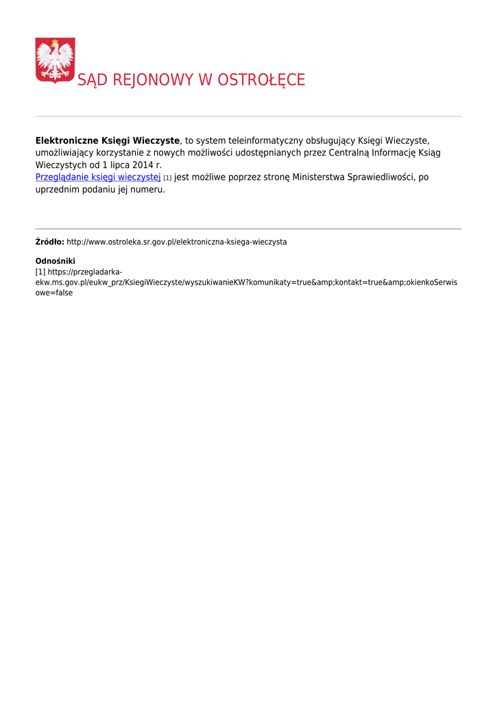 SĄD REJONOWY W OSTROŁĘCE Elektroniczne Księgi Wieczyste, to system teleinformatyczny obsługujący Księgi Wieczyste, umożliwiający korzystanie z nowych możliwości udostępnianych przez Centralną Informację Ksiąg Wieczystych od 1 lipca 2014 r. Przeglądanie księgi wieczystej [1] jest możliwe poprzez stronę Ministerstwa Sprawiedliwości, po uprzednim podaniu jej numeru. Źródło: http://www.ostroleka.sr.gov.pl/elektroniczna-ksiega-wieczysta Odnośniki [1] https://przegladarkaekw.ms.gov.pl/eukw_prz/KsiegiWieczyste/wyszukiwanieKW?komunikaty=true&kontakt=true&okienkoSerwis owe=false