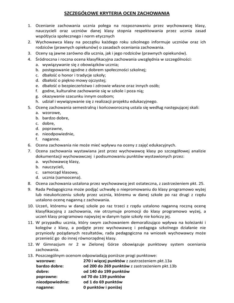SZCZEGÓŁOWE KRYTERIA OCEN ZACHOWANIA 1. Ocenianie zachowania ucznia polega na rozpoznawaniu przez wychowawcę klasy, nauczycieli oraz uczniów danej klasy stopnia respektowania przez ucznia zasad współżycia społecznego i norm etycznych 2. Wychowawca klasy na początku każdego roku szkolnego informuje uczniów oraz ich rodziców (prawnych opiekunów) o zasadach oceniania zachowania. 3. Oceny są jawne zarówno dla ucznia, jak i jego rodziców (prawnych opiekunów). 4. Śródroczna i roczna ocena klasyfikacyjna zachowania uwzględnia w szczególności: a. wywiązywanie się z obowiązków ucznia; b. postępowanie zgodne z dobrem społeczności szkolnej; c. dbałośd o honor i tradycje szkoły; d. dbałośd o piękno mowy ojczystej; e. dbałośd o bezpieczeostwo i zdrowie własne oraz innych osób; f. godne, kulturalne zachowanie się w szkole i poza nią; g. okazywanie szacunku innym osobom; h. udział i wywiązywanie się z realizacji projektu edukacyjnego. 5. Ocenę zachowania semestralną i koocoworoczną ustala się według następującej skali: a. wzorowe, b. bardzo dobre, c. dobre, d. poprawne, e. nieodpowiednie, f. naganne. 6. Ocena zachowania nie może mied wpływu na oceny z zajęd edukacyjnych. 7. Ocena zachowania wystawiana jest przez wychowawcę klasy po szczegółowej analizie dokumentacji wychowawczej i podsumowaniu punktów wystawionych przez: a. wychowawcę klasy, b. nauczycieli, c. samorząd klasowy, d. ucznia (samoocena). 8. Ocena zachowania ustalona przez wychowawcę jest ostateczna, z zastrzeżeniem pkt. 25. 9. Rada Pedagogiczna może podjąd uchwałę o niepromowaniu do klasy programowo wyżej lub nieukooczeniu szkoły przez ucznia, któremu w danej szkole po raz drugi z rzędu ustalono ocenę naganną z zachowania. 10. Uczeo, któremu w danej szkole po raz trzeci z rzędu ustalono naganną roczną ocenę klasyfikacyjną z zachowania, nie otrzymuje promocji do klasy programowo wyżej, a uczeo klasy programowo najwyżej w danym typie szkoły nie kooczy jej. 11. W przypadku ucznia, który swym zachowaniem demoralizująco wpływa na koleżanki i kolegów z klasy, a podjęte przez wychowawcę i pedagoga szkolnego działanie nie przyniosły pożądanych rezultatów, rada pedagogiczna na wniosek wychowawcy może przenieśd go do innej równorzędnej klasy. 12. W Gimnazjum nr 2 w Zielonej Górze obowiązuje punktowy system oceniania zachowania. 13. Poszczególnym ocenom odpowiadają poniższe progi punktowe: wzorowe: 270 i więcej punktów z zastrzeżeniem pkt.13a bardzo dobre: od 200 do 269 punktów z zastrzeżeniem pkt.13b dobre: od 140 do 199 punktów poprawne: od 70 do 139 punktów nieodpowiednie: od 1 do 69 punktów naganne: 0 punktów i poniżej 13a. Uczeo, który uzyskał ponad 270 punktów w tym minus 30 pkt. za uwagi, nie może otrzymad oceny wzorowej. 13b. Uczeo, który zgłosił się do realizacji projektu edukacyjnego, ale w nim nie uczestniczył, nie może otrzymad oceny wzorowej, pomimo uzyskanej odpowiedniej liczby punktów. 13c. Uczeo, który uzyskał ilośd punktów odpowiadającą ocenie bardzo dobrej, w tym minus 50 pkt. za uwagi, nie może otrzymad oceny bardzo dobrej. 14. Na początku każdego semestru każdy uczeo otrzymuje kredyt 100 punktów. 15. Ocenę zachowania wystawia wychowawca klasy: a. śródroczną po podliczeniu wszystkich punktów zgodnie z pkt. 7, b. roczną po podliczeniu wszystkich punktów za drugi semestr i obliczeniu średniej arytmetycznej z punktów za I i II semestr. 16. Na koniec każdego semestru wychowawca oraz nauczyciele uczący w danej klasie przyznają uczniom punkty za postawę na lekcji oraz wywiązywanie się z obowiązków szkolnych. Uczeo może otrzymad od 0 do 50 pkt. (50, 40, 30, 20, 10, 0). Z punktów przyznanych przez poszczególnych nauczycieli uczących w danej klasie wychowawca ustala średnią arytmetyczną. 17. Za udział i realizację projektu edukacyjnego a. ocena z projektu edukacyjnego ma wpływ na ocenę koocoworoczną z zachowania w tym roku szkolnym, w którym projekt był realizowany; b. punkty za udział i realizację projektu edukacyjnego przyznaje nauczyciel – opiekun projektu według następujących kryteriów: – 50 punktów jeżeli podczas realizacji projektu wykazał się: dużą samodzielnością i innowacyjnością, umiejętnością pracy zespołowej, terminowością składania sprawozdao z realizacji działao, aktywnością podczas zebrao konsultacyjnych. – 40 punktów jeżeli: pełnił aktywną rolę podczas realizacji projektu gimnazjalnego, wspomagał członków zespołu, w terminie składał sprawozdania z realizacji działao. – 30 punktów jeżeli: prawidłowo wypełniał swoje zadania, współpracował z zespołem, pozytywnie reagował na uwagi zespołu i opiekuna. – 10 punktów jeżeli: wypełniał swoje obowiązki w trakcie realizacji projektu gimnazjalnego, lecz zdarzało mu się nie wywiązad z przyjętych zadao, co było przyczyną opóźnieo lub konfliktów w zespole. – ( – 20) punktów jeżeli: często zaniedbywał swoje obowiązki podczas realizacji projektu gimnazjalnego lub odmawiał współpracy, co miało wpływ na przebieg przyjętego przez zespół harmonogramu pracy i wiązało się ze zwiększeniem obowiązków innych członków zespołu projektowego. – ( – 30) punktów jeżeli: nie przystąpił do realizacji projektu lub nie wywiązywał się ze swoich obowiązków mimo rozmów z członkami zespołu i opiekunem projektu, a jego postawa była lekceważąca zarówno w stosunku do członków zespołu, jak i opiekuna. c. uczeo, który uzyskał liczbę punktów odpowiadającą ocenie bardzo dobrej lub wzorowej, jednak nie uczestniczył w projekcie edukacyjnym, nie może otrzymad odpowiednio – oceny bardzo dobrej lub wzorowej. 18. Za godziny nieusprawiedliwione uczeo może otrzymad: a. od 1 do 5 godzin nieusprawiedliwionych: minus 10 punktów; b. od 6 do 15 godzin nieusprawiedliwionych: minus 20 punktów; c. od 16 do 25 godzin nieusprawiedliwionych: mi