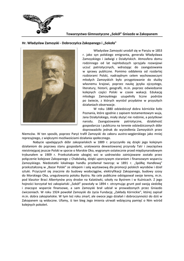 Towarzystwo Gimnastyczne „Sokół” Gniazdo w Zakopanem Hr. Władysław Zamoyski - Dobroczyńca Zakopanego i „Sokoła" Władysław Zamoyski urodził się w Paryżu w 1853 r. jako syn polskiego emigranta, generała Władysława Zamoyskiego i Jadwigi z Działyńskich. Atmosfera domu rodzinnego od lat najmłodszych sprzyjała rozwojowi uczuć patriotycznych, wdrażając do zaangażowania w sprawy publiczne. Pomimo oddalenia od rozdartej rozbiorami Polski, nadrzędnym celem wychowawczyni młodych Zamoyskich było przygotowanie do służby własnemu krajowi, poprzez naukę języka ojczystego, literatury, historii, geografii, m.in. poprzez odwiedzanie kolejnych części Polski w czasie wakacji. Edukację młodego Zamoyskiego uzupełniły liczne podróże po świecie, z których wyniósł przydatne w przyszłych działaniach obserwacje. W roku 1880 odziedziczył dobra kórnickie koło Poznania, które zgodnie z zapisem testamentowym wuja, Jana Działyńskiego, miały służyć nie rodzinie, a pożytkowi narodu. Zaangażowanie patriotyczne, działalność gospodarcza i publiczna na terenie odziedziczonych dóbr doprowadziło jednak do wysiedlenia Zamoyskich przez Niemców. W ten sposób, poprzez Paryż trafił Zamoyski do zaboru austro-węgierskiego jako mniej represyjnego, z większymi możliwościami działania społecznego. Nabycie upadających dóbr zakopiańskich w 1889 r. przyczyniło się dzięki jego kolejnym działaniom do poprawy stanu gospodarki, uratowania dewastowanej przyrody Tatr i zwycięstwa nieistniejącej jeszcze Polski w sporze o Morskie Oko, wygranym ostatecznie przed międzynarodowym trybunałem w 1909 r. Przekształcanie ubogiej wsi w uzdrowisko zainicjowane zostało przez połączenie kolejowe Zakopanego z Chabówką, dzięki uporczywym staraniom i finansowym wsparciu Zamoyskiego. Niedostatki lokalnego handlu przełamał tworząc w 1891 r. „Spółkę Handlową" przekształconą w „Bazar Polski" ze sklepem i salą wystawową dla promocji polskich wyrobów i dzieł sztuki. Przyczynił się znacznie do budowy wodociągów, elektryfikacji Zakopanego, budowy szosy do Morskiego Oka, uregulowania potoku Bystra. Na cele publiczne odstępował swoje tereny, m.in. pod klasztor Braci Albertynów przy drodze na Kalatówki, szkoły na Bystrem i w Kuźnicach. Z jego hojności korzystał też zakopiański „Sokół" powstały w 1894 r. otrzymując grunt pod swoją siedzibę i znaczące wsparcie finansowe, a sam Zamoyski brał udział w prowadzonych przez Gniazdo ćwiczeniach. W roku 1924 powołał Zamoyski do życia Fundację „Zakłady Kórnickie", której zapisał m.in. dobra zakopiańskie. W tym też roku zmarł, ale owoce jego działań i dobroczynności do dziś w Zakopanem są widoczne. Ufamy, iż ten bieg Jego imienia utrwali wdzięczną pamięć o Nim wśród kolejnych pokoleń. Towarzystwo Gimnastyczne „Sokół” Gniazdo w Zakopanem Franciszek Marduła - Druh, naczelnik, prezes, prezes honorowy Druh Franciszek Marduła całym swym długim życiem, bez względu na przeciwności życiowe, dał przykład zaangażowania w pracę i działalność społeczną. Urodził się w 1909 r. w Poroninie jako syn Józefa Marduły-„Gała” i Ludwiki z Gutów-Mostowych. Jego ojcem chrzestnym został wybitny poeta Jan Kasprowicz, naówczas mieszkający u Mardułów. Wierny rodzinnej tradycji poświęcił się stylowemu meblarstwu artystycznemu, a zamiłowanie do precyzji wykorzystał w lutnictwie. Drugą pasją okazał się sport. Od roku 1926 należał do „Sokoła", wielokrotnie reprezentując w zawodach zakopiańskie Gniazdo. Do wybuchu wojny 14. krotnie startował w mistrzostwach Polski w skokach narciarskich, biegach, zjeździe, we Wszechsłowiańskich Zawodach Sokolich w Czechosłowacji, a w 1939 r. w zawodach FIS w Zakopanem - w biegach na 18 i 50 km. W 1940 r. miał startować na igrzyskach olimpijskich. Poza ćwiczeniem własnej sprawności, trenował również młodzież i z tego powodu w roku 1937 został naczelnikiem zakopiańskiego Gniazda „Sokoła". Czas wojny spędził w niewoli niemieckiej w stalagach w Muchlebergu i Elsterhorst. Po wojnie łączył twórczość lutniczą z pracą pedagogiczną w dziale lutniczym Państwowego Liceum Technik Plastycznych (późniejsze PLSP im. A. Kenara) i nowotarskim Technikum Budownictwa Instrumentów Lutniczych. W pracy pedagogicznej po mistrzowsku przekazywał swoje umiejętności młodzieży. Jego talent, skromność i zaangażowanie w pracy zaskarbiły mu szacunek i trwałą wdzięczność uczniów. Swoją twórczość lutniczą prezentował na wielu konkursach krajowych i międzynarodowych zdobywając liczne nagrody. Spod jego rąk wyszło około 650 instrumentów. Po wojnie, niejako z marszu, włączył się w działalność sportową - ćwiczenia i reaktywowanie zakopiańskiego Gniazda „Sokoła". W roku 1947 r. Towarzystwo Gimnastyczne zostało przez ówczesne władze zlikwidowane w całej Polsce. Druh Franciszek podjął próbę kontynuowania pasji sportowej w Harcerskim Klubie Narciarskim, lecz po dwóch latach również patriotyczne harcerstwo zostało zlikwidowane. Kolejną sportową przystanią okazał się Akademicki Związek Sportowy. W roku 1990 wraz z seniorami zakopiańskiego „Sokoła" reaktywował Gniazdo i pełnił funkcję jego prezesa, a następnie został prezesem honorowym. Zmarł w roku 2007, wkrótce po wyborze jego syna Stanisława na prezesa Gniazda, a ciągłość tradycji stanowi sokolą sztafetę pokoleń.