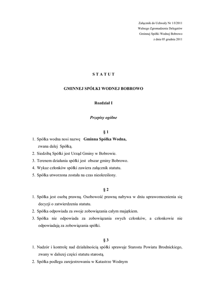 S T A T U T GMINNEJ SPÓŁKI WODNEJ BOBROWO Rozdział I