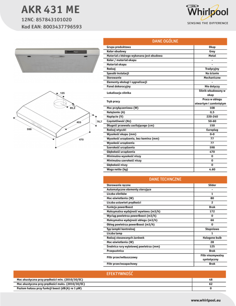 AKR 431 ME 12NC: 857843101020 Kod EAN: 8003437796593 DANE OGÓLNE Grupa produktowa Okap Kolor obudowy Grey Materiał z którego wykonana jest obudowa Metal Kolor / materiał okapu - Materiał okapu - Rodzaj Tradycyjny Sposób instalacji Na ścianie Sterowanie Mechaniczne Elementy obsługi i sygnalizacji - Panel dekoracyjny Nie dotyczy Lokalizacja silnika Silnik wbudowany w okap Praca w obiegu otwartym i zamkniętym Tryb pracy Moc przyłączeniowa (W) 108 Natężenie (A) 0,5 Napięcie (V) 220-240 Częstotliwość (Hz) 50-60 Długość przewodu zasilającego (cm) Rodzaj wtyczki 150 Europlug Wysokość okapu (mm) 0-0 Wysokość urządzenia, bez komina (mm) 77 Wysokość urządzenia 77 Szerokość urządzenia 598 Głębokość urządzenia 470 Minimalna wysokość niszy 0 Minimalna szerokość niszy 0 Głębokość niszy 0 Waga netto (kg) 4.60 DANE TECHNCZNE Sterowanie ręczne Slider Automatyczne elementy sterujące - Liczba silników 1 Moc oświetlenia (W) 80 Liczba ustawień prędkości 2 Funkcja powerBoost Brak Maksymalna wydajność wywiewu (m3/h) 172 Wyciąg powietrza powerBoost (m3/h) 0 Maksymalna wydajność obiegu (m3/h) 66 Obieg powietrza powerBoost (m3/h) Typ lampki kontrolnej Liczba lamp Rodzaj stosowanych żarówek 0 Stopniowo 1 Halogene bulb Moc oświetlenia (W) 28 Średnica rury wylotowej powietrza (mm) 125 Przepustnica Brak Filtr przeciwtłuszczowy Filtr niezmywalny syntetyczny Filtr przeciwzapachowy Brak EFEK EFEKTT YWNOŚĆ Moc akustyczna przy prędkości min. (2010/30/EC) 48 Moc akustyczna przy prędkości maks. (2010/30/EC) 62 Poziom hałasu przy funkcji boost (dB(A) re 1 pW) 0 www.whirlpool.eu