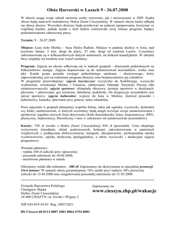 Obóz Harcerski w Łazach 9 - 26.07.2008 W obozie mogą wziąć udział zarówno osoby zrzeszone, jak i niezrzeszone w ZHP. Kadrę obozu będą stanowili instruktorzy Hufca Ziemi Cieszyńskiej. W ramach obozu hufca odbędą się obozy drużyn. Wszystkie drużyny będą przebywać na jednym zgrupowaniu, korzystać ze wspólnej kuchni, jednak każda z nich będzie realizowała swój własny program, będący podsumowaniem całorocznej pracy. Termin: 9 – 26.07.2008 Miejsce: Łazy koło Mielna – baza Hufca Radom. Miejsce w pięknej okolicy w lesie, nad jeziorem Jamno, 5 min. drogi do plaży, 25 min. drogi od centrum Łazów. Uczestnicy zakwaterowani są w kilkuosobowych dużych namiotach, na łóżkach kanadyjkach. W obrębie bazy znajduje się kuchnia oraz węzeł sanitarny. Program: Zajęcia na obozie odbywają się w małych grupach - drużynach podzielonych na kilkuosobowe zastępy. Zajęcia dopasowane są do zainteresowań uczestników, wieku oraz płci. Każda grupa posiada swojego pełnoletniego opiekuna - drużynowego, który odpowiedzialny jest za codzienny program drużyny oraz bezpieczeństwo jej członków. W programie przewidujemy: zajęcia turystyczne: wycieczka do Kołobrzegu, wycieczki wybrzeżem, zwiedzanie Mielna i Unieścia, zdobywanie Odznaki Turystyki Pieszej (dla zainteresowanych); zajęcia sportowe: olimpiada obozowa, turnieje sportowe w drużynach, pływanie + plażowanie, gry terenowe, fabularne, podchody. Do dyspozycji uczestników jest sprzęt sportowy; zajęcia kulturalne: wyjście do kina w Mielnie, festiwal piosenki i kabaretowy, karaoke, śpiewanie przy gitarze, tańce irlandzkie. Poza zajęciami w grupach planujemy wspólne formy, takie jak ogniska, wycieczki, dyskoteki czy kluby zainteresowań, w których uczestnicy będą mogli rozwijać swoje zainteresowania i spróbować zupełnie nowych form aktywności (klub dziennikarski, leśny, krajoznawczy, RPG, plastyczny, budowniczy, filozoficzny i inne w zależności od zainteresowań uczestników). Koszty: 750 zł (osoba z Hufca Ziemi Cieszyńskiej) 850 zł (pozostali). Cena obejmuje wyżywienie (śniadanie, obiad, podwieczorek, kolacja), zakwaterowanie w namiotach wojskowych z podłączoną elektrycznością; transport, ubezpieczenie, profesjonalną opiekę wychowawców, opiekę medyczną (pielęgniarka), a także wycieczki i atrakcyjne zajęcia programowe. Warunki płatności: - wpłata 100 zł zaliczki przy zgłoszeniu; - pozostała należność do 30.06.2008; - możliwość płatności w ratach. Oferujemy zniżki dla rodzeństw - 200 zł! Zapraszamy do skorzystania ze specjalnej promocji First minute! W ramach oferty gwarantujemy 10% zniżki przy wpłacie 30% pierwszej zaliczki do 15.04.2008 oraz uregulowaniu pozostałej należności do 31.05.2008. Związek Harcerstwa Polskiego Chorągiew Śląska Hufiec Ziemi Cieszyńskiej 34-400 CIESZYN, ul. Żwirki i Wigury 2 NIP 634-019-54-83 Reg. 240572621 BS Cieszyn 68 8113 0007 2001 0064 4754 0001 Zapraszamy na www.cieszyn.zhp.pl/wakacje