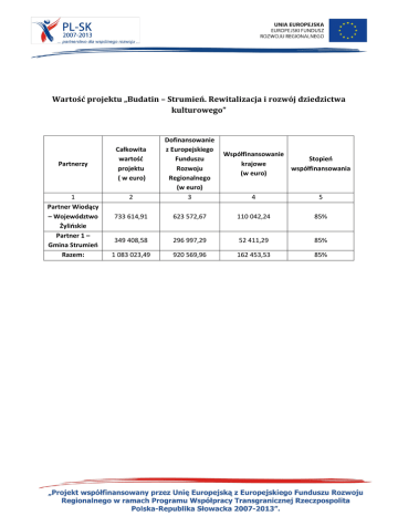 Wartość projektu „Budatin – Strumień. Rewitalizacja i rozwój dziedzictwa kulturowego” Partnerzy 1 Partner Wiodący – Województwo Żylińskie Partner 1 – Gmina Strumień Razem: 2 Dofinansowanie z Europejskiego Funduszu Rozwoju Regionalnego (w euro) 3 733 614,91 Całkowita wartość projektu ( w euro) Współfinansowanie Stopień krajowe współfinansowania (w euro) 4 5 623 572,67 110 042,24 85% 349 408,58 296 997,29 52 411,29 85% 1 083 023,49 920 569,96 162 453,53 85%