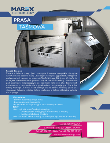 Prasa taśmowa Sposób działania Zasada działania prasy jest przejrzysta i zawiera wszystkie niezbędne w odwadnianiu osadów etapy. Osad zagęszczony w zagęszczaczu wstępnym podawany jest zsypem na taśmę do Strefy Niskiego Ciśnienia. W strefie tej osad jest równomiernie rozprowadzany na szerokości taśmy i odwadniany pod stopniowo zwiększającym się naciskiem kolejnych płyt dociskowych usytuowanych naprzemiennie z grzebieniami rozgarniającymi. Na końcu Strefy Niskiego Ciśnienia osad dostaje się do Strefy Klinowej, gdzie jest stopniowo ściskany między taśmą ruchomą a taśmą-okładziną cylindra filtracyjnego. Wyposażenie - System automatycznego mycia - Zaawansowane sterowanie - Przystawka podczyszczająca zespołu odzysku wody Zalety - Oszczędność kosztów eksploatacyjnych: – trwałość taśm filtracyjnych przedłużona 4–krotnie, – możliwość płukania filtratem; - Niezawodność i łatwa obsługa – dzięki prostej i mocnej konstrukcji. MAREX TECHNOLOGY ul. Płońska 10, 09-201 Drobin, POLAND Tel. +48 024 276 13 80 / Fax. +48 024 276 12 92 www.marextechnology.com Prasa taśmowa notatnik