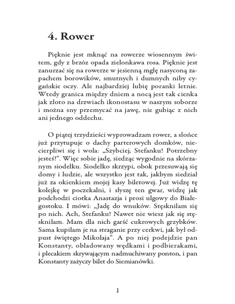 4. Rower Pięknie jest mknąć na rowerze wiosennym świtem, gdy z brzóz opada zielonkawa rosa. Pięknie jest zanurzać się na rowerze w jesienną mgłę nasyconą zapachem borowików, smutnych i dumnych niby cygańskie oczy. Ale najbardziej lubię poranki letnie. Wtedy granica między dniem a nocą jest tak cienka jak złoto na drzwiach ikonostasu w naszym soborze i można sny przemycać na jawę, nie gubiąc z nich ani jednego oddechu. O piątej trzydzieści wyprowadzam rower, a słońce już przytupuje o dachy parterowych domków, niecierpliwi się i woła: „Szybciej, Stefanku! Potrzebny jesteś!”. Więc sobie jadę, siedząc wygodnie na skórzanym siodełku. Siodełko skrzypi, obok przesuwają się domy i ludzie, ale wszystko jest tak, jakbym siedział już za okienkiem mojej kasy biletowej. Już widzę tę kolejkę w poczekalni, i słyszę ten gwar, widzę jak podchodzi ciotka Anastazja i prosi ulgowy do Białegostoku. I mówi: „Jadę do wnuków. Stęskniłam się po nich. Ach, Stefanku! Nawet nie wiesz jak się stęskniłam. Mam dla nich garść cukrowych grzybków. Sama kupiłam je na straganie przy cerkwi, jak był odpust świętego Mikołaja”. A po niej podejdzie pan Konstanty, obładowany wędkami i podbierakami, i plecakiem skrywającym nadmuchiwany ponton, i pan Konstanty zażyczy bilet do Siemianówki. 1 – Połówkę, wie pan, panie Stefanku, należy mi się, jestem na rencie – powie, ale zupełnie niepotrzebnie, bo pan Konstanty pobiera wojskową rentę od prawie czterdziestu lat, i właśnie jemu sprzedałem kiedyś swój pierwszy w życiu bilet. Była to połówka do Drohiczyna. Pamiętam dokładnie, bo nie wiedziałem wówczas gdzie leży ten Drohiczyn i już po pracy zapytałem pana naczelnika stacji, który, korzystając z pięknej pogody, spacerował z córką po peronie: – Gdzie leży Drohiczyn, panie naczelniku? – Nad Bugiem – odpowiada naczelnik, a jego córka, którą trzyma za rękę, dodaje: – Bug to jest rzeka na polsko-radzieckiej granicy. Byliśmy tam na wycieczce w ubiegłym roku. Prawda, tatusiu? – Prawda, Różyczko – przytakuje pan naczelnik i ogarnia mnie straszny wstyd, ponieważ jego córka jest ode mnie młodsza o jakieś osiem lat, a mimo to widziała miejsca, o których ja nie mam pojęcia. Pamiętam swój pierwszy sprzedany bilet również dlatego, że w tym właśnie dniu po raz pierwszy zobaczyłem Różę. Za panem Konstantym ustawi się pan Mikołaj, który od trzydziestu lat jest urzędnikiem w gminie Narewka. – To co, panie Kostku, znów na rybki – niewinnie zagadnie pan Mikołaj. 2 – A jakże. W tym tygodniu biorą szczupaki. O, takie – odrzeknie pan Konstanty i rozłoży ramiona na całą szerokość. – Panu to dobrze, a ja skończę jesienią dopiero pięćdziesiąt osiem. Daleko do emerytury. – Bardzo się cieszę. Wygląda na to, że jesteśmy rówieśnikami. Powie pan kiedy dokładnie ma pan urodziny, to wyciągnę panu ładnego karpia albo szczupaka. Wyciągnę, choćbym miał tam siedzieć nawet tydzień, co mi tam. Czasu mam od cholery, w końcu na rencie jestem, no nie? Z tą rentą pana Konstantego to była cała historia. Wczesną wiosną w tysiąc dziewięćset sześćdziesiątym ósmym roku trafił do Ludowego Wojska Polskiego. W normalnych wypadkach, gdy na świecie panuje spokój, gdy mężczyźni rankiem wychodzą do pracy, kobiety wyprawiają starsze dzieci do szkół, a potem, gdy jest ładna pogoda, z młodszymi wyprawiają się na spacer do parku, w takich przypadkach młodzi żołnierze najpierw uczą się stawać na baczność i na spocznij, potem ćwiczą lewą marsz na przykoszarowych placach. Dopiero potem kaprale i sierżanci pokazują im w jaki sposób wkłada się naboje do magazynku i jak należy trzymać kolbę karabinu, by w momencie wystrzału nie uderzała boleśnie w ramię. Właśnie tak to się wszystko odbywa w normalnych czasach. Ale marzec w sześćdziesiątym ósmym w niczym nie przypominał normalnych marcowych dni. 3 Na warszawskich ulicach demonstrowali studenci, domagali się rzeczy niepojętych zwykłemu ludowi, i ludowa władza zmuszona była użyć wszystkich sił, nawet młodych niezaprawionych w walce żołnierzy, by przywrócić ulice do jako takiego porządku. Ale nad ulicami powiewały transparenty, a w powietrzu fruwały wzniosłe hasła, niecenzuralne słowa i zwyczajne, wyrwane wprost z bruku kamienie. I jeden z takich kamieni trafił wprost w głowę młodego, szeregowego żołnierza Konstantego. Musiał być ten kamień wypuszczony do lotu ręką jakiegoś studenta filologii, bo po czterech dniach, natychmiast po odzyskaniu przytomności, żołnierz zaczął recytować wszystkie wiersze wyniesione ze szkoły podstawowej. Gdy po miesiącu choroba nie ustąpiła, a wręcz nasiliła się, co objawiało się nie tylko recytacją klasyków polskiej literatury, ale też nieudolnymi próbami wierszowania własnych przemyśleń, odesłano go do domu, przeniesiono do rezerwy i na rentę. Po jakimś czasie spokój domowego zacisza i zdrowe białowieskie powietrze zrobiły to, czego nie udało się zrobić wojskowym lekarzom. Myśli pana Konstantego wróciły na właściwe, prozaiczne tory. Szóstego dnia każdego miesiąca listonosz przynosił mu rentę, po południu pan Konstanty nabywał kilka nowych haczyków i żyłkę, wieczorem, przyświecając latarką, zbierał z trawnika tłuste i długie jak bat woźnicy rosówki. O świcie kupował bilet do Drohiczyna nad Bugiem, wsiadał do pociągu i tyle go widziano. Jedynie od czasu do czasu, gdy ludzka zawiść, która w całym świecie jest jedna4 kowa i przybiera zwykle postać dobrego obywatela, gdy zawiść ta, zatroskana losem ojczyzny kierowała pisma do właściwych urzędów, pan Konstanty zmuszony był udawać się przed oblicze komisji lekarskiej. Wchodził do gabinetu, salutował do wypłowiałej czapki, którą, po usunięciu orzełka, otrzymał na wieczną rzeczy pamiątkę od dowódcy plutonu i,