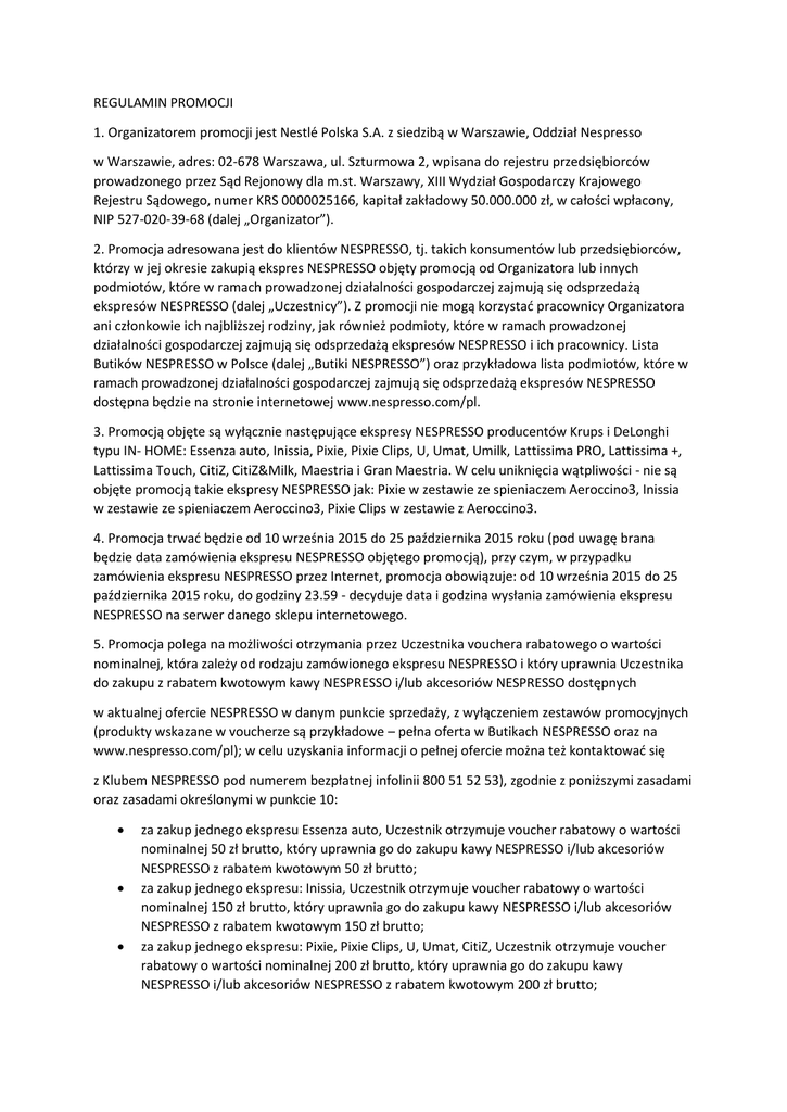 REGULAMIN PROMOCJI 1. Organizatorem promocji jest Nestlé Polska S.A. z siedzibą w Warszawie, Oddział Nespresso w Warszawie, adres: 02-678 Warszawa, ul. Szturmowa 2, wpisana do rejestru przedsiębiorców prowadzonego przez Sąd Rejonowy dla m.st. Warszawy, XIII Wydział Gospodarczy Krajowego Rejestru Sądowego, numer KRS 0000025166, kapitał zakładowy 50.000.000 zł, w całości wpłacony, NIP 527-020-39-68 (dalej „Organizator”). 2. Promocja adresowana jest do klientów NESPRESSO, tj. takich konsumentów lub przedsiębiorców, którzy w jej okresie zakupią ekspres NESPRESSO objęty promocją od Organizatora lub innych podmiotów, które w ramach prowadzonej działalności gospodarczej zajmują się odsprzedażą ekspresów NESPRESSO (dalej „Uczestnicy”). Z promocji nie mogą korzystać pracownicy Organizatora ani członkowie ich najbliższej rodziny, jak również podmioty, które w ramach prowadzonej działalności gospodarczej zajmują się odsprzedażą ekspresów NESPRESSO i ich pracownicy. Lista Butików NESPRESSO w Polsce (dalej „Butiki NESPRESSO”) oraz przykładowa lista podmiotów, które w ramach prowadzonej działalności gospodarczej zajmują się odsprzedażą ekspresów NESPRESSO dostępna będzie na stronie internetowej www.nespresso.com/pl. 3. Promocją objęte są wyłącznie następujące ekspresy NESPRESSO producentów Krups i DeLonghi typu IN- HOME: Essenza auto, Inissia, Pixie, Pixie Clips, U, Umat, Umilk, Lattissima PRO, Lattissima +, Lattissima Touch, CitiZ, CitiZ&Milk, Maestria i Gran Maestria. W celu uniknięcia wątpliwości - nie są objęte promocją takie ekspresy NESPRESSO jak: Pixie w zestawie ze spieniaczem Aeroccino3, Inissia w zestawie ze spieniaczem Aeroccino3, Pixie Clips w zestawie z Aeroccino3. 4. Promocja trwać będzie od 10 września 2015 do 25 października 2015 roku (pod uwagę brana będzie data zamówienia ekspresu NESPRESSO objętego promocją), przy czym, w przypadku zamówienia ekspresu NESPRESSO przez Internet, promocja obowiązuje: od 10 września 2015 do 25 października 2015 roku, do godziny 23.59 - decyduje data i godzina wysłania zamówienia ekspresu NESPRESSO na serwer danego sklepu internetowego. 5. Promocja polega na możliwości otrzymania przez Uczestnika vouchera rabatowego o wartości nominalnej, która zależy od rodzaju zamówionego ekspresu NESPRESSO i który uprawnia Uczestnika do zakupu z rabatem kwotowym kawy NESPRESSO i/lub akcesoriów NESPRESSO dostępnych w aktualnej ofercie NESPRESSO w danym punkcie sprzedaży, z wyłączeniem zestawów promocyjnych (produkty wskazane w voucherze są przykładowe – pełna oferta w Butikach NESPRESSO oraz na www.nespresso.com/pl); w celu uzyskania informacji o pełnej ofercie można też kontaktować się z Klubem NESPRESSO pod numerem bezpłatnej infolinii 800 51 52 53), zgodnie z poniższymi zasadami oraz zasadami określonymi w punkcie 10: za zakup jednego ekspresu Essenza auto, Uczestnik otrzymuje voucher rabatowy o wartości nominalnej 50 zł brutto, który uprawnia go do zakupu kawy NESPRESSO i/lub akcesoriów NESPRESSO z rabatem kwotowym 50 zł brutto; za zakup jednego ekspresu: Inissia, Uczestnik otrzymuje voucher rabatowy o wartości nominalnej 150 zł brutto, który uprawnia go do zakupu kawy NESPRESSO i/lub akcesoriów NESPRESSO z rabatem kwotowym 150 zł brutto; za zakup jednego ekspresu: Pixie, Pixie Clips, U, Umat, CitiZ, Uczestnik otrzymuje voucher rabatowy o wartości nominalnej 200 zł brutto, który uprawnia go do zakupu kawy NESPRESSO i/lub akcesoriów NESPRESSO z rabatem kwotowym 200 zł brutto; za zakup jednego ekspresu: CitiZ&Milk, Umilk, Lattissima PRO, Lattissima +, Lattissima Touch, Maestria, lub Gran Maestria, Uczestnik otrzymuje voucher rabatowy o wartości nominalnej 300 zł brutto, który uprawnia go do zakupu kawy NESPRESSO i/lub akcesoriów NESPRESSO z rabatem kwotowym 300 zł brutto. przez akcesoria NESPRESSO na potrzeby niniejszego regulaminu rozumie się spieniacze do mleka Aeroccino, naczynia do picia kawy, dyspensery oraz ciastka i czekoladki występujące w aktualnej ofercie NESPRESSO w Butikach NESPRESSO i sklepie internetowym na stronie www.nespresso.com/pl. 6. W celu otrzymania vouchera rabatowego, o którym mowa w punkcie 5, Uczestnik powinien zakupić w okresie promocji od Organizatora lub innych podmiotów, które w ramach prowadzonej działalności gospodarczej zajmują się odsprzedażą ekspresów NESPRESSO, ekspres NESPRESSO objęty promocją. Zamówienia na ekspresy NESPRESSO objęte promocją można składać bezpośrednio w Butikach NESPRESSO, przez telefon 800 51 52 53 albo Internet – poprzez stronę internetową www.nespresso.com/pl lub u innych podmiotów, które w ramach prowadzonej działalności gospodarczej zajmują się odsprzedażą ekspresów NESPRESSO. Do ekspresów NESPRESSO zakupionych w inny sposób niż wymienione powyżej warunki niniejszego regulaminu nie mają zastosowania. 7. Przez zakup ekspresu NESPRESSO na potrzeby niniejszego regulaminu rozumie się łącznie: złożenie zamówienia przez Uczestnika, w jeden ze sposobów, o których mowa w punkcie 6, wystawienie dokumentu potwierdzającego zakup (faktury VAT lub paragonu fiskalnego) przez Organizatora lub przez inne podmioty, które w ramach prowadzonej działalności gospodarczej zajmują się odsprzedażą ekspresów NESPRESSO i zapłata ceny danego ekspresu NESPRESSO przez Uczestnika. W przypadku płatności przelewem, zapłata ceny następuje w dacie uznania rachunku bankowego Organizatora. 8. W ramach promocji określonej w niniejszym regulaminie, do każdego zakupionego ekspresu NESPRESSO objętego promocją można otrzymać tylko jeden voucher rabatowy. Każdy voucher rabatowy należy realizować osobno, zgodnie z punktem 10 C). 9. Wydanie vouchera rabatowego, o którym mowa w punkcie 5 nastąpi w momencie zakupu ekspresu NESPRESSO objętego promocją. Voucher rabatowy można otrzymać również w Butikach Nespresso, na www.klubnespresso