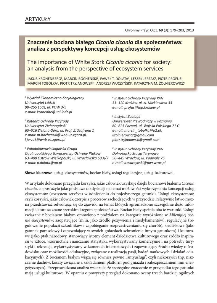 ARTYKUŁY Chrońmy Przyr. Ojcz. 69 (3): 179–203, 2013 Znaczenie bociana białego Ciconia ciconia dla społeczeństwa: analiza z perspektywy koncepcji usług ekosystemów The importance of White Stork Ciconia ciconia for society: an analysis from the perspec�ve of ecosystem services JAKUB KRONENBERG1, MARCIN BOCHEŃSKI2, PAWEŁ T. DOLATA3, LESZEK JERZAK2, PIOTR PROFUS4, MARCIN TOBÓŁKA5, PIOTR TRYJANOWSKI5, ANDRZEJ WUCZYŃSKI6, KATARZYNA M. ŻOŁNIEROWICZ5 Wydział Ekonomiczno-Socjologiczny Uniwersytet Łódzki 90–255 Łódź, ul. POW 3/5 e-mail: [email protected] 1 Instytut Ochrony Przyrody PAN 31–120 Kraków, al. A. Mickiewicza 33 e-mail: [email protected] 4 Katedra Ochrony Przyrody Uniwersytet Zielonogórski 65–516 Zielona Góra, ul. Prof. Z. Szafrana 1 e-mail: [email protected], [email protected] 5 Instytut Zoologii Uniwersytet Przyrodniczy w Poznaniu 60–625 Poznań, ul. Wojska Polskiego 71 C e-mail: [email protected], [email protected] [email protected] Południowowielkopolska Grupa Ogólnopolskiego Towarzystwa Ochrony Ptaków 63–400 Ostrów Wielkopolski, ul. Wrocławska 60 A/7 e-mail: [email protected] Instytut Ochrony Przyrody PAN Dolnośląska Stacja Terenowa 50–449 Wrocław, ul. Podwale 75 e-mail: [email protected] 2 3 6 Słowa kluczowe: usługi ekosystemów, bocian biały, usługi regulacyjne, usługi kulturowe. W artykule dokonano przeglądu korzyści, jakie człowiek uzyskuje dzięki bocianowi białemu Ciconia ciconia, co posłużyło jako podstawa do dyskusji na temat możliwości wykorzystania koncepcji usług ekosystemów (ecosystem services) w odniesieniu do pojedynczego gatunku. Usługi ekosystemów, czyli korzyści, jakie człowiek czerpie z procesów zachodzących w przyrodzie, relatywnie łatwo można przedstawiać odwołując się do zjawisk, na temat których zgromadzono szczególnie dużo informacji i które są znane szerokim kręgom społeczeństwa. Bocian biały spełnia oba te warunki. Usługi związane z bocianem białym omówiono z podziałem na kategorie wyróżnione w Milenijnej ocenie ekosystemów: zaopatrujące (m.in. jako źródło pożywienia i medykamentów), regulacyjne (regulowanie populacji szkodników i zapobieganie rozprzestrzenianiu się chorób), siedliskowe (jako gatunek parasolowy i zapewniający w swoich gniazdach schronienie innym gatunkom) i kulturowe (jako ptak narodowy, stanowiący istotny element dziedzictwa kulturowego oraz źródło inspiracji w sztuce, wzornictwie i nauczaniu statystyki, wykorzystywany komercyjnie i na potrzeby turystyki i rekreacji, wykorzystywany w kamerach internetowych i zapewniający źródło wiedzy o środowisku oraz możliwości edukacyjne, związane z realizacją pasji, badań naukowych i działań edukacyjnych). Z bocianem białym wiążą się również pewne „antyusługi”, czyli niekorzyści (np. niszczenie dachów, koszty związane z zakładaniem platform pod gniazda i zabezpieczaniem linii energetycznych). Przeprowadzona analiza wskazuje, że szczególne znaczenie w przypadku tego gatunku mają usługi kulturowe. W oparciu o powyższy przegląd dokonano oceny trzech bardziej ogólnych J. Kronenberg i in. SUMMARY Znaczenie bociana białego dla społeczeństwa Chrońmy Przyrodę Ojczystą 69 (3): 179–203, 2013 Kronenberg J., Bocheński M., Dolata P.T., Jerzak L., Profus P., Tobółka M., Tryjanowski P., Wuczyński A., Żołnierowicz K.M.: The importance of White Stork Ciconia ciconia for society: an analysis from the perspec�ve of ecosystem services The article analyses the concept of ecosystem services with reference to a single species, based on the example of White Stork Ciconia ciconia. The species has been selected because of its characteristic appearance and common recognition. Based on this example it is relatively easy to discuss the benefits that people derive from healthy, functioning ecosystems. Ecosystem services related to White Stork are discussed. They are divided into four categories and included in the Millennium Ecosystem Assessment: provisioning (e.g. as a source of food and medical products), regulating (controlling the pest populations and preventing the spread of diseases), supporting (umbrella species and opportunity for other species to use white storks’ nests), and cultural (a national bird, constituting an important element in the national heritage and a source of inspiration in the arts, design and teaching of statistics, commercially used in advertising, recreation, tourism and webcams, providing a source of information on the environment, as well as opportunities to pursue people’s passions, research and educational activities). White Storks can also be associated with disservices, such as damage to roofs, costs of platforms constructed for storks’ nests, and costs of safety measures aiming at protection of storks against threats related to power lines. The analysis of modern and historical data indicate that cultural services are of particular importance in the case of White Stork. In our discussion, we refer to three issues important in terms of understanding the ecosystem services related to White Stork: the relevance of discussion on the concept of ecosystem services with regard to a single species; the dependence of our understanding of ecosystem services from the current state of ecological knowledge; the relationship between understanding of the ecosystem services and the current state of ecological knowledge, and between our understanding of the ecosystem services and the current socio-economic trends.