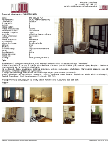 Urszula Kuszyńska tel.: (+48) 500 189 100 email: [email protected] Sprzedaż Mieszkanie - PIONIER024874 Cena: Powierzchnia: Lokalizacja: liczba pokoi: piętro: liczba pięter: rodzaj mieszkania: układ mieszkania: materiał budynku: kuchnia: rodzaj własności: czynsz: rodzaj budynku: ogrzewanie: stan mieszkania: balkon: piwnica: stan instalacji: garaż: stan łazienek: liczba łazienek: liczba wc: podłogi: Opis 240 000,00 PLN 64,00 Metr kwadratowy Szczecin 2 1 3 typowe rozkładowe cegła oddzielna;jasna;z oknem; hipoteczne 280 kamienica gazowe do odnowienia brak tak częściowo wymienione nie dobry 1 1 deski;panele;terakota; Rozkładowe 2 pokojowe mieszkanie, na I piętrze kamienicy vis a vis szczecińskiego "Monciaka". Powierzchnia 64 m2, w tym 2 pokoje, duża kuchnia z oknem, pomieszczenie gospodarcze, spory korytarz. Łazienka z wc znajduje się na zewnątrz mieszkania. Na podłogach deski, oryginalna stolarka drzwiowa, dobrze zachowane sztukaterie. Ogrzewanie gazowe, piec II obiegowy. Instalacje częściowo wymienione. Z uwagi na lokalizację, mieszkanie idealnie nadaje się na prowadzenie działalności. Klatka schodowa po kapitalnym remoncie, czysta i zadbana, nowa brama. Sąsiedztwo wielu lokali użytkowych, Deptak Bogusława, Park Kasprowicza. Czynsz ok. 280 PLN. Więcej informacji dotyczących tej oferty udzieli Państwu Ula Kuszyńska 500 189 100. Zdjęcia Dokument wygenerowany przez eKomako Makler Nieruchomości Data wydruku: 2017-03-08 14:40