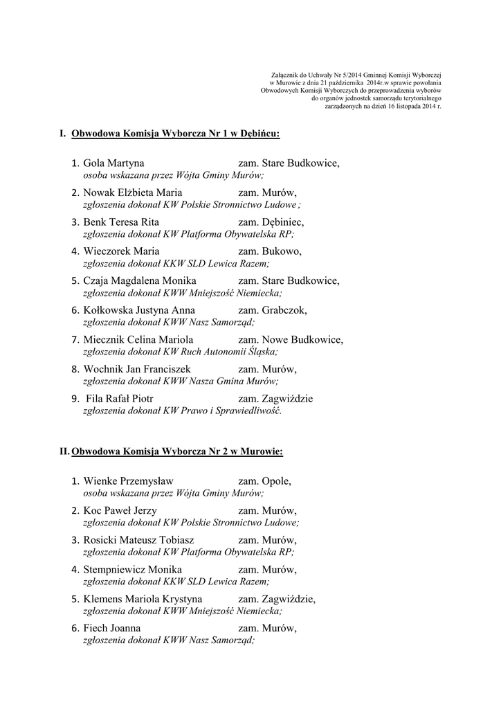 Załącznik do Uchwały Nr 5/2014 Gminnej Komisji Wyborczej w Murowie z dnia 21 października 2014r.w sprawie powołania Obwodowych Komisji Wyborczych do przeprowadzenia wyborów do organów jednostek samorządu terytorialnego zarządzonych na dzień 16 listopada 2014 r. I. Obwodowa Komisja Wyborcza Nr 1 w Dębińcu: 1. Gola Martyna zam. Stare Budkowice, osoba wskazana przez Wójta Gminy Murów; 2. Nowak Elżbieta Maria zam. Murów, zgłoszenia dokonał KW Polskie Stronnictwo Ludowe ; 3. Benk Teresa Rita zam. Dębiniec, zgłoszenia dokonał KW Platforma Obywatelska RP; 4. Wieczorek Maria zam. Bukowo, zgłoszenia dokonał KKW SLD Lewica Razem; 5. Czaja Magdalena Monika zam. Stare Budkowice, zgłoszenia dokonał KWW Mniejszość Niemiecka; 6. Kołkowska Justyna Anna zam. Grabczok, zgłoszenia dokonał KWW Nasz Samorząd; 7. Miecznik Celina Mariola zam. Nowe Budkowice, zgłoszenia dokonał KW Ruch Autonomii Śląska; 8. Wochnik Jan Franciszek zam. Murów, zgłoszenia dokonał KWW Nasza Gmina Murów; 9. Fila Rafał Piotr zam. Zagwiździe zgłoszenia dokonał KW Prawo i Sprawiedliwość. II. Obwodowa Komisja Wyborcza Nr 2 w Murowie: 1. Wienke Przemysław zam. Opole, osoba wskazana przez Wójta Gminy Murów; 2. Koc Paweł Jerzy zam. Murów, zgłoszenia dokonał KW Polskie Stronnictwo Ludowe; 3. Rosicki Mateusz Tobiasz zam. Murów, zgłoszenia dokonał KW Platforma Obywatelska RP; 4. Stempniewicz Monika zam. Murów, zgłoszenia dokonał KKW SLD Lewica Razem; 5. Klemens Mariola Krystyna zam. Zagwiździe, zgłoszenia dokonał KWW Mniejszość Niemiecka; 6. Fiech Joanna zam. Murów, zgłoszenia dokonał KWW Nasz Samorząd; 7. Nanko Edyta Maria zam. Grabczok, zgłoszenia dokonał KW Ruch Autonomii Śląska; 8. Florczak Żaneta Monika zam. Murów, zgłoszenia dokonał KWW Nasza Gmina Murów; 9. Gontarz Barbara Helena zam. Święciny, zgłoszenia dokonał KW Prawo i Sprawiedliwość. III. Obwodowa Komisja Wyborcza Nr 3 w Murowie: 1. Gwóźdź Renata zam. Murów, osoba wskazana przez Wójta Gminy Murów; 2. Rosicka Anna zam. Murów, zgłoszenia dokonał KW Polskie Stronnictwo Ludowe; 3. Hasik Marta Aleksandra zam. Murów, zgłoszenia dokonał KW Platforma Obywatelska RP; 4. Kuca Teresa zam. Murów, zgłoszenia dokonał KKW SLD Lewica Razem; 5. Raszkiewicz Maria Anna zam. Grabczok, zgłoszenia dokonał KWW Mniejszość Niemiecka; 6. Gleń Magdalena Julia zam. Grabczok, zgłoszenia dokonał KWW Nasz Samorząd; 7. Miecznik Dorota Łucja zam. Nowe Budkowice, zgłoszenia dokonał KW Ruch Autonomii Śląska; 8. Puszczewicz Dominika Marianna zam. Murów, zgłoszenia dokonał KWW Nasza Gmina Murów; 9. Cieślak Sabina Magdalena zam. Święciny, zgłoszenia dokonał KW Prawo i Sprawiedliwość. IV. Obwodowa Komisja Wyborcza Nr 4 w Zagwiździu: 1. Kiryczuk Agnieszka zam. Murów, osoba wskazana przez Wójta Gminy Murów; 2. Lasa Piotr Wojciech zam. Murów, zgłoszenia dokonał KW Polskie Stronnictwo Ludowe; 3. Klisch Joanna Maria zam. Zagwiździe, zgłoszenia dokonał KW Platforma Obywatelska RP; 4. Gowin Łukasz zam. Młodnik, zgłoszenia dokonał KKW SLD Lewica Razem; 5. Kuczera Ewa Anna zam. Zagwiździe, zgłoszenia dokonał KWW Mniejszość Niemiecka; 6. Nowicki Piotr Adam zam. Murów, zgłoszenia dokonał KWW Nasz Samorząd; 7. Gollenia Karolina Joanna zam. Zagwiździe, zgłoszenia dokonał KW Ruch Autonomii Śląska; 8. Majtyka Janina zam. Zagwiździe, zgłoszenia dokonał KWW Nasza Gmina Murów; 9. Kilijanek Izabela Ewa zam. Grabice, zgłoszenia dokonał KW Prawo i Sprawiedliwość. V. Obwodowa Komisja Wyborcza Nr 5 w Radomierowicach: 1. Scheitza Bożena zam. Dąbrówka Dolna, osoba wskazana przez Wójta Gminy Murów; 2. Lasa Grzegorz Maciej zam. Murów, zgłoszenia dokonał KW Polskie Stronnictwo Ludowe; 3. Bitner Krystyna Aniela zam. Okoły, zgłoszenia dokonał KW Platforma Obywatelska RP; 4. Gontarz Danuta zam. Święciny, zgłoszenia dokonał KKW SLD Lewica Razem; 5. Groszek Justyna Dominika zam. Bukowo, zgłoszenia dokonał KWW Mniejszość Niemiecka; 6. Stasica Ewa Elżbieta zam. Radomierowice, zgłoszenia dokonał KWW Nasz Samorząd; 7. Jeziorna Aneta Maria zam. Murów, zgłoszenia dokonał KW Ruch Autonomii Śląska; 8. Gowin Maria zam. Młodnik, zgłoszenia dokonał KWW Nasza Gmina Murów; 9. Skrzypek Iwona Małgorzata zam. Radomierowice, zgłoszenia dokonał KW Prawo i Sprawiedliwość. VI. Obwodowa Komisja Wyborcza Nr 6 w Starych Budkowicach: 1. Glados Stefania zam. Zagwiździe, osoba wskazana przez Wójta Gminy Murów; 2. Bader Małgorzata Bogusława zam. Murów, zgłoszenia dokonał KW Polskie Stronnictwo Ludowe; 3. Grądowa Eufemia zam. Stare Budkowice, zgłoszenia dokonał KW Platforma Obywatelska RP; 4. Witek Magdalena zam. Bukowo, zgłoszenia dokonał KKW SLD Lewica Razem; 5. Szichta Anna Jadwiga zam. Stare Budkowice, zgłoszenia dokonał KWW Mniejszość Niemiecka; 6. Emmerling Paweł Józef zam. Grabczok, zgłoszenia dokonał KWW Nasz Samorząd; 7. Kania Maria Elżbieta zam. Stare Budkowice, zgłoszenia dokonał KW Ruch Autonomii Śląska; 8. Paluszczak Teresa zam. Murów, zgłoszenia dokonał KWW Nasza Gmina Murów. VII. Obwodowa Komisja Wyborcza Nr 7 w Starych Budkowicach: 1. Leja Rafał zam. Dąbrówka Łubniańska, osoba wskazana przez Wójta Gminy Murów; 2. Rosicka Natalia Anna zam. Murów, zgłoszenia dokonał KW Polskie Stronnictwo Ludowe; 3. Karwat Anna Weronika zam. Stare Budkowice, zgłoszenia dokonał KW Platforma Obywatelska RP; 4. Kafka Norbert zam. Dębiniec, zgłoszenia dokonał KKW SLD Lewica Razem; 5. Jeger Krzysztof Michał zam. Kały, zgłoszenia dokonał KWW Mniejszość Niemiecka; 6. Lauer Natalia Agnieszka zam. Stare Budkowice, zgłoszenia dokonał KWW Nasz Samorząd; 7. Cebula Simone Maria zam. Stare Budkowice, zgłoszenia dokonał KW Ruch Autonomii Śląska; 8. Żędzianowski Edward Jan zam. Kały, zgłoszenia dokonał KWW Nasza Gmina Murów.