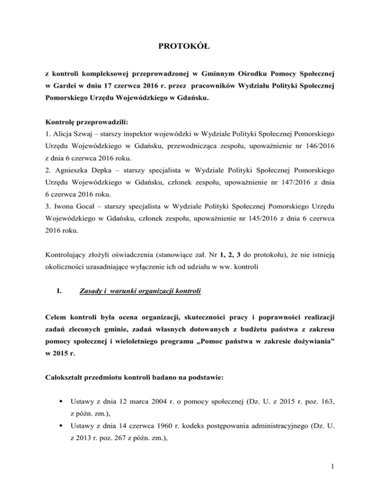 PROTOKÓŁ z kontroli kompleksowej przeprowadzonej w Gminnym Ośrodku Pomocy Społecznej w Gardei w dniu 17 czerwca 2016 r. przez pracowników Wydziału Polityki Społecznej Pomorskiego Urzędu Wojewódzkiego w Gdańsku. Kontrolę przeprowadzili: 1. Alicja Szwaj – starszy inspektor wojewódzki w Wydziale Polityki Społecznej Pomorskiego Urzędu Wojewódzkiego w Gdańsku, przewodnicząca zespołu, upoważnienie nr 146/2016 z dnia 6 czerwca 2016 roku. 2. Agnieszka Depka – starszy specjalista w Wydziale Polityki Społecznej Pomorskiego Urzędu Wojewódzkiego w Gdańsku, członek zespołu, upoważnienie nr 147/2016 z dnia 6 czerwca 2016 roku. 3. Iwona Gocał – starszy specjalista w Wydziale Polityki Społecznej Pomorskiego Urzędu Wojewódzkiego w Gdańsku, członek zespołu, upoważnienie nr 145/2016 z dnia 6 czerwca 2016 roku. Kontrolujący złożyli oświadczenia (stanowiące zał. Nr 1, 2, 3 do protokołu), że nie istnieją okoliczności uzasadniające wyłączenie ich od udziału w ww. kontroli I. Zasady i warunki organizacji kontroli Celem kontroli była ocena organizacji, skuteczności pracy i poprawności realizacji zadań zleconych gminie, zadań własnych dotowanych z budżetu państwa z zakresu pomocy społecznej i wieloletniego programu „Pomoc państwa w zakresie dożywiania” w 2015 r. Całokształt przedmiotu kontroli badano na podstawie: Ustawy z dnia 12 marca 2004 r. o pomocy społecznej (Dz. U. z 2015 r. poz. 163, z późn. zm.), Ustawy z dnia 14 czerwca 1960 r. kodeks postępowania administracyjnego (Dz. U. z 2013 r. poz. 267 z późn. zm.), 1 Ustawy z dnia 27 sierpnia 2009 r. o finansach publicznych ( Dz. U. z 2013 r. poz. 885 z późn. zm.), Ustawy z dnia 27 sierpnia 2004 r. o świadczeniach opieki zdrowotnej finansowanych ze środków publicznych (Dz. U. z 2015 r. poz. 581 z późn.zm.), Ustawa z dnia 21 listopada 2008 r. o pracownikach samorządowych (Dz. U. z 2014 r. poz. 1202 z późn. zm.), Ustawa z dnia 20 kwietnia 2004 r. o promocji zatrudnienia i instytucjach rynku pracy (Dz. U. z 2015 r., poz. 149 z późn. zm.), Rozporządzenie Ministra Pracy i Polityki Społecznej z dnia 8 czerwca 2012 r. w sprawie rodzinnego wywiadu środowiskowego (Dz. U. z 2012 r. poz. 712). Uchwała Nr 221 Rady Ministrów z dnia 10 grudnia 2013 r. w sprawie ustanowienia wieloletniego programu wspierania finansowego gmin w zakresie dożywiania „Pomoc państwa w zakresie dożywiania” na lata 2014-2020 (M.P. 2013 r. poz. 1024). Informacja o przeprowadzeniu przedmiotowej kontroli: Jednostka kontrolowana została powiadomiona o przeprowadzeniu przedmiotowej kontroli pismem z dnia 6 czerwca 2016 r., znak: PS-II.431.2.17.2016.AS (zał. nr 4), Podstawa przeprowadzenia kontroli: Upoważnienia nr 145/2016, 146/2016 i 147/2016 z dnia 6 czerwca 2016 r. (zał. nr 5,6,7) Ustalenia ogólne: Ilekroć w protokole jest mowa o: - Ośrodku – należy przez to rozumieć: Gminny Ośrodek Pomocy Społecznej w Gardei, - ustawie o pomocy społecznej – należy przez to rozumieć: ustawę z dnia 12 marca 2004 r. o pomocy społecznej (Dz. U. z 2015 r. poz. 163 z późn. zm.), - Kodeksie postępowania administracyjnego – należy przez to rozumieć: ustawę z dnia 14 czerwca 1960 r. (Dz. U. z 2013 poz. 267 z późn. zm.). - kierowniku – należy przez to rozumieć: kierownika Gminnego Ośrodka Pomocy Społecznej w Gardei, - Programie – należy przez to rozumieć: Program wieloletni „Pomoc państwa w zakresie dożywiania”. Badaniem kontrolnym objęto następujące zagadnienia: 1) ogólne ustalenia organizacyjne dotyczące Gminnego Ośrodka Pomocy Społecznej w Gardei, 2 2) zgodność zatrudnienia pracowników z wymaganymi kwalifikacjami zgodnie z art. 116 ustawy o pomocy społecznej, 3) wydatki na pomoc społeczną oraz wydatki na realizację Programu (wykorzystanie dotacji celowej z budżetu państwa) w 2015 r., 4) zasadność przyznawania świadczeń w ramach zadań własnych dotowanych z budżetu państwa, 5) poprawność realizacji wieloletniego programu „Pomoc państwa w zakresie dożywiania”, 6) prawidłowość i terminowość przeprowadzania rodzinnych wywiadów środowiskowych i rozpatrywania wniosków, 7) współpracę z podmiotami uczestniczącymi w rozwiązywaniu problemów społecznych. W toku kontroli wyjaśnień udzielała: - Bogumiła Plewka – kierownik Gminnego Ośrodka Pomocy Społecznej w Gardei. II. Ustalenia kontrolne Ad.1 Gminny Ośrodek Pomocy Społecznej w Gardei został utworzony na mocy Uchwały Nr X/48/90 Gminnej Rady Narodowej w Gardei z dnia 28 lutego 1990 r. w sprawie utworzenia Gminnego Ośrodka Pomocy Społecznej. (zał. nr 8). Statut Gminnego Ośrodka Pomocy Społecznej w Gardei został nadany jako załącznik do Uchwały Rady Gminy w Gardei Nr XV/80/95 z dnia 28 grudnia 1995 r. w sprawie uchwalenia Statutu Gminnego Ośrodka Pomocy Społecznej w Gardei. (zał. nr 9). W związku ze zmianami zachodzącymi w pomocy społecznej statut został zaktualizowany Uchwałą Nr XIII/76/2012 Rady Gminy w Gardei z dnia 25 stycznia 2012 r., w sprawie uchwalenia Statutu Gminnego Ośrodka Pomocy Społecznej w Gardei. Do statutu wprowadzono zmiany Uchwałą Nr XXXIII/187/2013 z dnia 30 grudnia 2013 roku. (zał. Nr 10). Ośrodek posiada Regulamin Organizacyjny Gminnego Ośrodka Pomocy Społecznej w Gardei, który został wprowadzony Zarządzeniem Nr 4/2012 Kierownika Gminnego Ośrodka Pomocy Społecznej w Gardei z dnia 17 września 2012 roku. Określa szczegółową organizację wewnętrzną oraz zakres działania i zadania ośrodka. (zał. nr 11). W oparciu o art. 110 ust. 7 ustawy o pomocy społecznej Wójt Gminy w Gardei Zarządzeniem Nr 76/04 z dnia 04 maja 2004 r. upoważnił Kierownika Gminnego Ośrodka 3 Pomocy Społecznej w Gardei Panią Bogumiłę Plewka do wydawania decyzji administracyjnych w indywidualnych sprawach z zakresu pomocy społecznej należących do właściwości gminy. (zał. nr 12). Na wniosek kierownika Ośrodka, Wójt Gminy Gardeja Zarządzeniem Nr 3