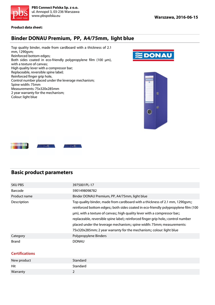 PBS Connect Polska Sp. z o.o. ul. Annopol 3, 03-236 Warszawa www.pbspolska.eu Warszawa, 2016-06-15 Product data sheet: Binder DONAU Premium, PP, A4/75mm, light blue Top quality binder, made from cardboard with a thickness of 2.1 mm, 1290gsm; Reinforced bottom edges; Both sides coated in eco-friendly polypropylene film (100 µm), with a texture of canvas; High quality lever with a compressor bar; Replaceable, reversible spine label; Reinforced finger grip hole, Control number placed under the leverage mechanism; Spine width: 75mm Measurements: 75x320x285mm 2 year warranty for the mechanism; Colour: light blue Basic product parameters SKU PBS 3975001PL-17 Barcode 5901498098782 Product name Binder DONAU Premium, PP, A4/75mm, light blue Description Top quality binder, made from cardboard with a thickness of 2.1 mm, 1290gsm;; reinforced bottom edges;; both sides coated in eco-friendly polypropylene film (100 µm), with a texture of canvas;; high quality lever with a compressor bar;; replaceable, reversible spine label;; reinforced finger grip hole,; control number placed under the leverage mechanism;; spine width: 75mm; measurements: 75x320x285mm; 2 year warranty for the mechanism;; colour: light blue Category Polypropylene Binders Brand DONAU Certifications New product Standard Hit Standard Warranty 2 PBS Connect Polska Sp. z o.o. ul. Annopol 3, 03-236 Warszawa www.pbspolska.eu Warszawa, 2016-06-15 Product data sheet cont. Binder DONAU Premium, PP, A4/75mm, light blue Basic product parameters Colour Colour Dark blue Feature Product Binder Type A4/75 Kind Coated Pockets On spine Material Cardboard/pp Reinforcement strip With reinforced edge Offer from 2013-01 Label Double sided Coating Double-sided Dimensions Weight (g/m2) 1290 Thickness (mm) 100 Cardboard (mm) 2,1 Width (mm) 75 Dimensions (mm) 75x320x285 Format A4 Procurement vocabulary CPV 30199500-5 Segregatory, pudełka na listy, pudełka do przechowywania i podobne wyroby Logistic units Unit 1 10 Unit 2 420